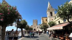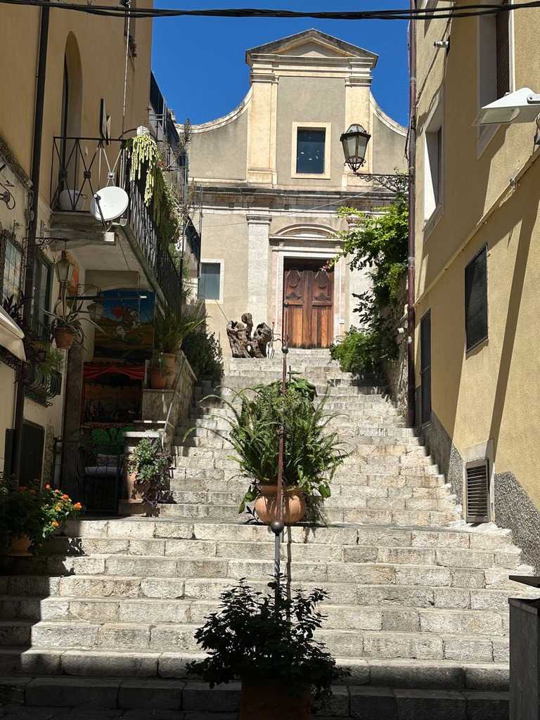 Elle attire notre attention sur les principales églises de la ville, dont la majestueuse Duomo di Taormina (ou cathédrale San Nicola), au style roman-fortifié, austère mais impressionnante. Plus loin, l’église San Giuseppe, toute baroque, tout en courbes et en légèreté, s’élève sur la Piazza IX Aprile, le cœur battant de la ville, avec sa vue à couper le souffle.