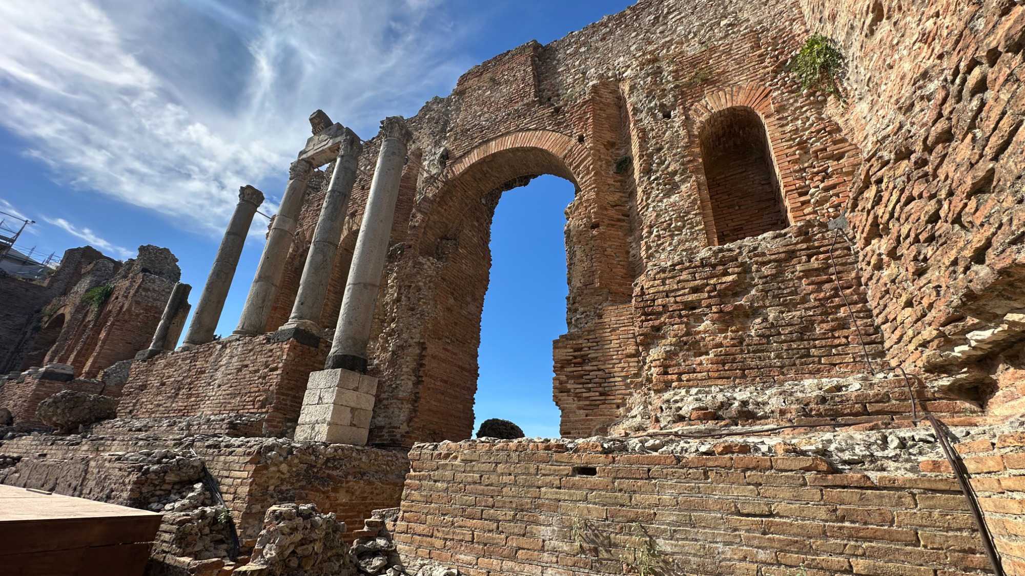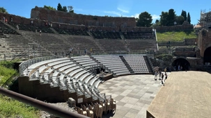 Nous commençons la visite par le joyau de la ville : le théâtre gréco-romain. Bâti par les Grecs au IIIe siècle avant J.-C., il fut ensuite agrandi par les Romains qui en ont modifié la structure pour accueillir des combats de gladiateurs et de chasse aux fauves. On y présente encore à ce jour des spectacles grandioses. Ce mélange d’architecture en fait l’un des théâtres antiques les mieux conservés du monde, et certainement l’un des plus photogéniques. Margherita nous explique que les Grecs l’avaient construit en profitant de la pente naturelle du terrain, en parfaite harmonie avec le paysage. Les Romains, eux, y ont rajouté des galeries et des colonnes pour impressionner la foule. Et ils y sont plutôt bien arrivés.