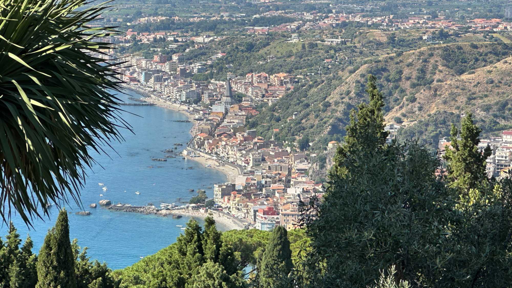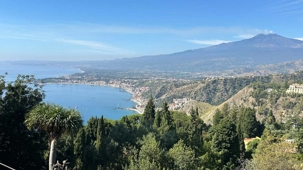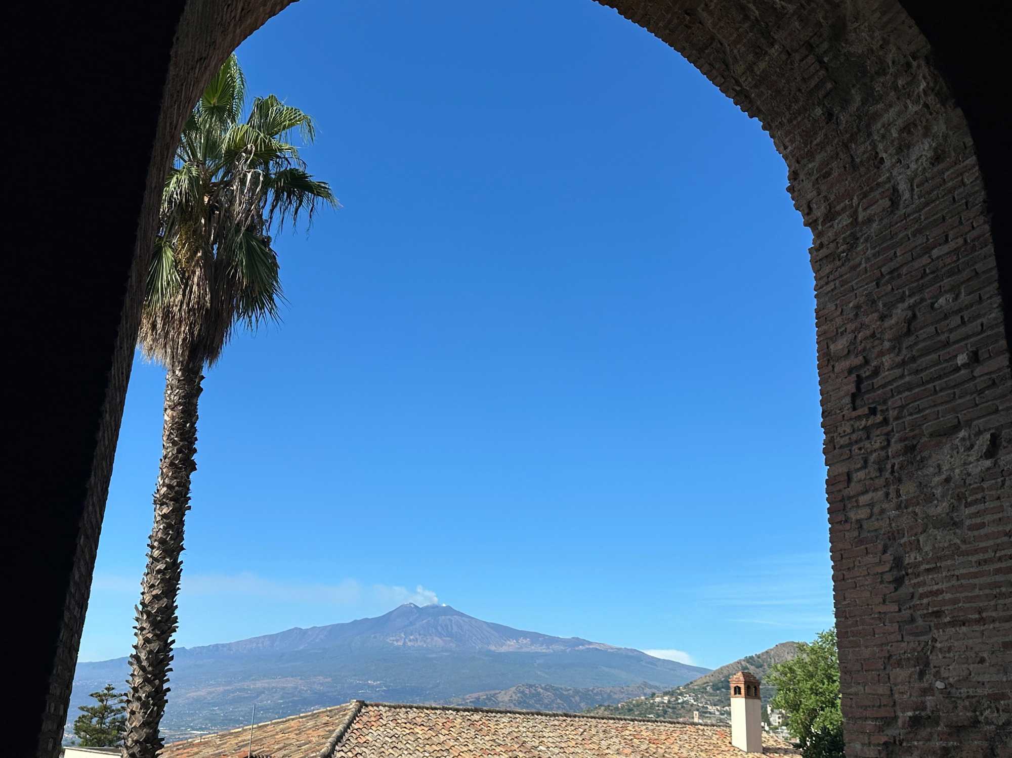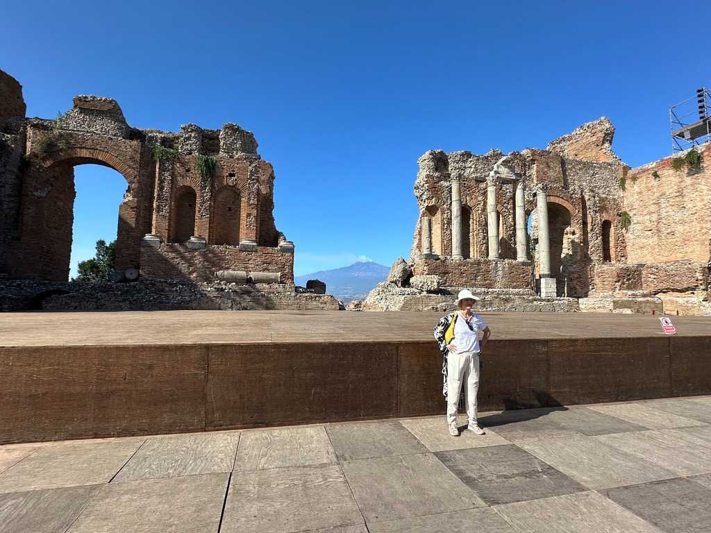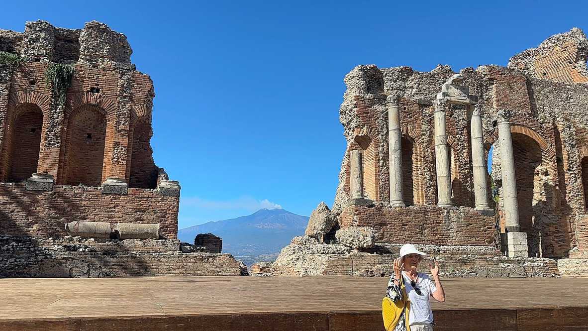 Nous arrivons ensuite à Taormina. Après une ascension en autocar dont nous nous rappellerons, nous devons prendre une navette qui grimpe en lacets serrés jusqu’au centre historique. Et là, dès qu’on met pied à terre… coup de foudre. La ville est suspendue entre ciel, mer et montagnes, avec une vue spectaculaire sur l’Etna d’un côté et la mer Ionienne de l’autre. Un décor de carte postale, mais bien réel.