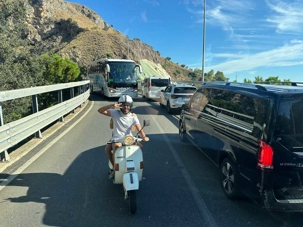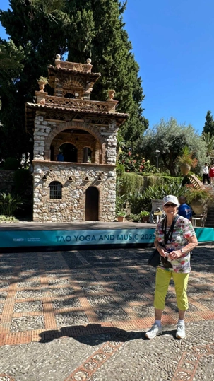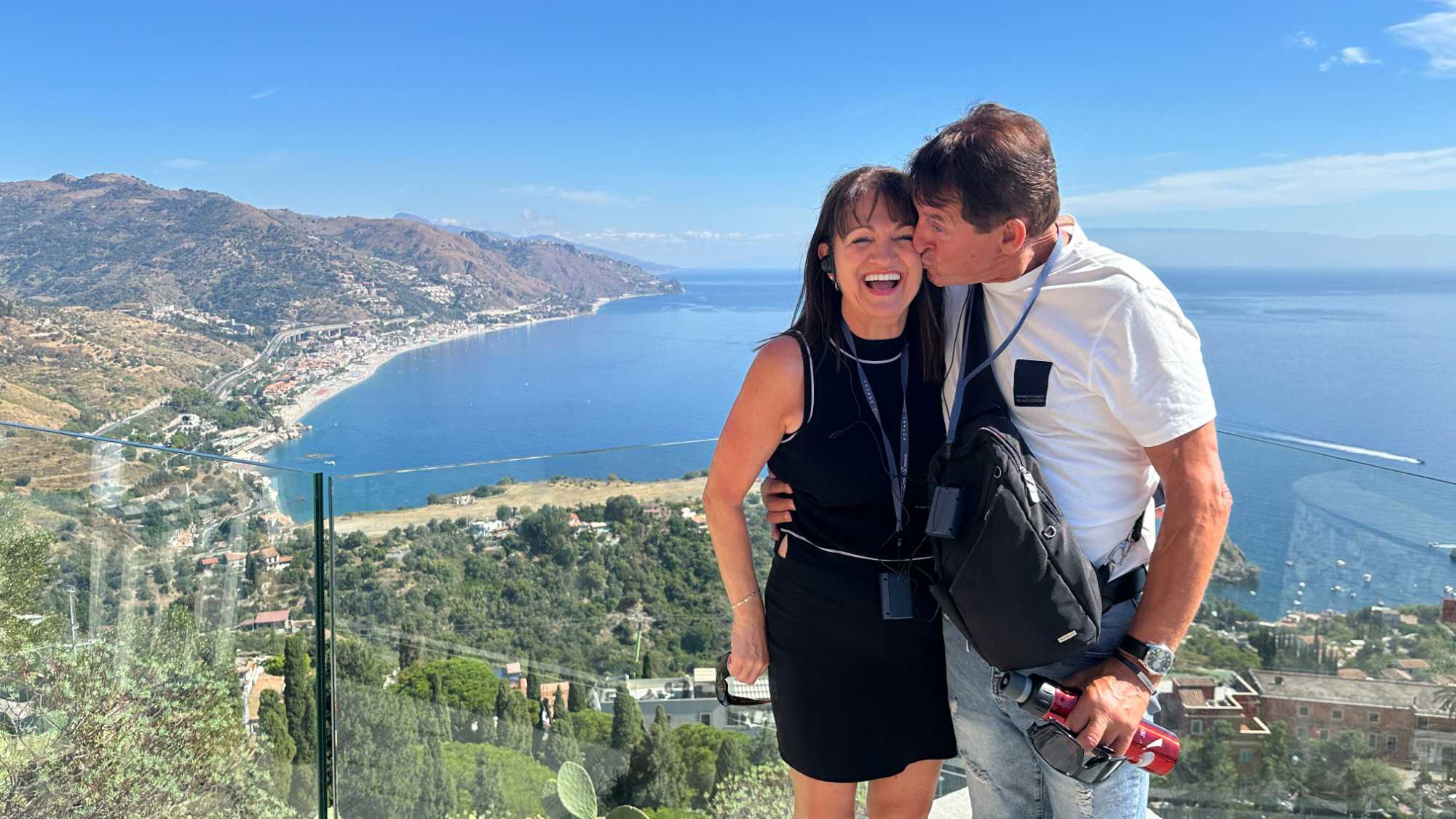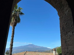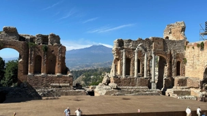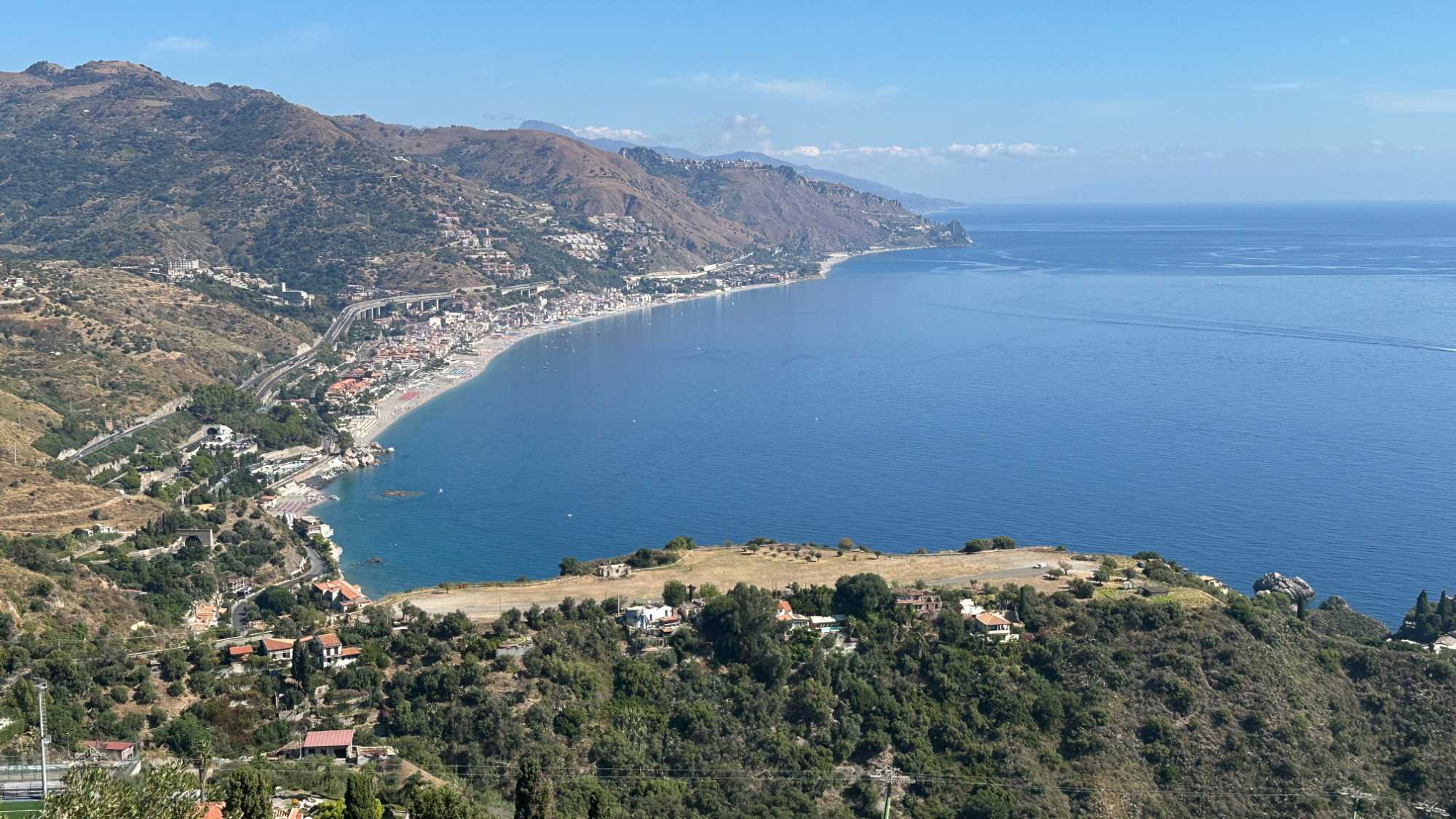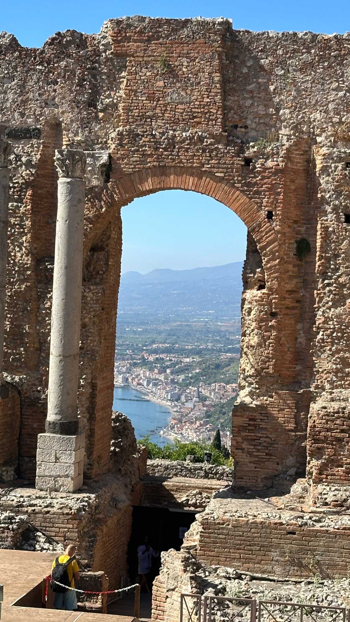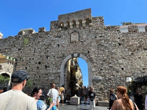 Nous arrivons ensuite à Taormina. Après une ascension en autocar dont nous nous rappellerons, nous devons prendre une navette qui grimpe en lacets serrés jusqu’au centre historique. Et là, dès qu’on met pied à terre… coup de foudre. La ville est suspendue entre ciel, mer et montagnes, avec une vue spectaculaire sur l’Etna d’un côté et la mer Ionienne de l’autre. Un décor de carte postale, mais bien réel.