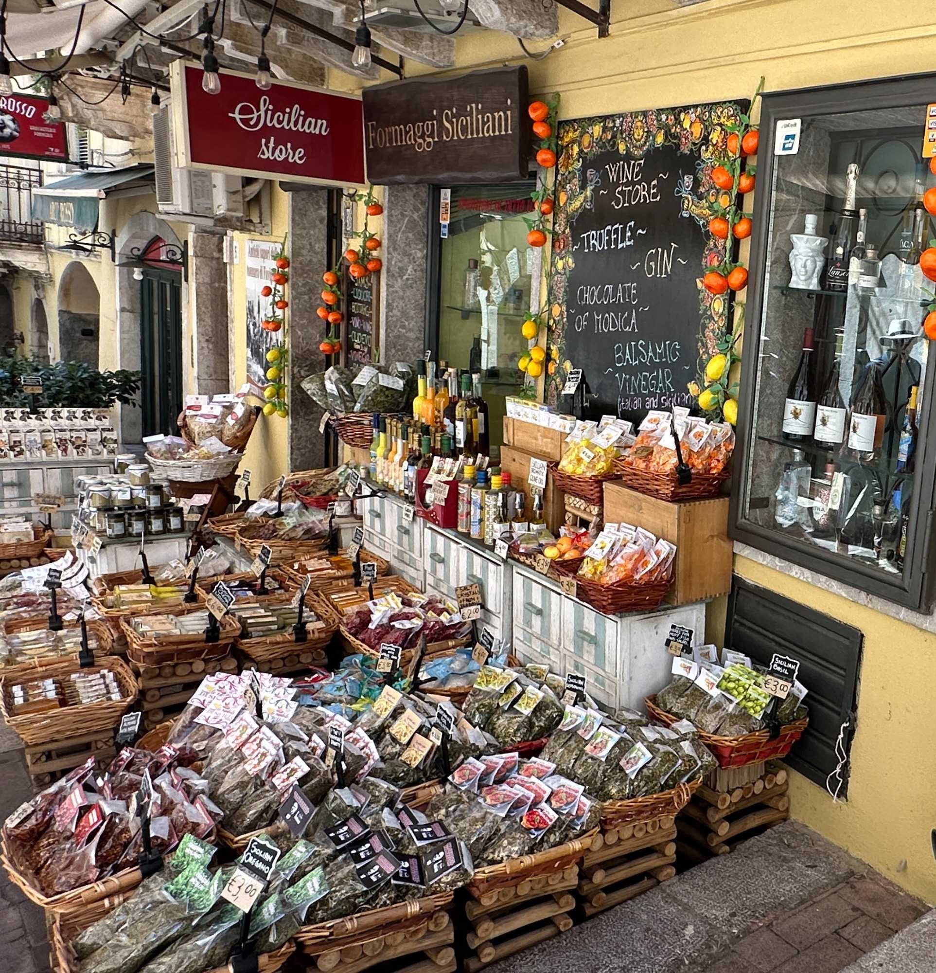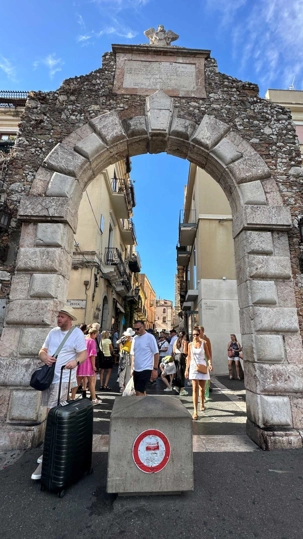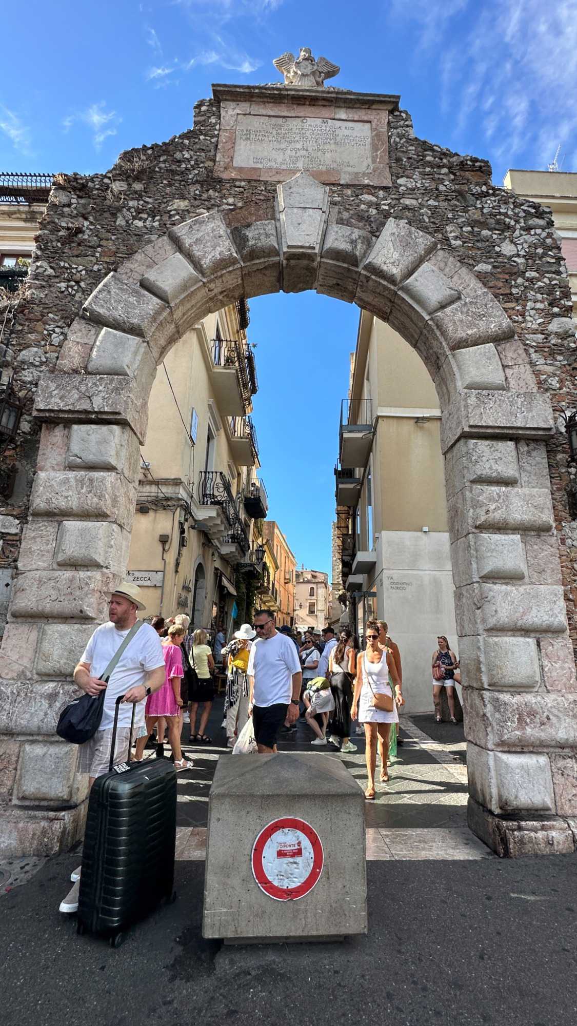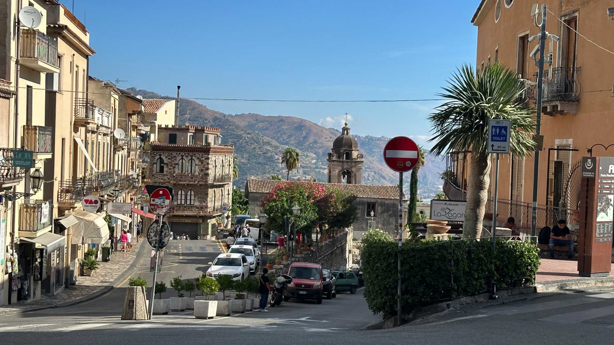 Nous terminons la visite guidée en haut du Corso Umberto, l’artère principale et piétonne de Taormina. Cette rue relie la Porta Messina au nord à la Porta Catania au sud, et concentre tout ce qui fait le charme de l’Italie : boutiques élégantes, terrasses de café, glaciers artisanaux, antiquaires, petites églises et monuments anciens, le tout dans une ambiance animée mais jamais étouffante.