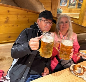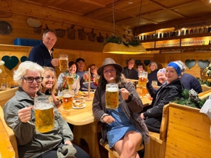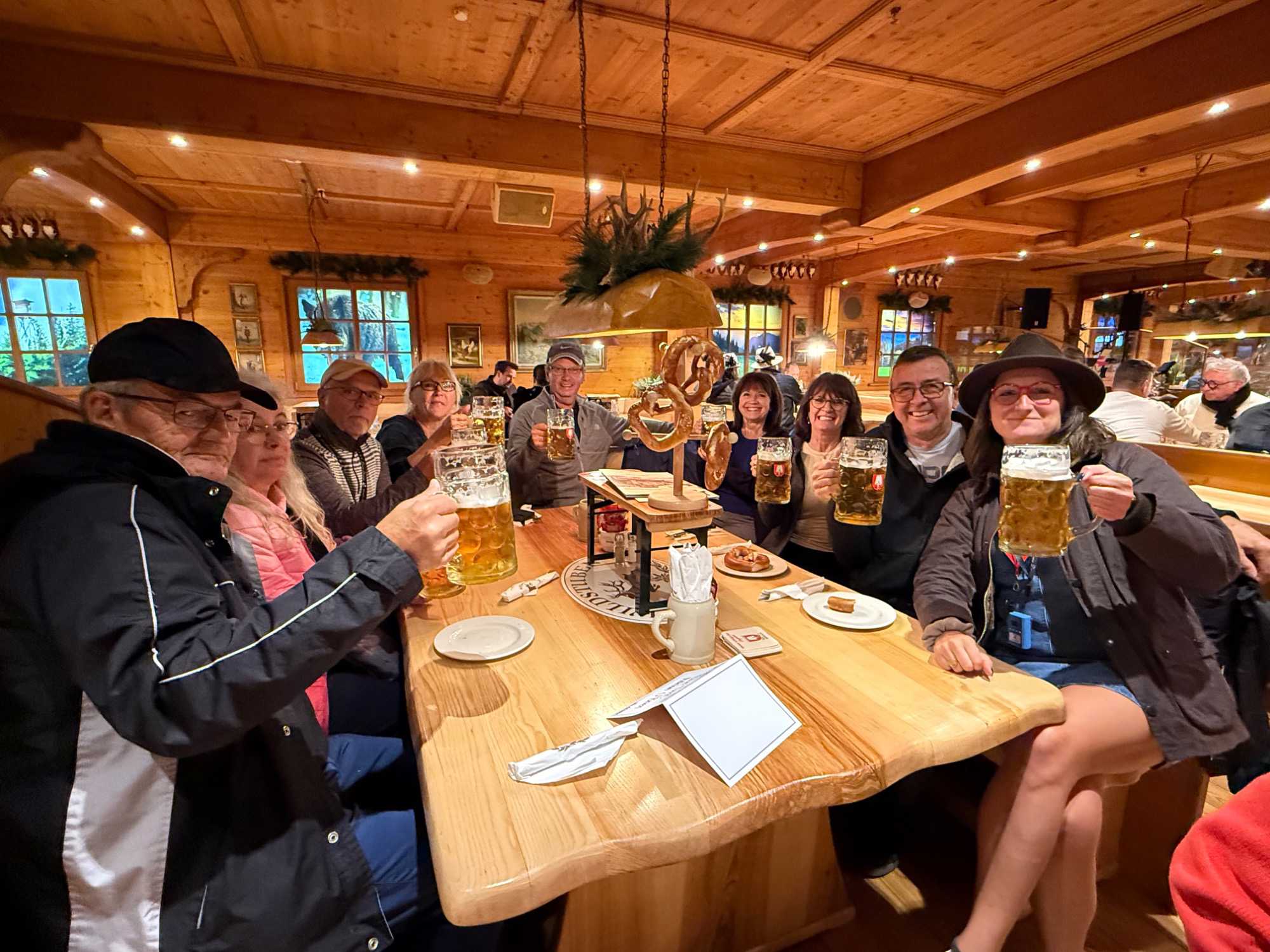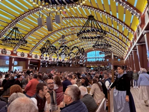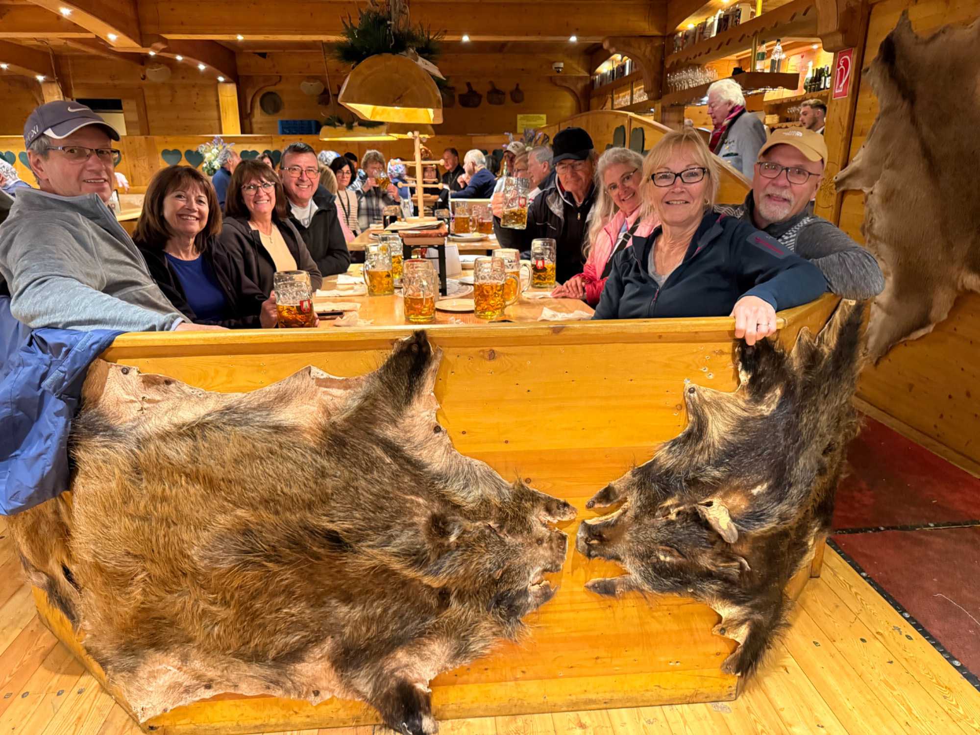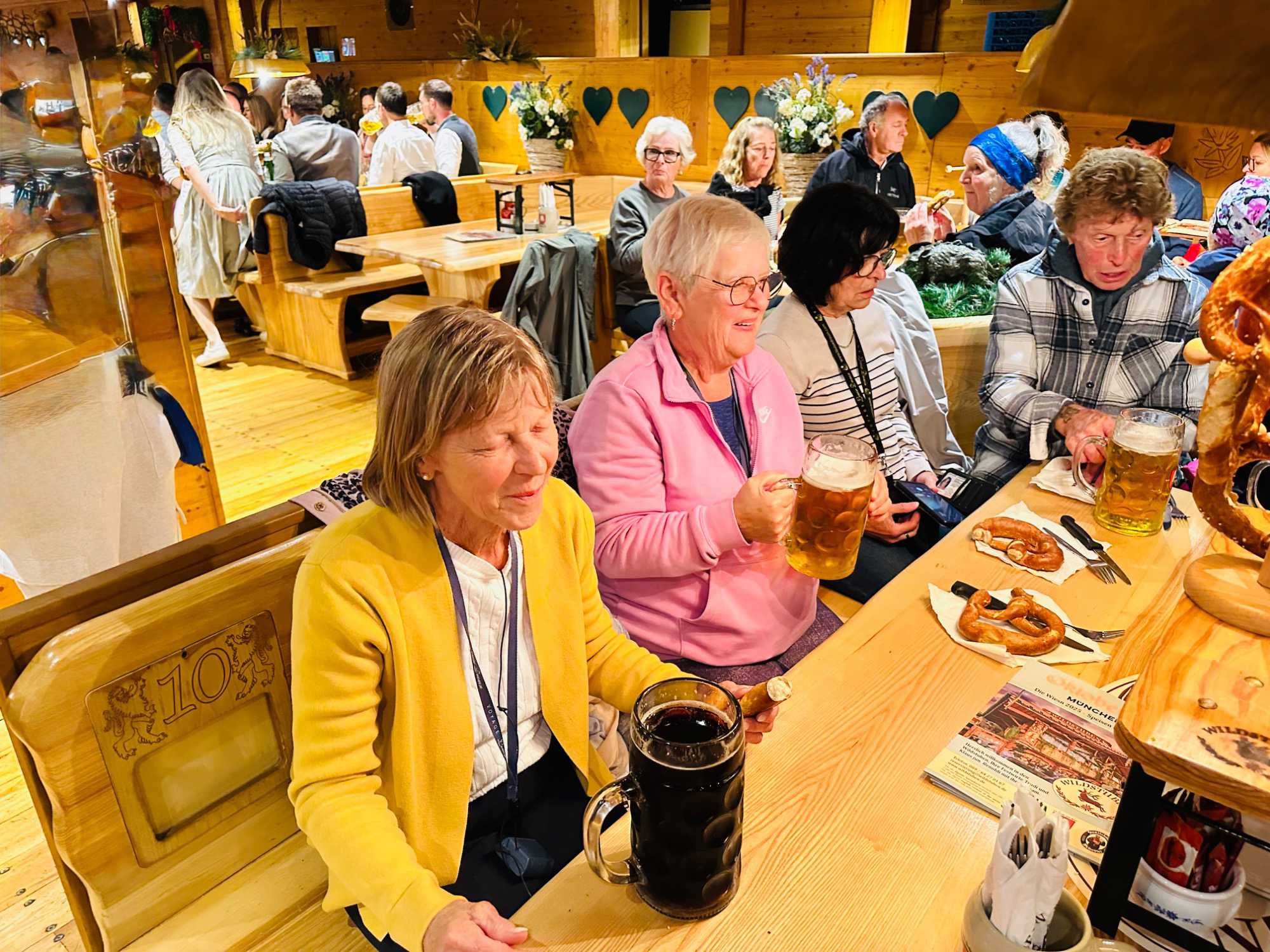 C’est donc dans cette ambiance authentique et festive que nous dégustons notre dîner typiquement bavarois, accompagné, bien sûr, d’un litre de bière blonde locale. L’atmosphère est animée : musique traditionnelle, costumes bavarois colorés (dirndl et lederhosen), chants, et une joie collective qui fait vibrer toute la prairie de Theresienwiese. Moment inoubliable : guidés par Paul, l’un de nos voyageurs, nous entonnons fièrement notre hymne national « Ô Canada », créant une vague d’émotion et de fierté au cœur même de cette fête bavaroise légendaire. 🇨🇦🎶