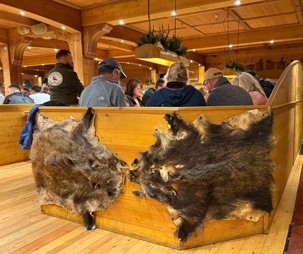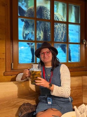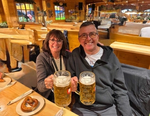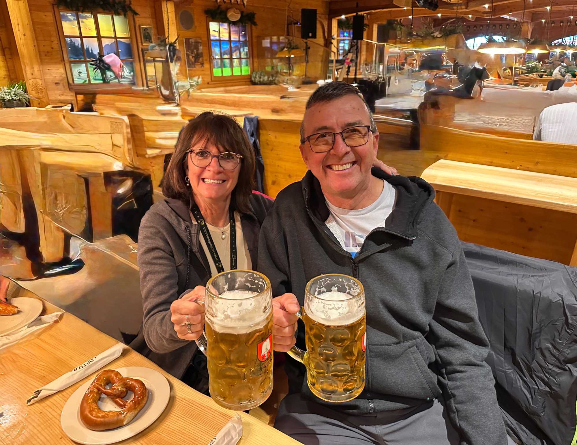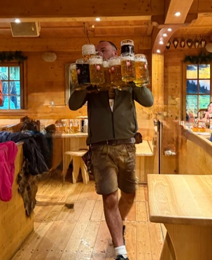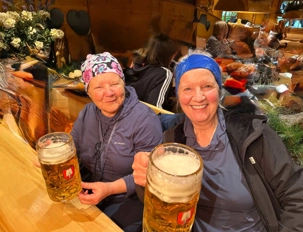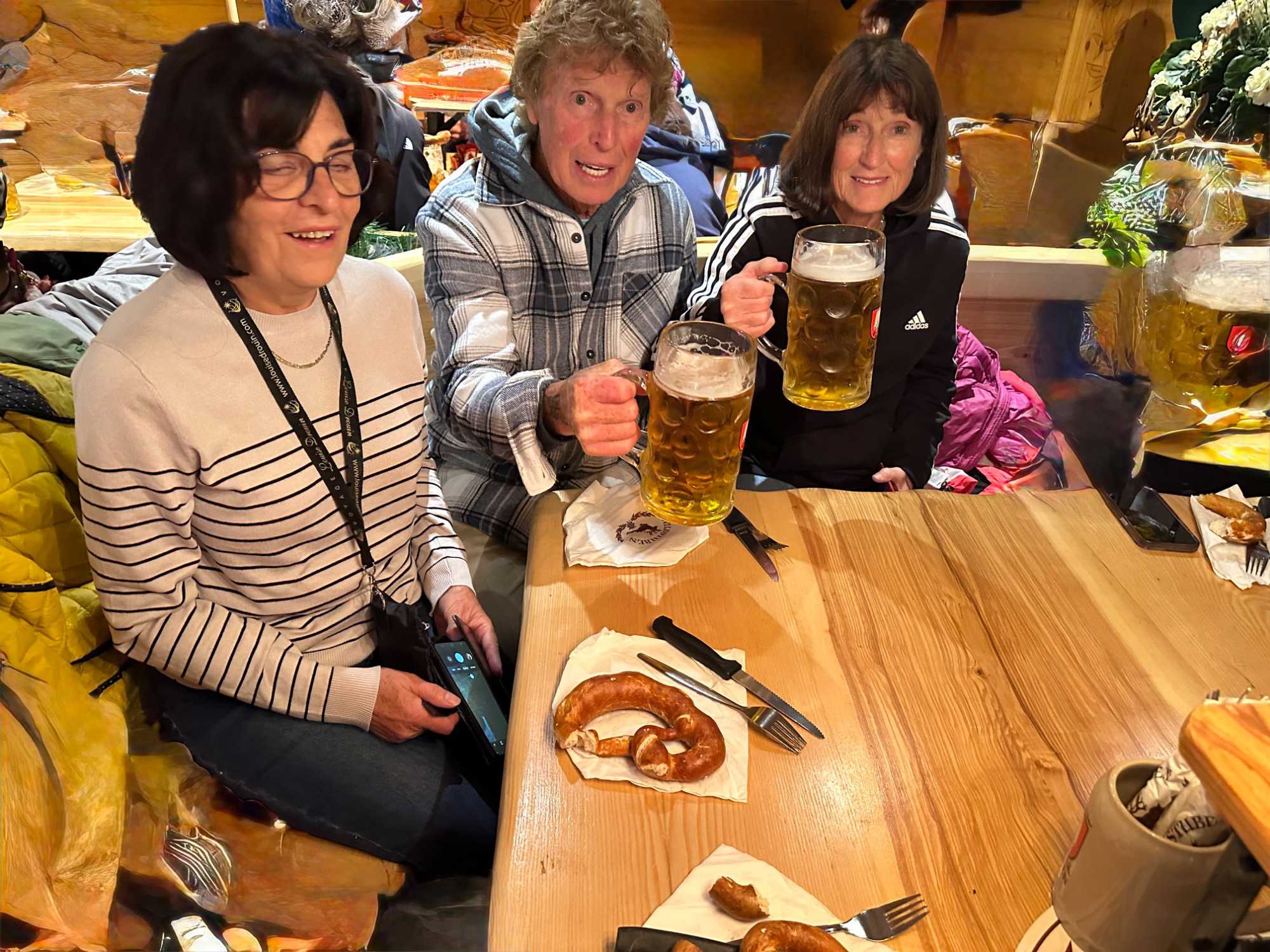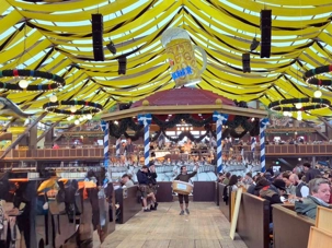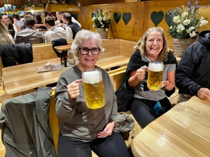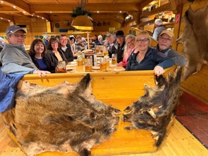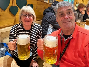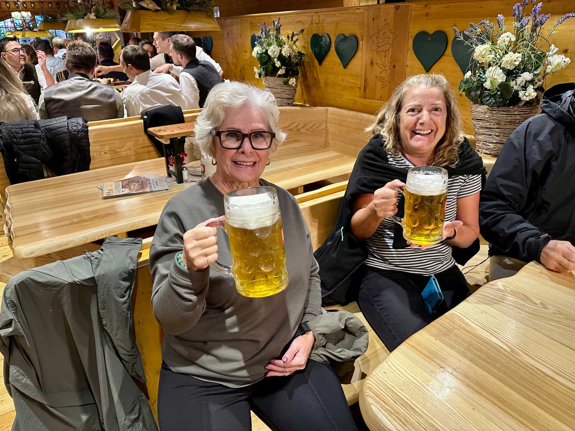 C’est donc dans cette ambiance authentique et festive que nous dégustons notre dîner typiquement bavarois, accompagné, bien sûr, d’un litre de bière blonde locale. L’atmosphère est animée : musique traditionnelle, costumes bavarois colorés (dirndl et lederhosen), chants, et une joie collective qui fait vibrer toute la prairie de Theresienwiese. Moment inoubliable : guidés par Paul, l’un de nos voyageurs, nous entonnons fièrement notre hymne national « Ô Canada », créant une vague d’émotion et de fierté au cœur même de cette fête bavaroise légendaire. 🇨🇦🎶