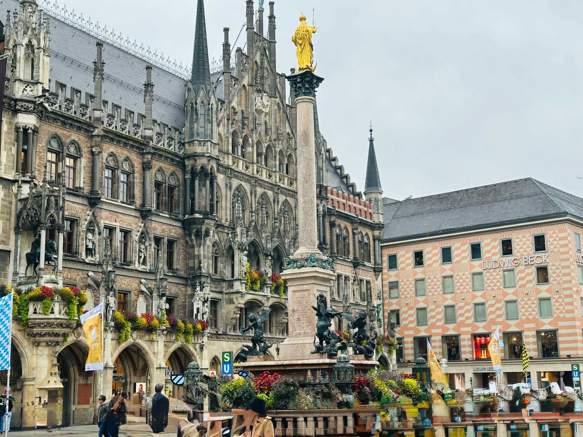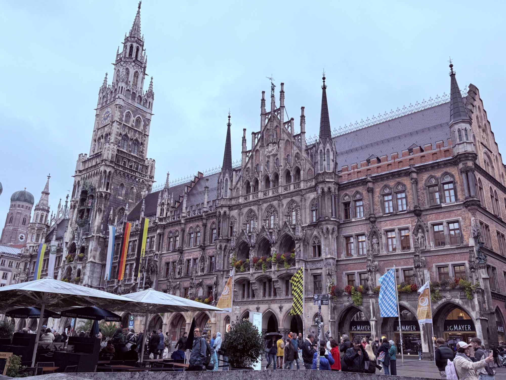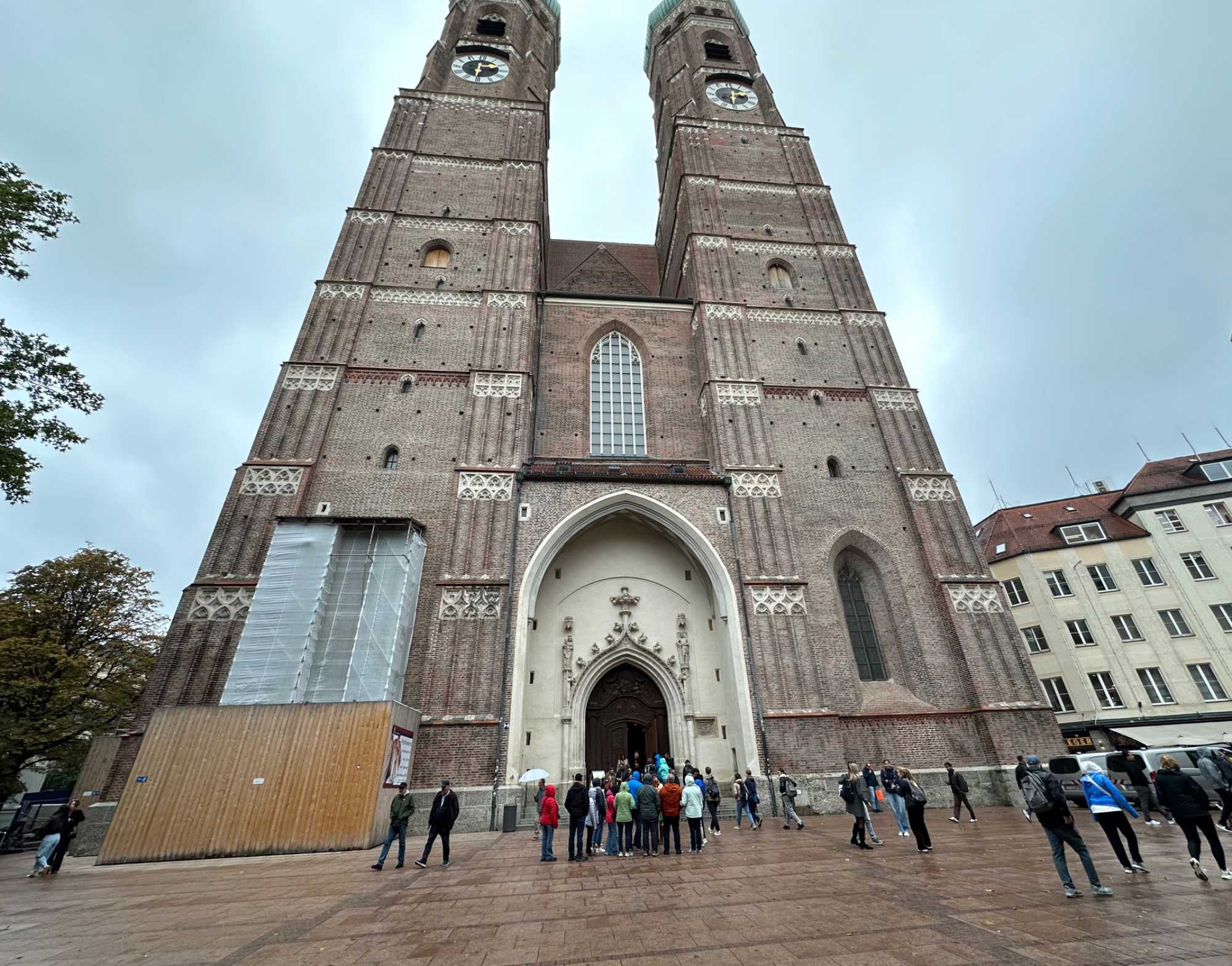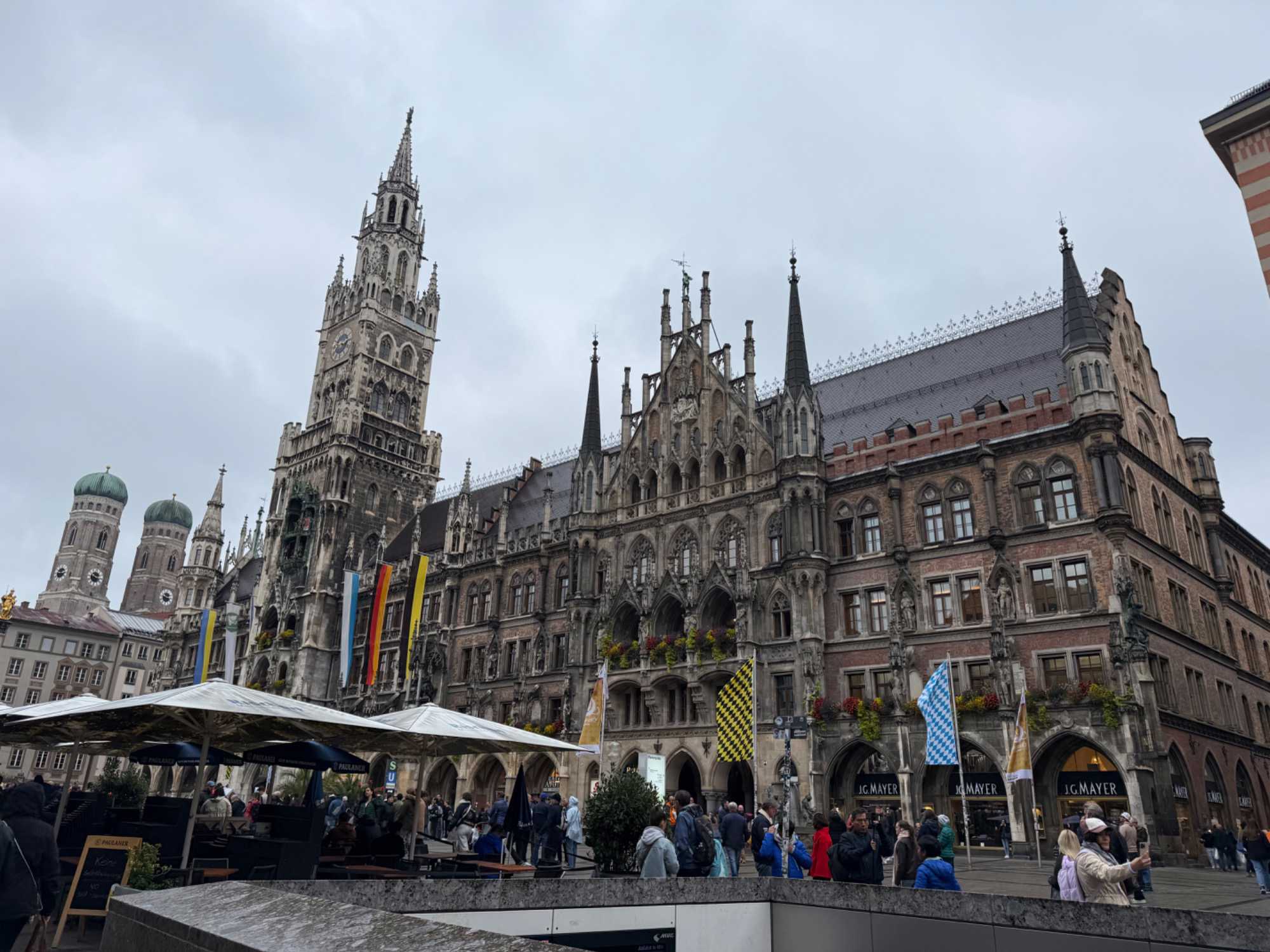 L’après-midi, nous retrouvons nos guides locales Valérie et Catherine pour une visite guidée d’une heure de Munich. Afin de profiter pleinement de leurs explications et d’explorer la ville dans les meilleures conditions, le groupe est divisé en deux. Chacun part ainsi à la découverte des trésors de la capitale bavaroise. Parmi les lieux emblématiques que nous découvrons figurent la Marienplatz, cœur vibrant de Munich avec son Nouvel Hôtel de Ville (Neues Rathaus) et sa célèbre horloge animée, la majestueuse Frauenkirche aux deux clochers jumeaux, symbole de la ville, ainsi que la Viktualienmarkt, marché coloré et gourmand qui respire l’authenticité bavaroise.