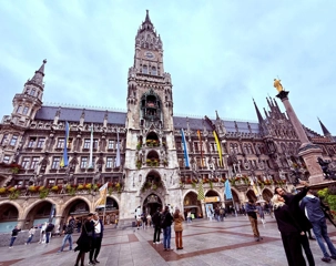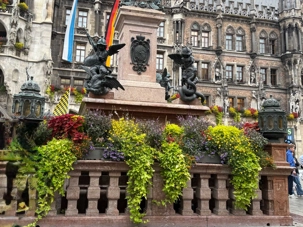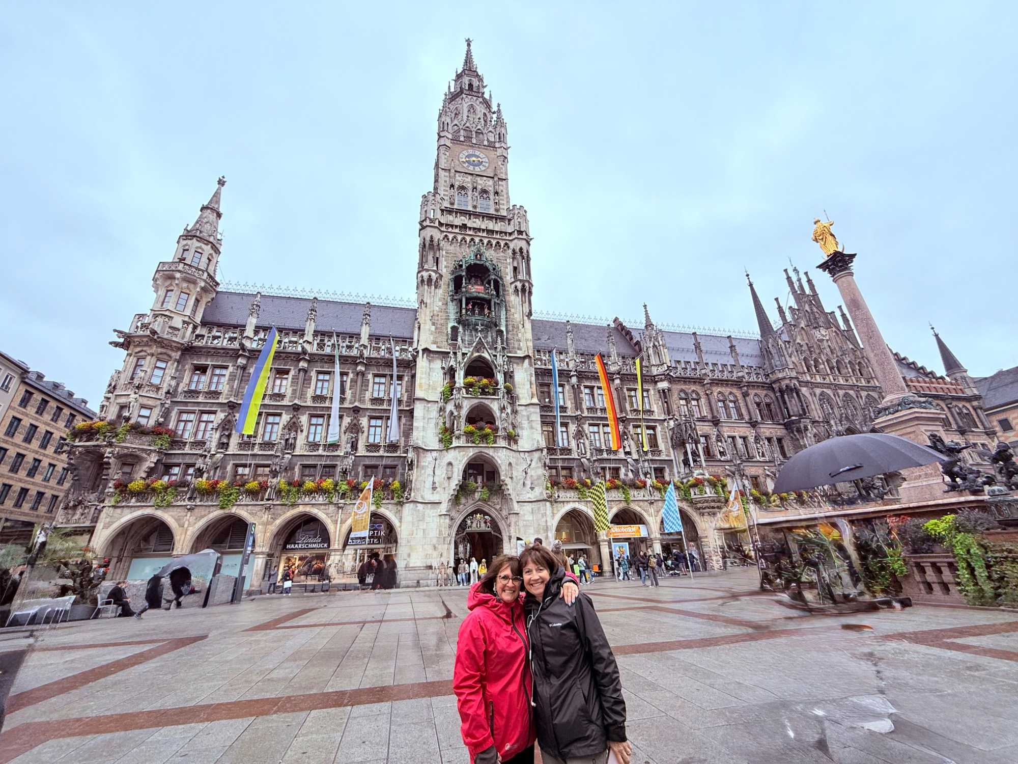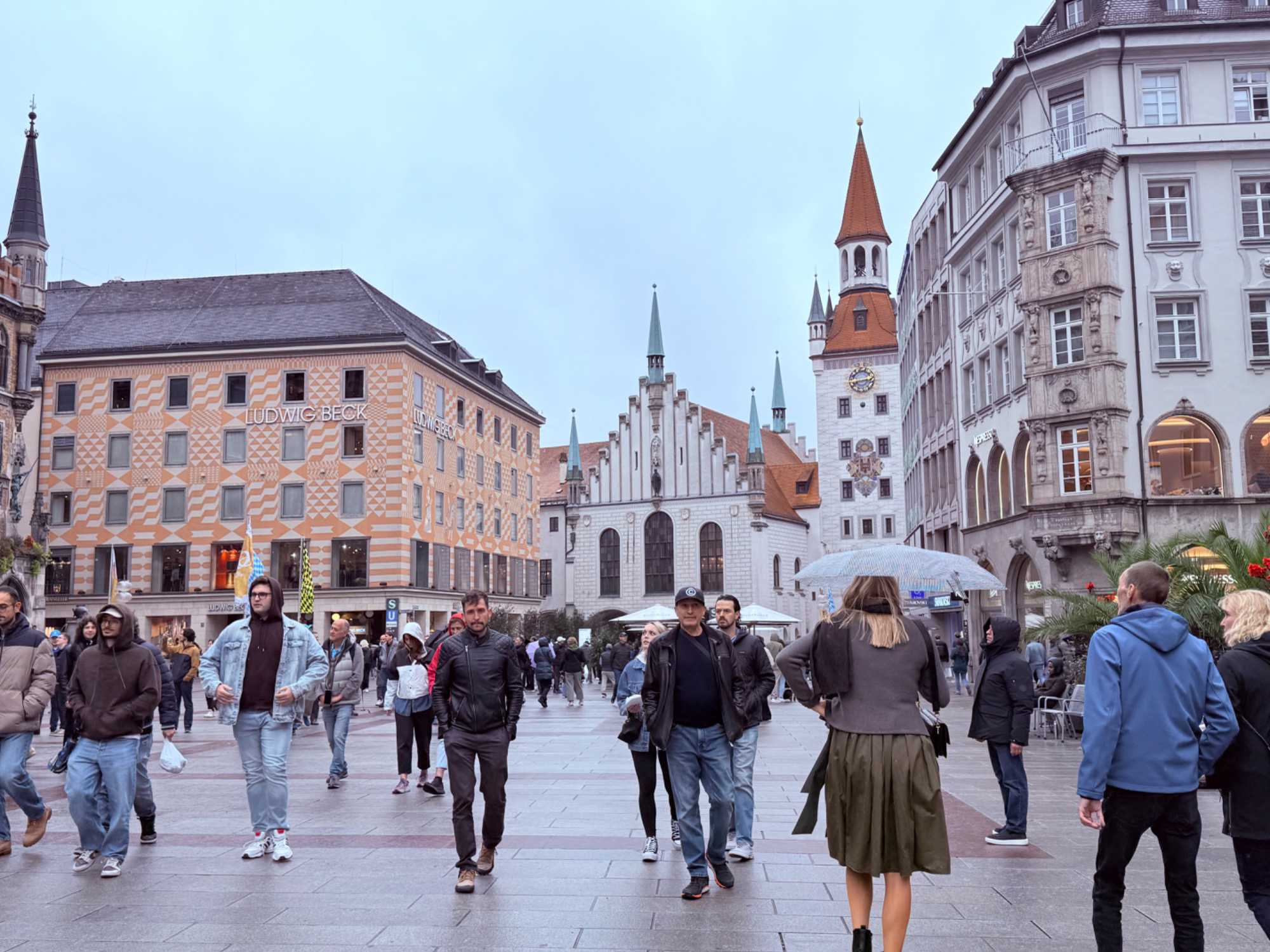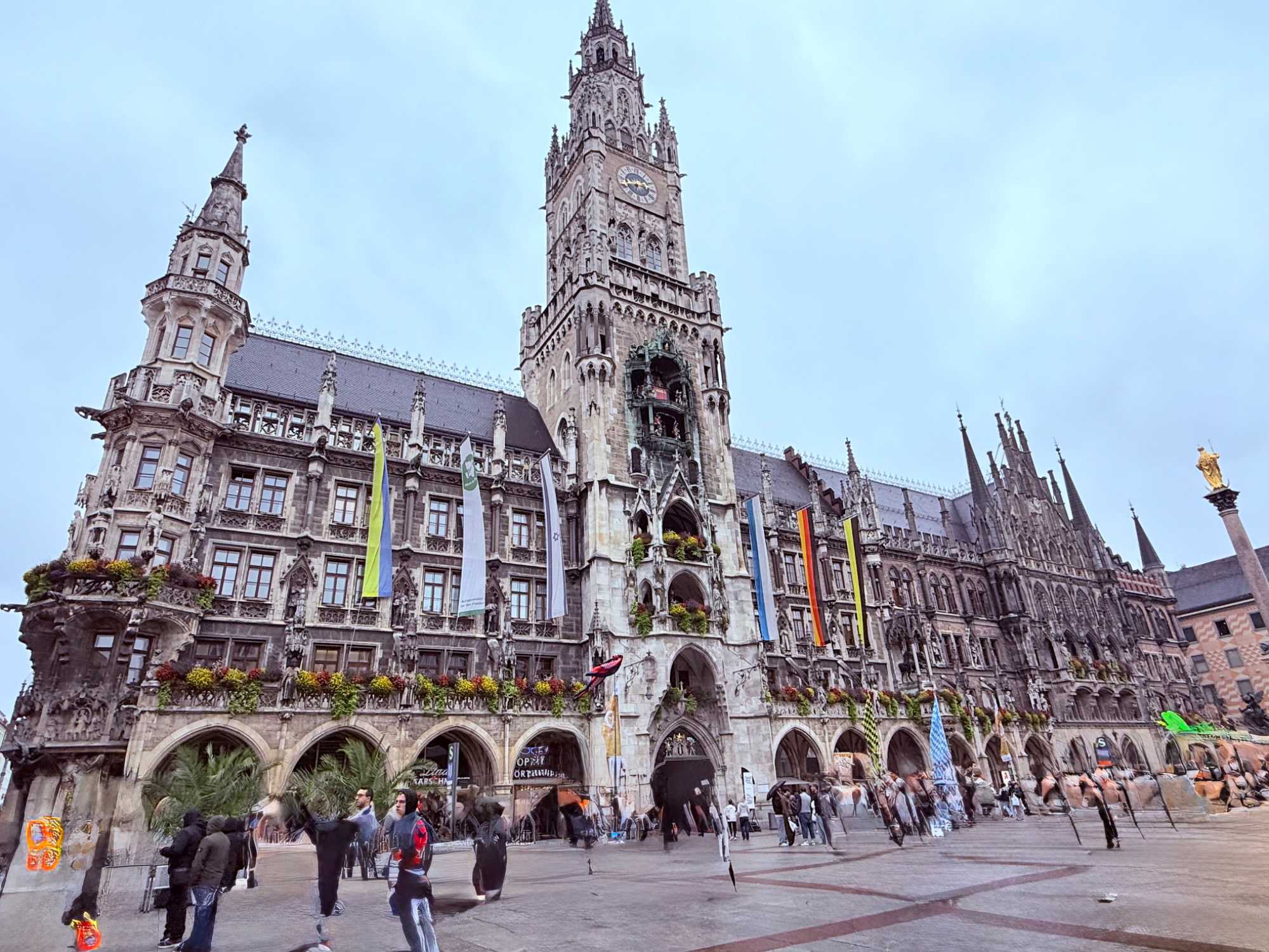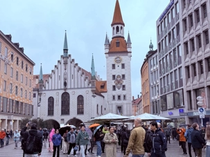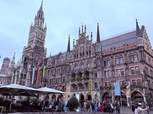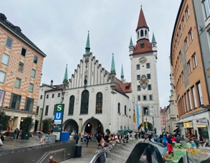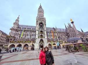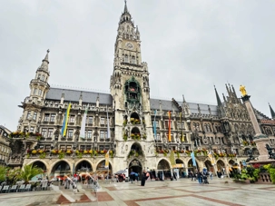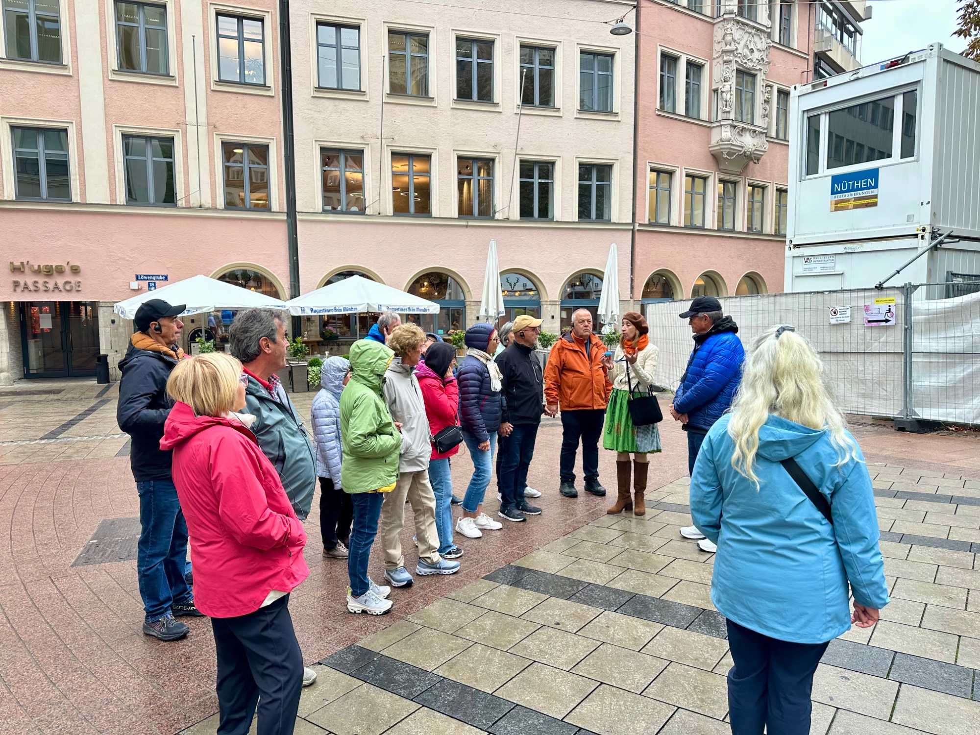 L’après-midi, nous retrouvons nos guides locales Valérie et Catherine pour une visite guidée d’une heure de Munich. Afin de profiter pleinement de leurs explications et d’explorer la ville dans les meilleures conditions, le groupe est divisé en deux. Chacun part ainsi à la découverte des trésors de la capitale bavaroise. Parmi les lieux emblématiques que nous découvrons figurent la Marienplatz, cœur vibrant de Munich avec son Nouvel Hôtel de Ville (Neues Rathaus) et sa célèbre horloge animée, la majestueuse Frauenkirche aux deux clochers jumeaux, symbole de la ville, ainsi que la Viktualienmarkt, marché coloré et gourmand qui respire l’authenticité bavaroise.