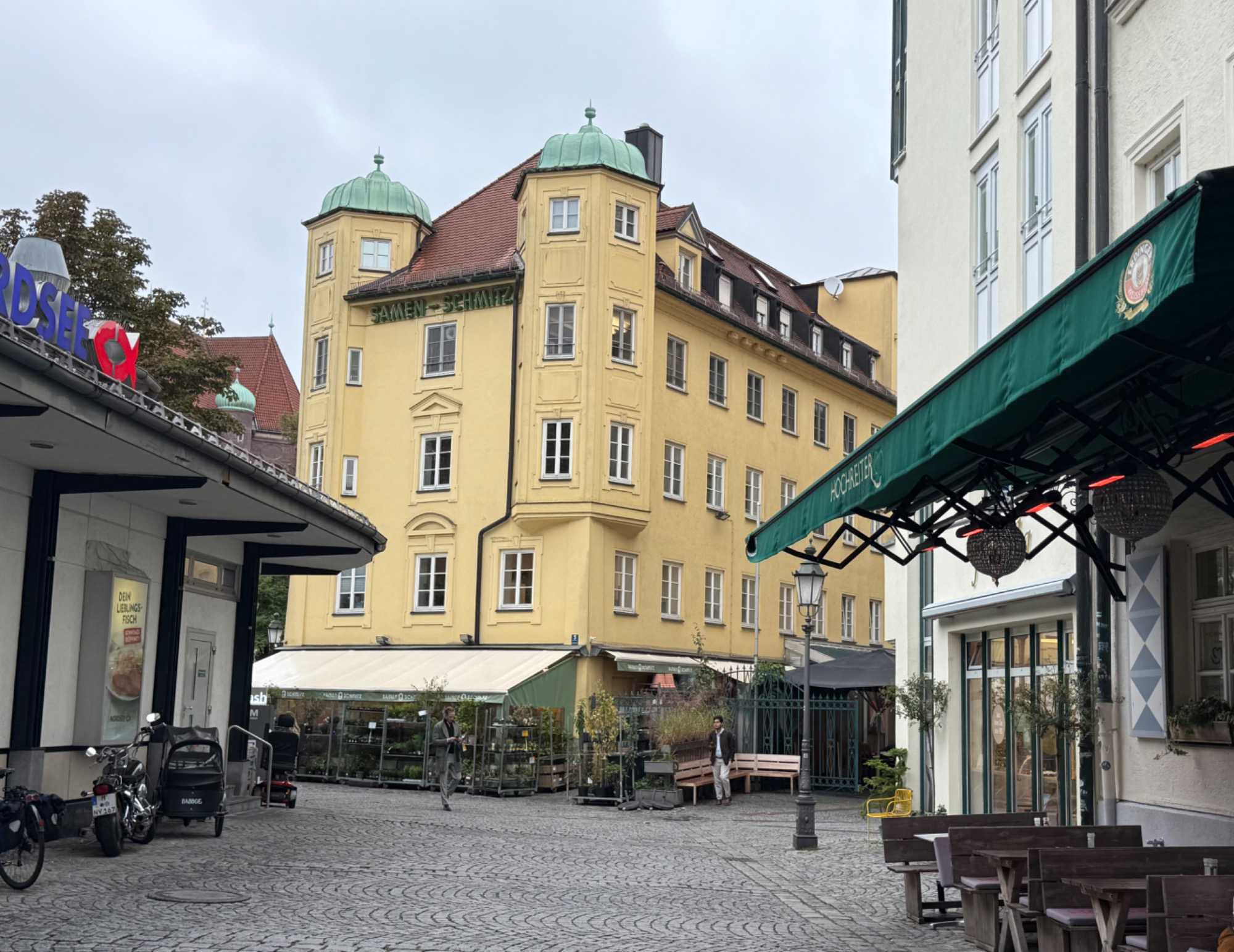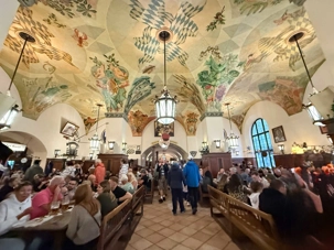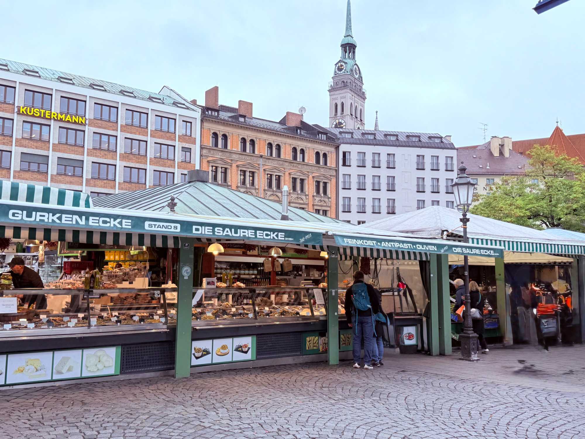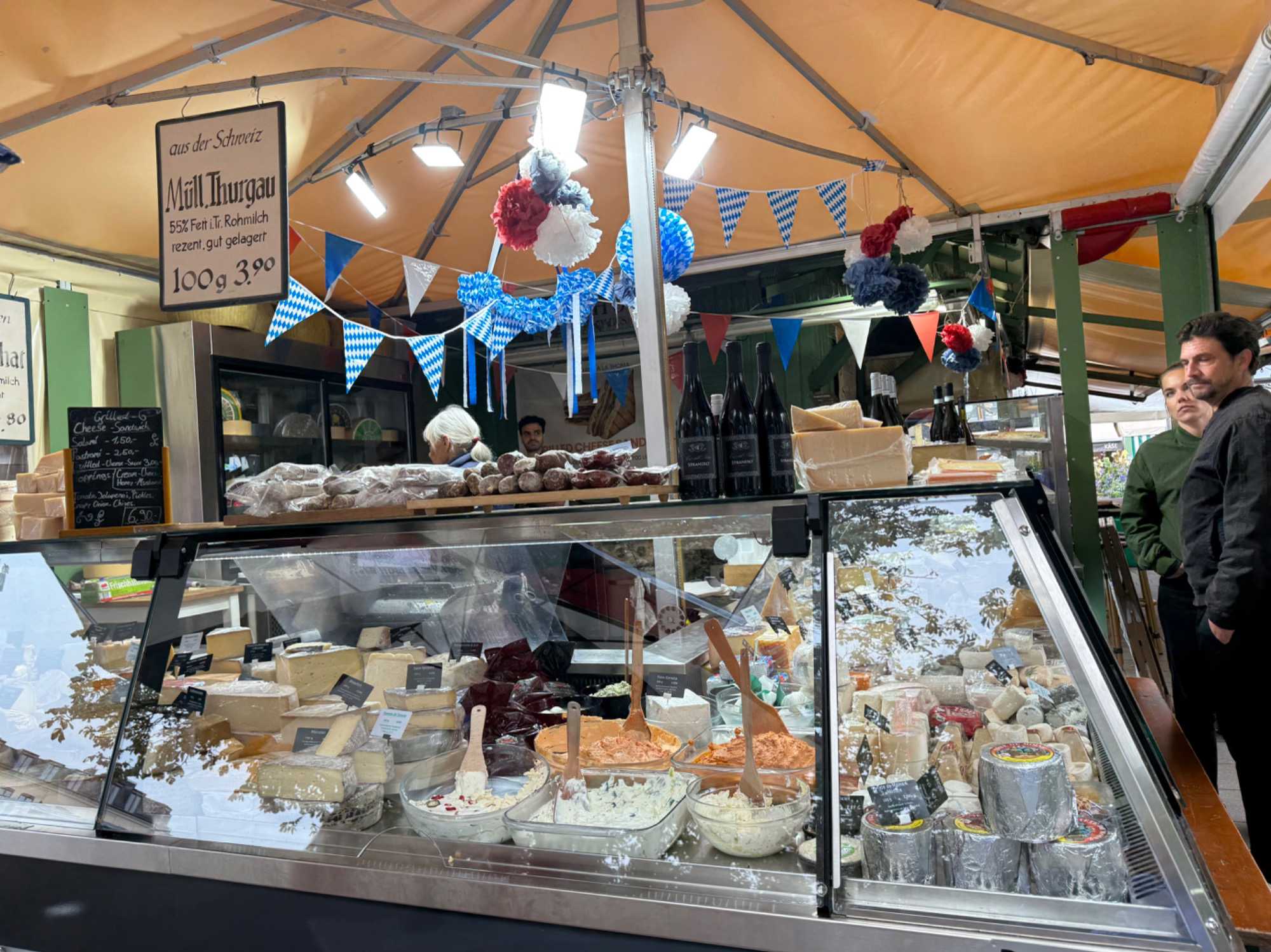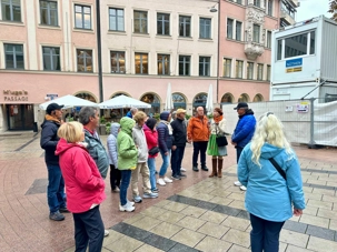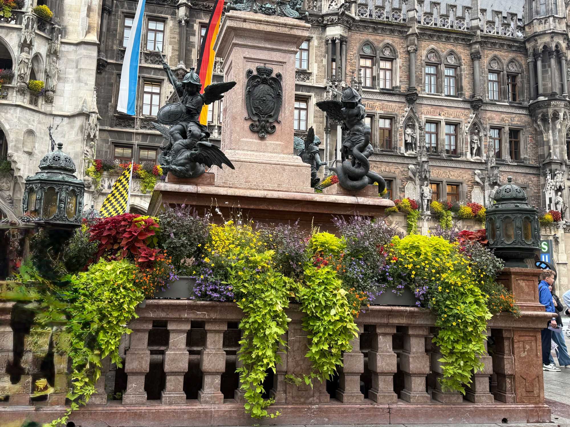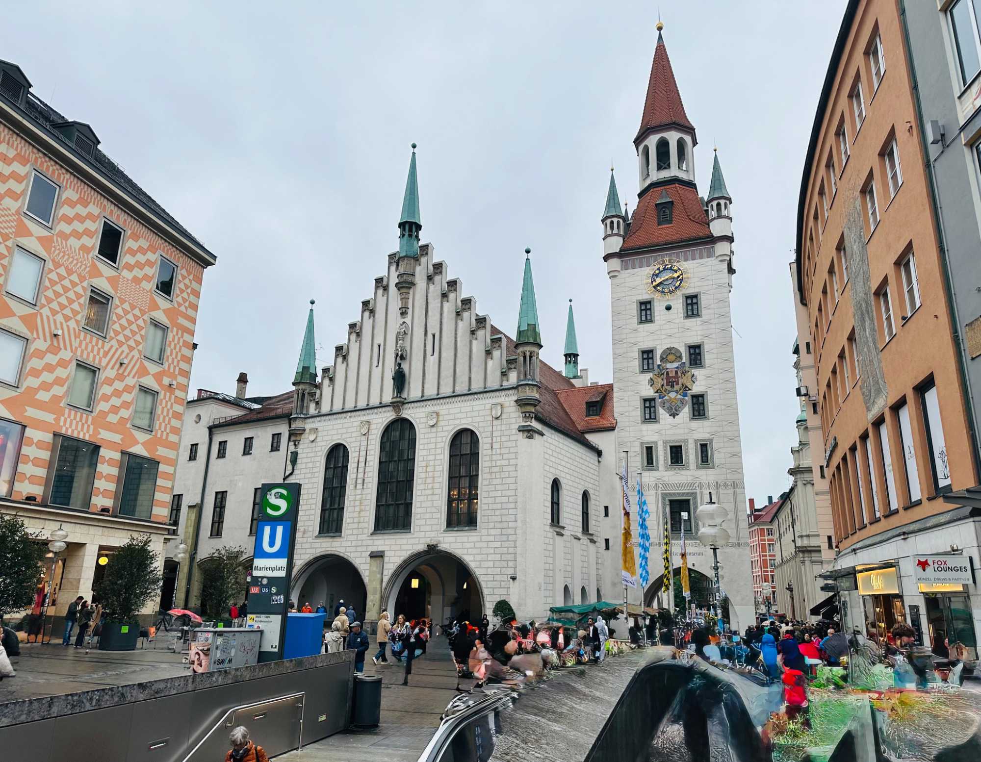 L’après-midi, nous retrouvons nos guides locales Valérie et Catherine pour une visite guidée d’une heure de Munich. Afin de profiter pleinement de leurs explications et d’explorer la ville dans les meilleures conditions, le groupe est divisé en deux. Chacun part ainsi à la découverte des trésors de la capitale bavaroise. Parmi les lieux emblématiques que nous découvrons figurent la Marienplatz, cœur vibrant de Munich avec son Nouvel Hôtel de Ville (Neues Rathaus) et sa célèbre horloge animée, la majestueuse Frauenkirche aux deux clochers jumeaux, symbole de la ville, ainsi que la Viktualienmarkt, marché coloré et gourmand qui respire l’authenticité bavaroise.