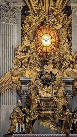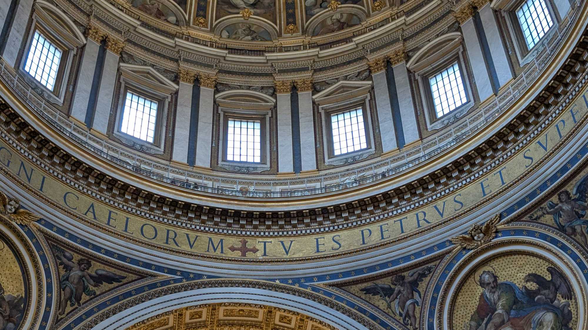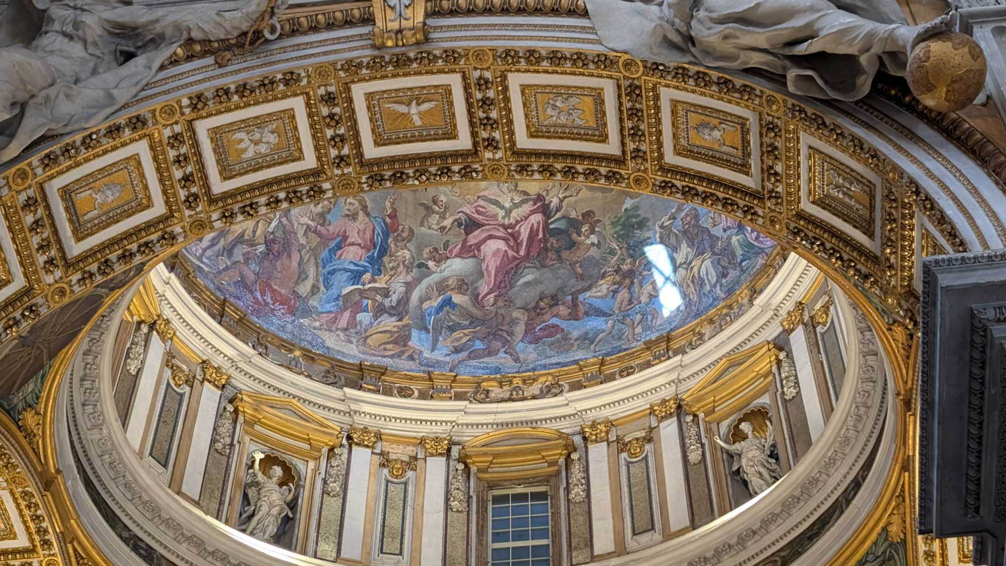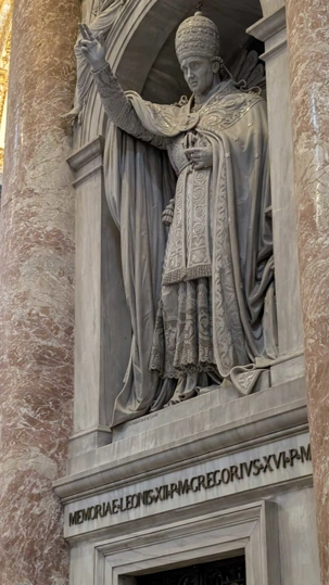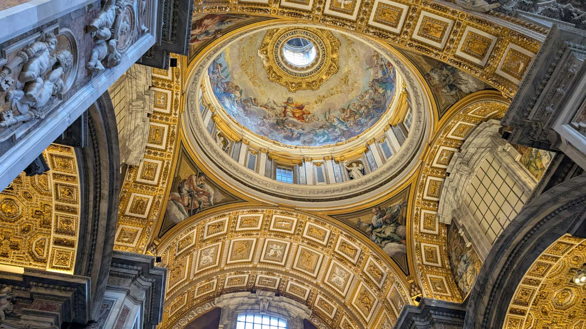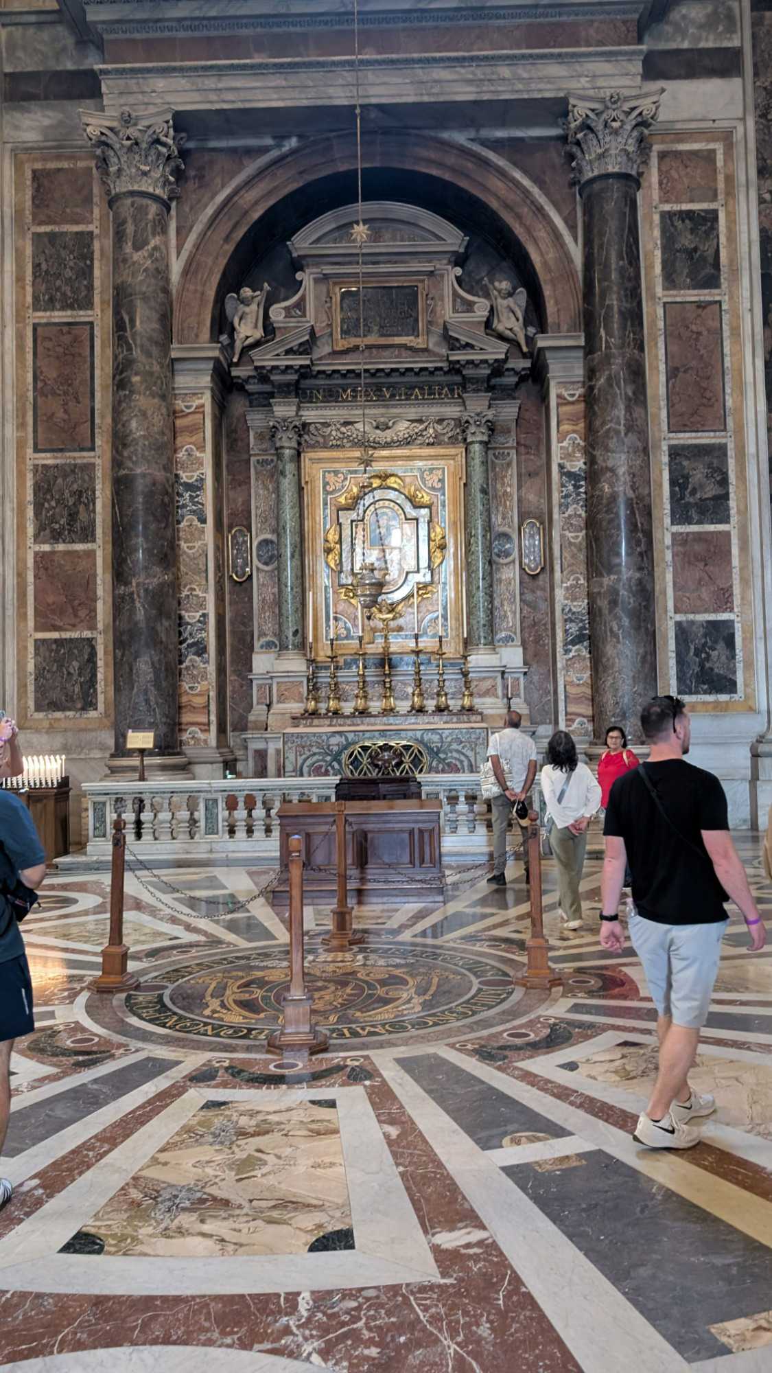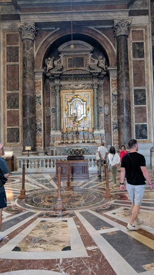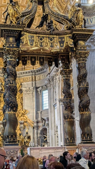 Puis, nous entrons ensuite en silence dans la basilique Saint-Pierre, la plus grande conception architecturale d’une exploration riche en découvertes. Considérée comme le cœur spirituel de l’Église catholique, La basilique est dédiée au martyre de saint Pierre, l'un des douze apôtres de Jésus-Christ fut le premier évêque d’Antioche et de Rome, donc le premier pape. Sa façade, composée de colonnes massives et de statues d’apôtres, est un chef-d’œuvre de l’architecture classique. À l’intérieur, nos regards sont immédiatement captés par les fresques, sculptures et marbres précieux, dont La Porte Sainte, cette porte ouverte par le pape François avant la messe de la veille de Noël lançant officiellement l’année jubilaire 2025 pour une durée d’un an. Parmi les trésors inestimables, la célèbre Pietà de Michel-Ange, une sublime sculpture en marbre représentant la Vierge Marie tenant le corps du Christ après la Crucifixion. C’est impossible de tout saisir en une seule visite devant un tel déploiement d’œuvres de toute sorte dont une bonne partie est ornée de feuilles d’or. Au niveau principal, le pape Jean XXIII y est également exposé, embaumé dans son cercueil. C’est également ici que se tiennent les grandes cérémonies papales, comme les messes de Noël et de Pâques, ainsi que les couronnements des papes.