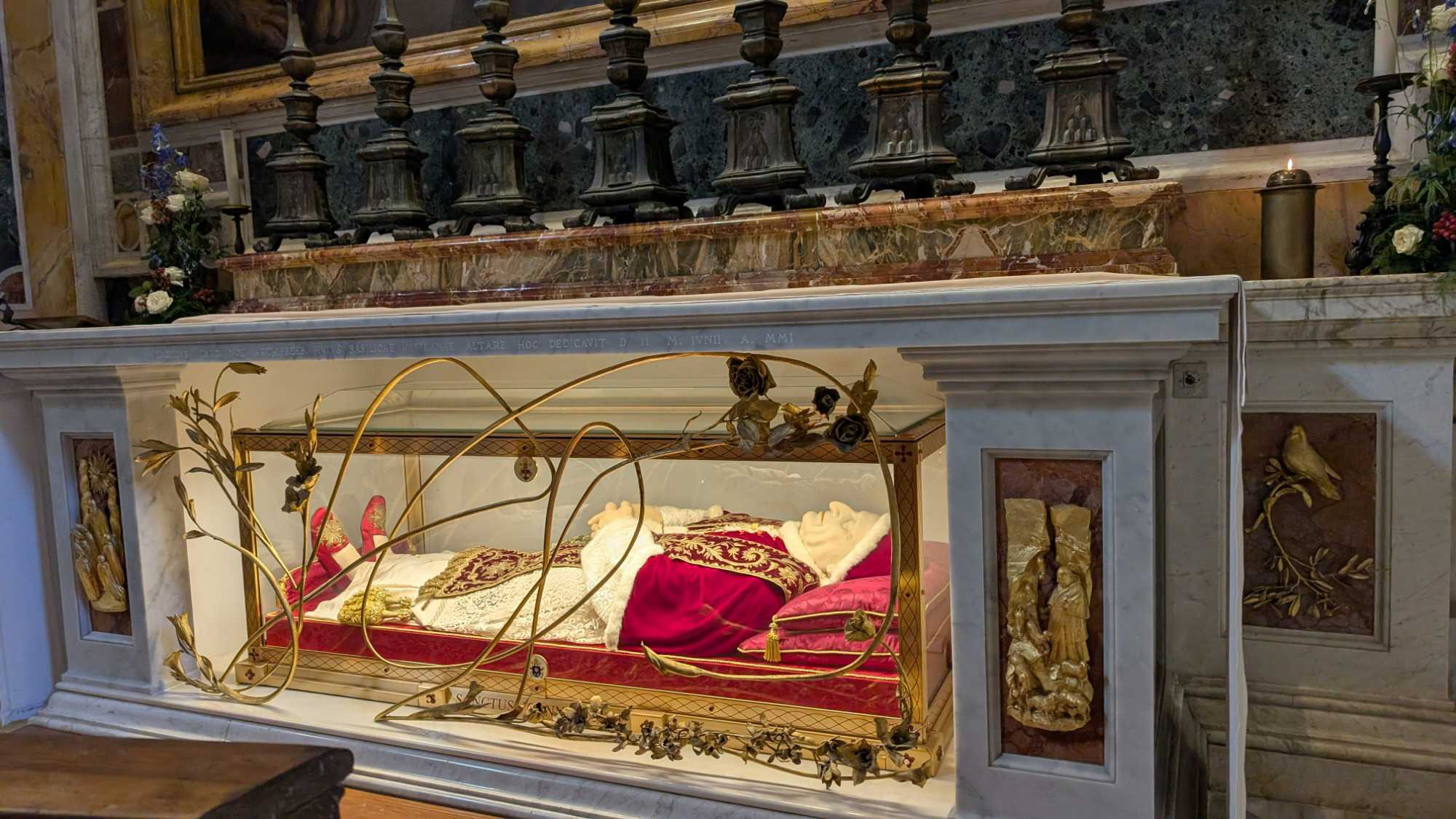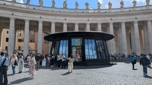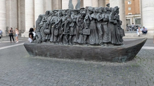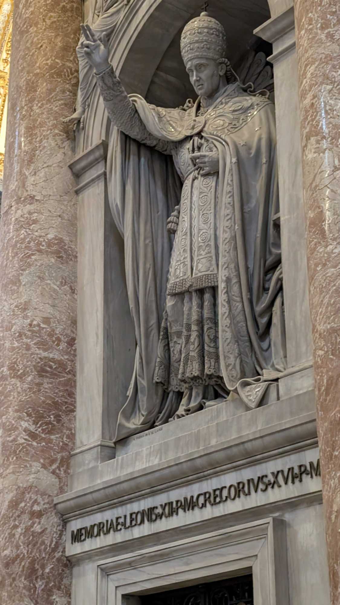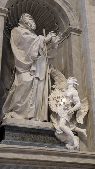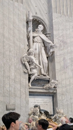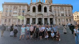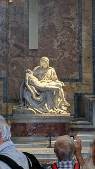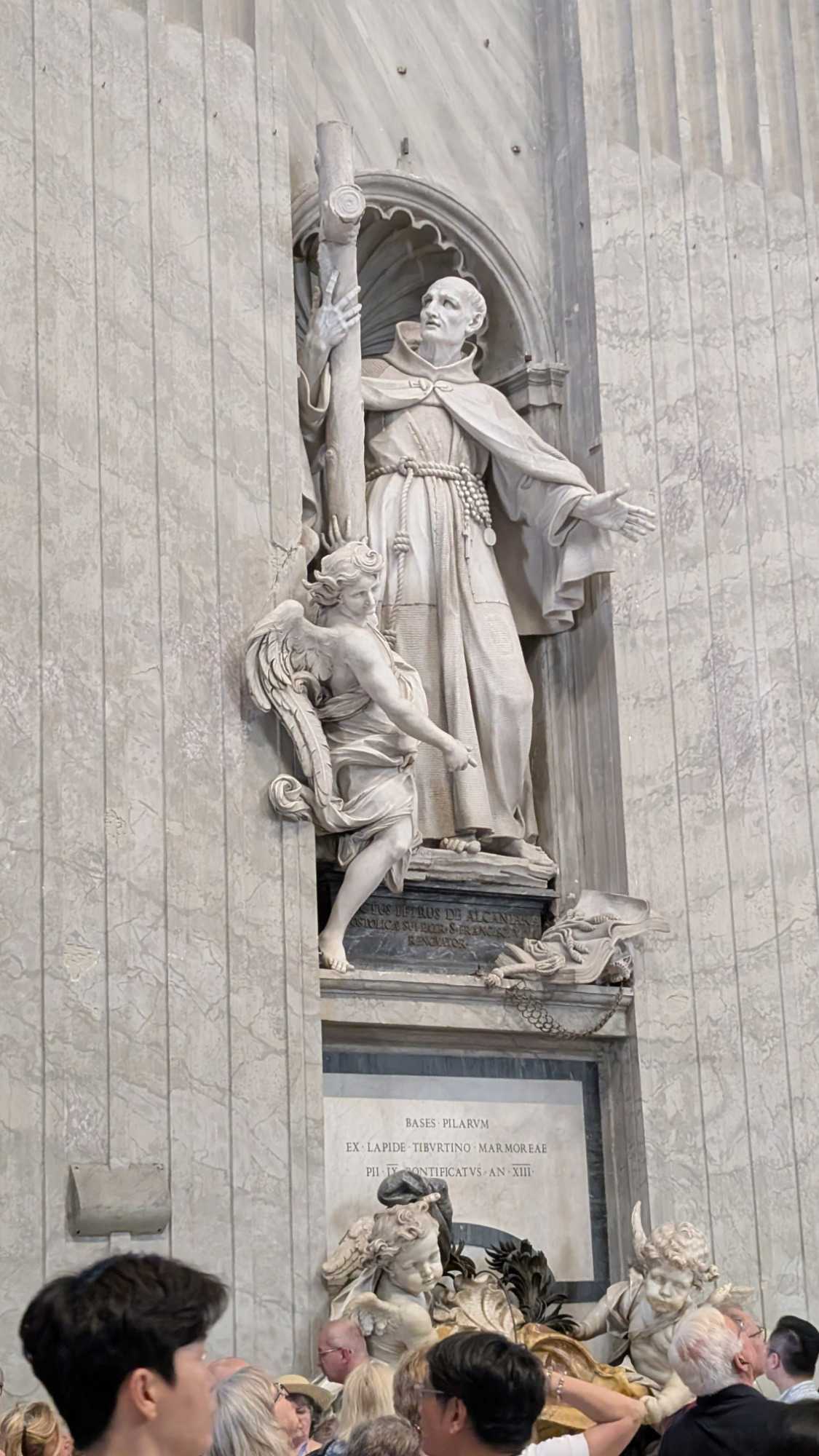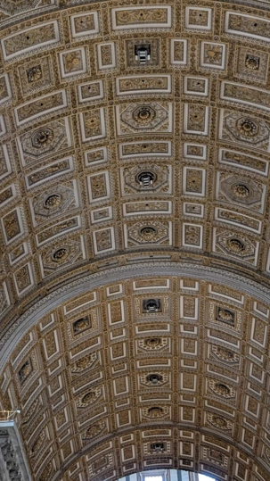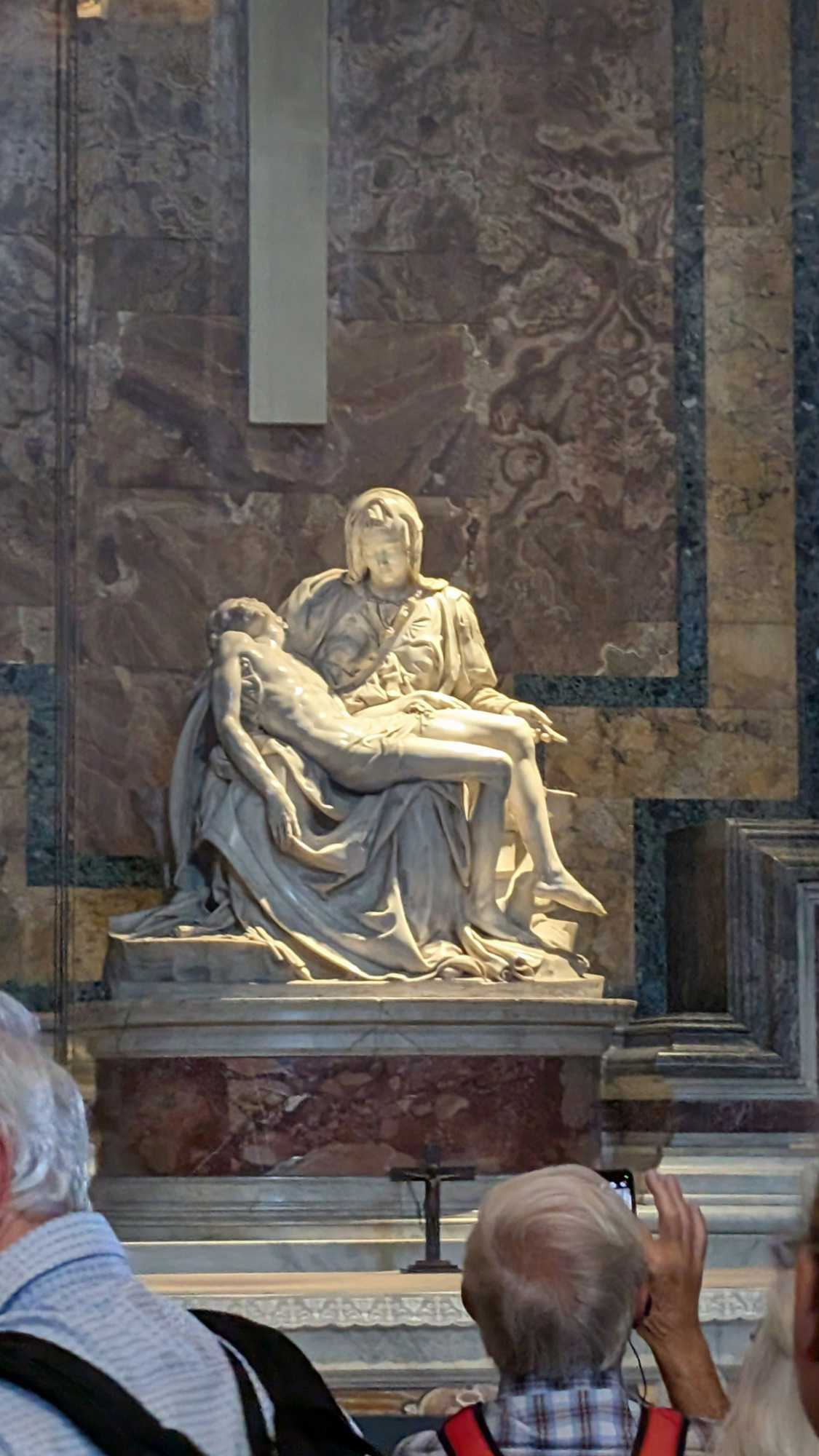 Puis, nous entrons ensuite en silence dans la basilique Saint-Pierre, la plus grande conception architecturale d’une exploration riche en découvertes. Considérée comme le cœur spirituel de l’Église catholique, La basilique est dédiée au martyre de saint Pierre, l'un des douze apôtres de Jésus-Christ fut le premier évêque d’Antioche et de Rome, donc le premier pape. Sa façade, composée de colonnes massives et de statues d’apôtres, est un chef-d’œuvre de l’architecture classique. À l’intérieur, nos regards sont immédiatement captés par les fresques, sculptures et marbres précieux, dont La Porte Sainte, cette porte ouverte par le pape François avant la messe de la veille de Noël lançant officiellement l’année jubilaire 2025 pour une durée d’un an. Parmi les trésors inestimables, la célèbre Pietà de Michel-Ange, une sublime sculpture en marbre représentant la Vierge Marie tenant le corps du Christ après la Crucifixion. C’est impossible de tout saisir en une seule visite devant un tel déploiement d’œuvres de toute sorte dont une bonne partie est ornée de feuilles d’or. Au niveau principal, le pape Jean XXIII y est également exposé, embaumé dans son cercueil. C’est également ici que se tiennent les grandes cérémonies papales, comme les messes de Noël et de Pâques, ainsi que les couronnements des papes.