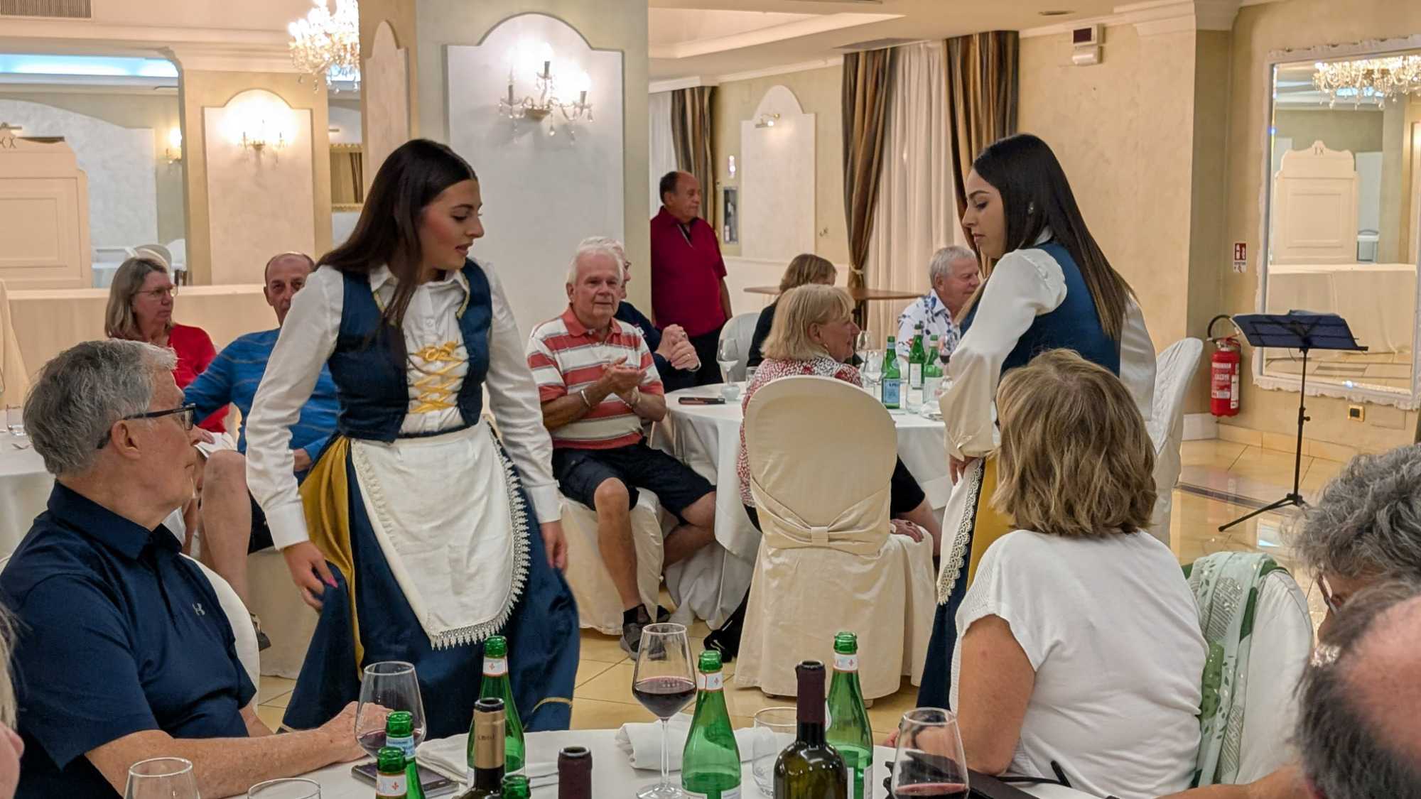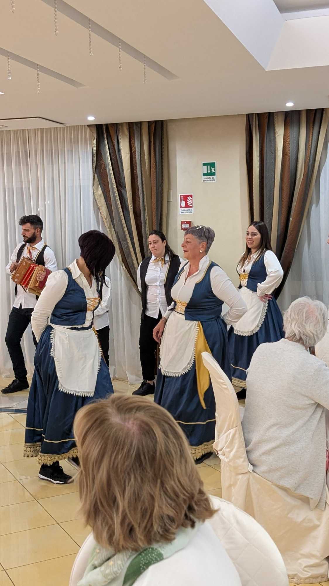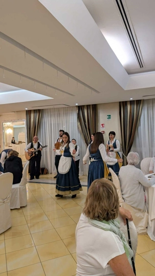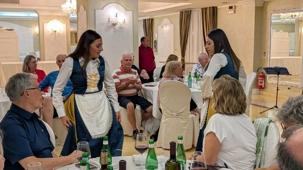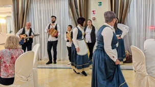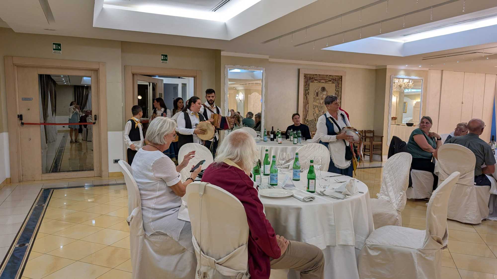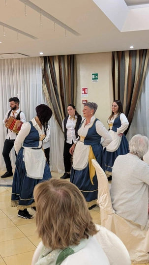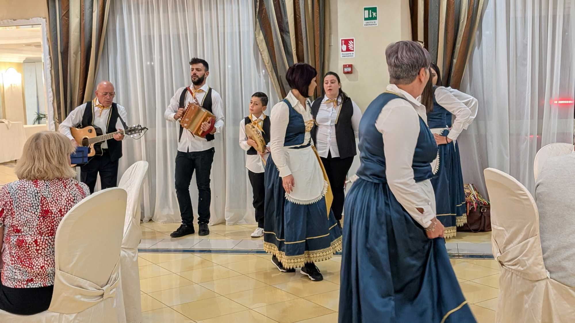 Pour conclure notre journée, une soirée traditionnelle calabraise avec une troupe extraordinaire. Nous dansons avec cette musique entrainante. Extraordinaire, tout le monde participe à cette fête endiablée. Que de joies, de plaisir, encore signé Fernando et Voyage Louise Drouin ! Bravo!