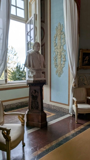 1742 fenêtres et 34 escaliers, Le Palais a ses jardins anglais, ses fontaines, ses cascades, ses étangs, ses sculptures, ses terrains boisés et un complexe industriel pour sa production de soie.