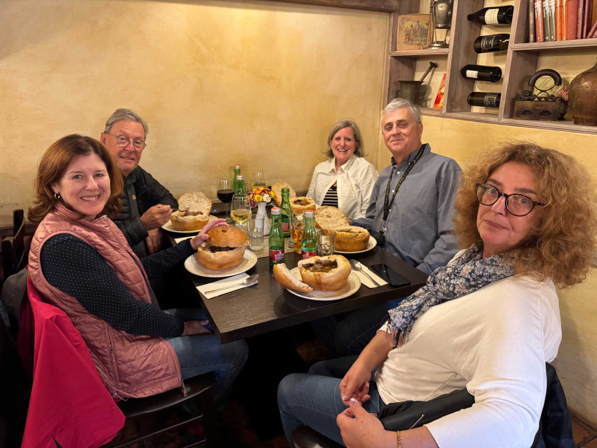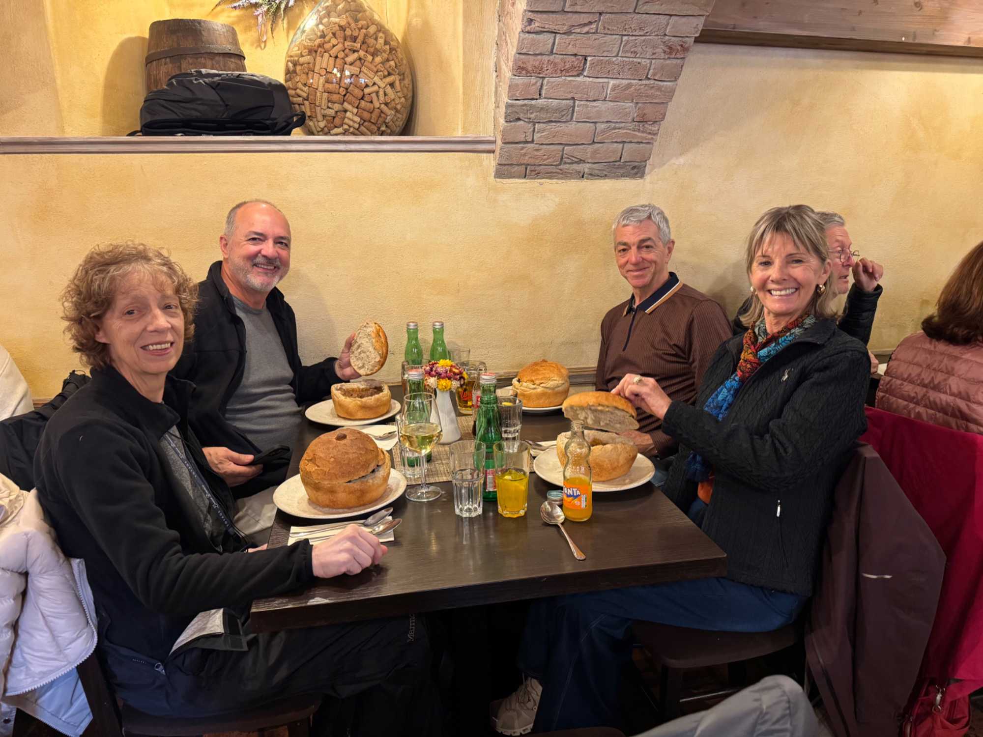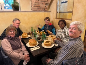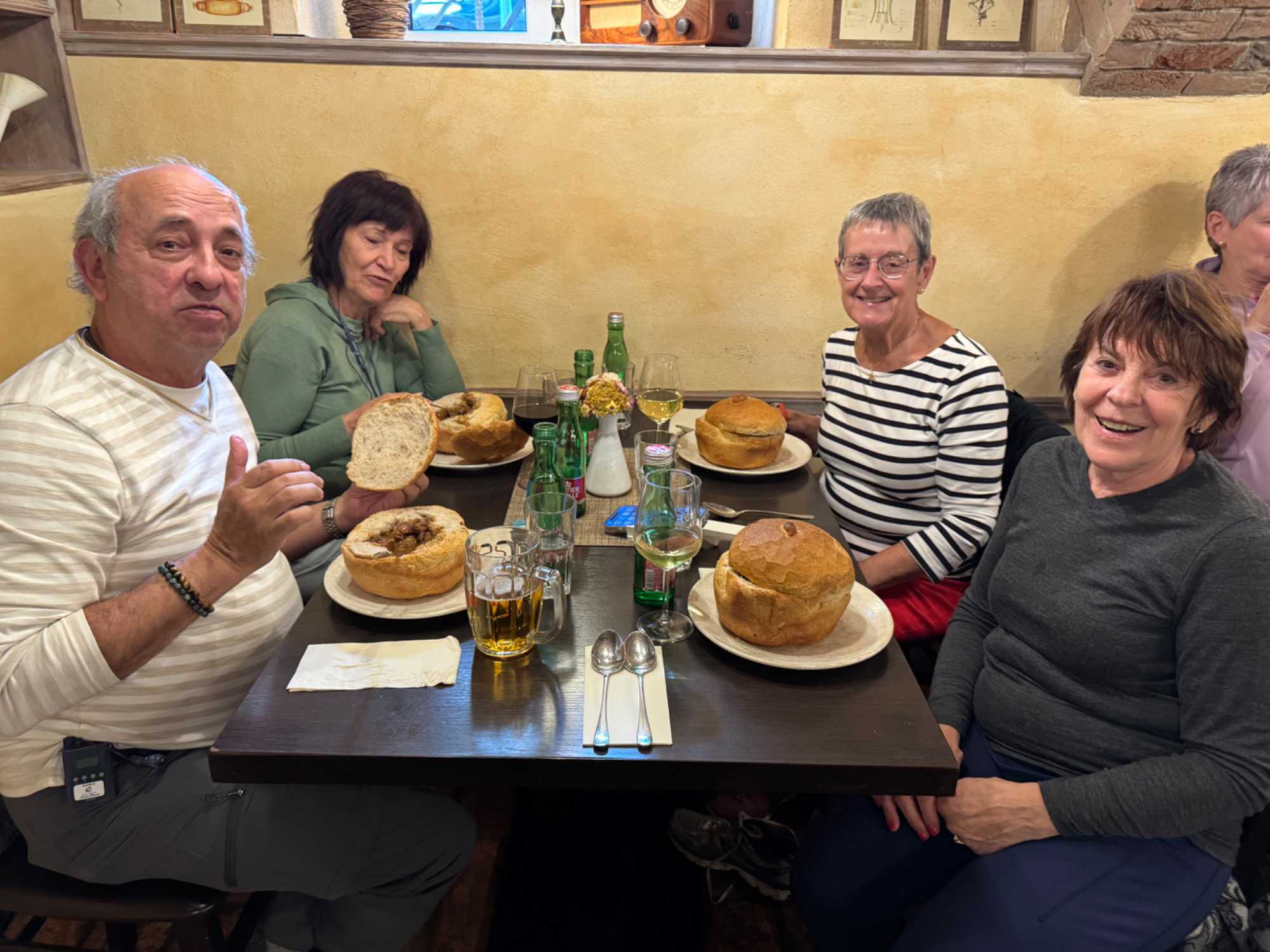 Après un moment de temps libre, il est temps de savourer un bon repas dans l’un des restaurants de la vieille ville. Nous nous rendons au restaurant Hiža pod Gradom. Nous mangeons un plat de polenta frite avec une sauce aux champignons et des graines de courge. Nous poursuivons avec un goulash de Ljubljana servi dans une tasse de pain, un confort parfait avant de passer au dessert. En fin de repas, nous partageons une gibanica, une pâtisserie traditionnelle en multicouches, remplie de graines de pavot, de noix, de pommes, de raisins et de fromage blanc. Chaque bouchée est un délice, et nous nous réjouissons de découvrir ces saveurs locales.