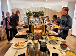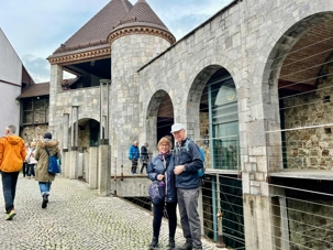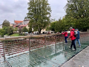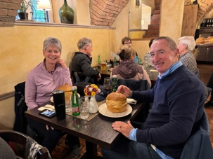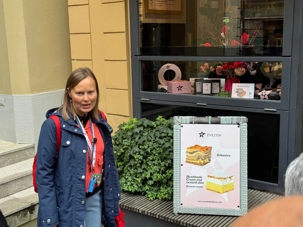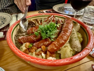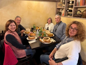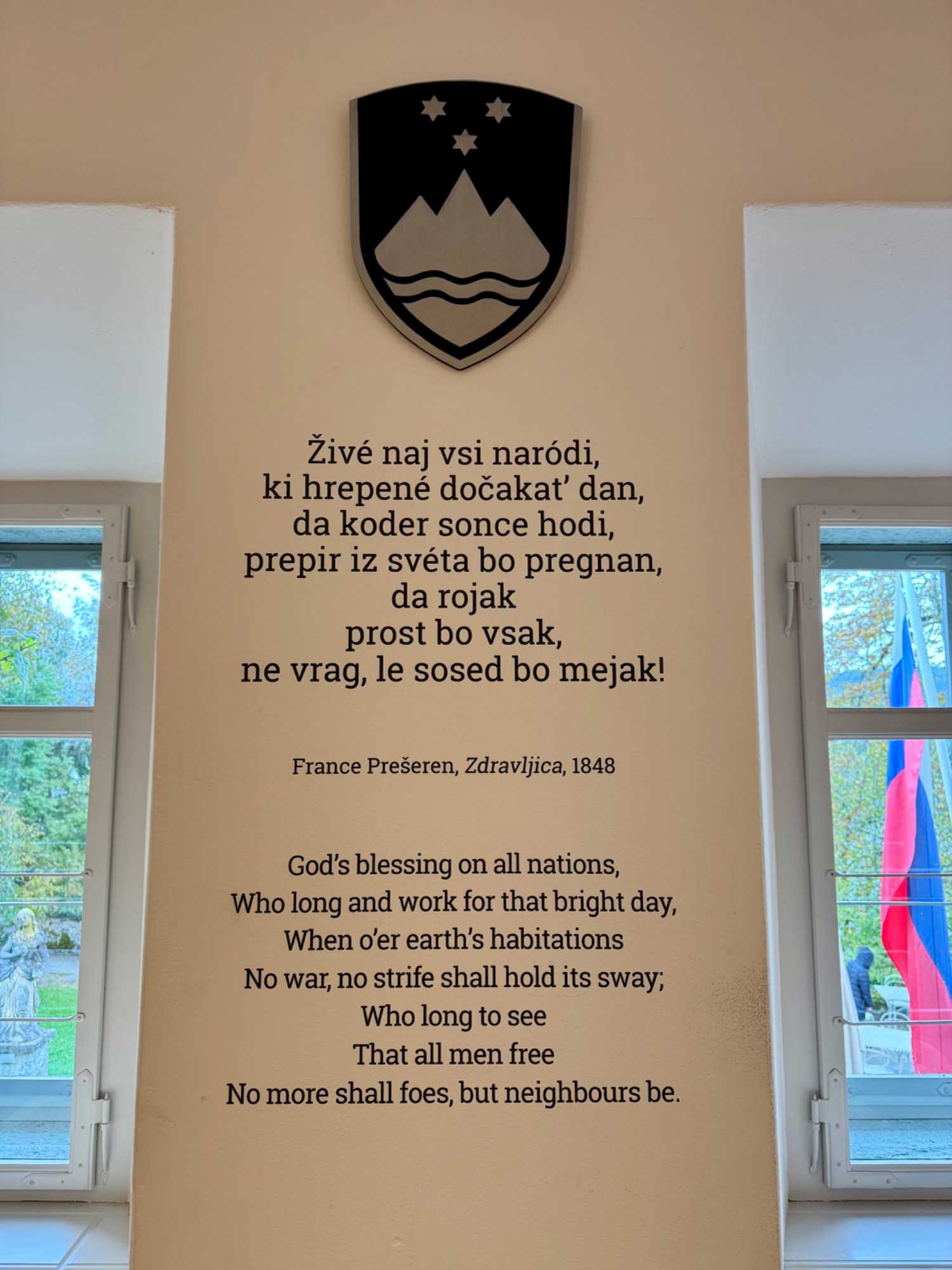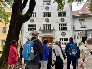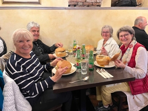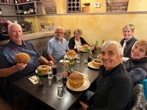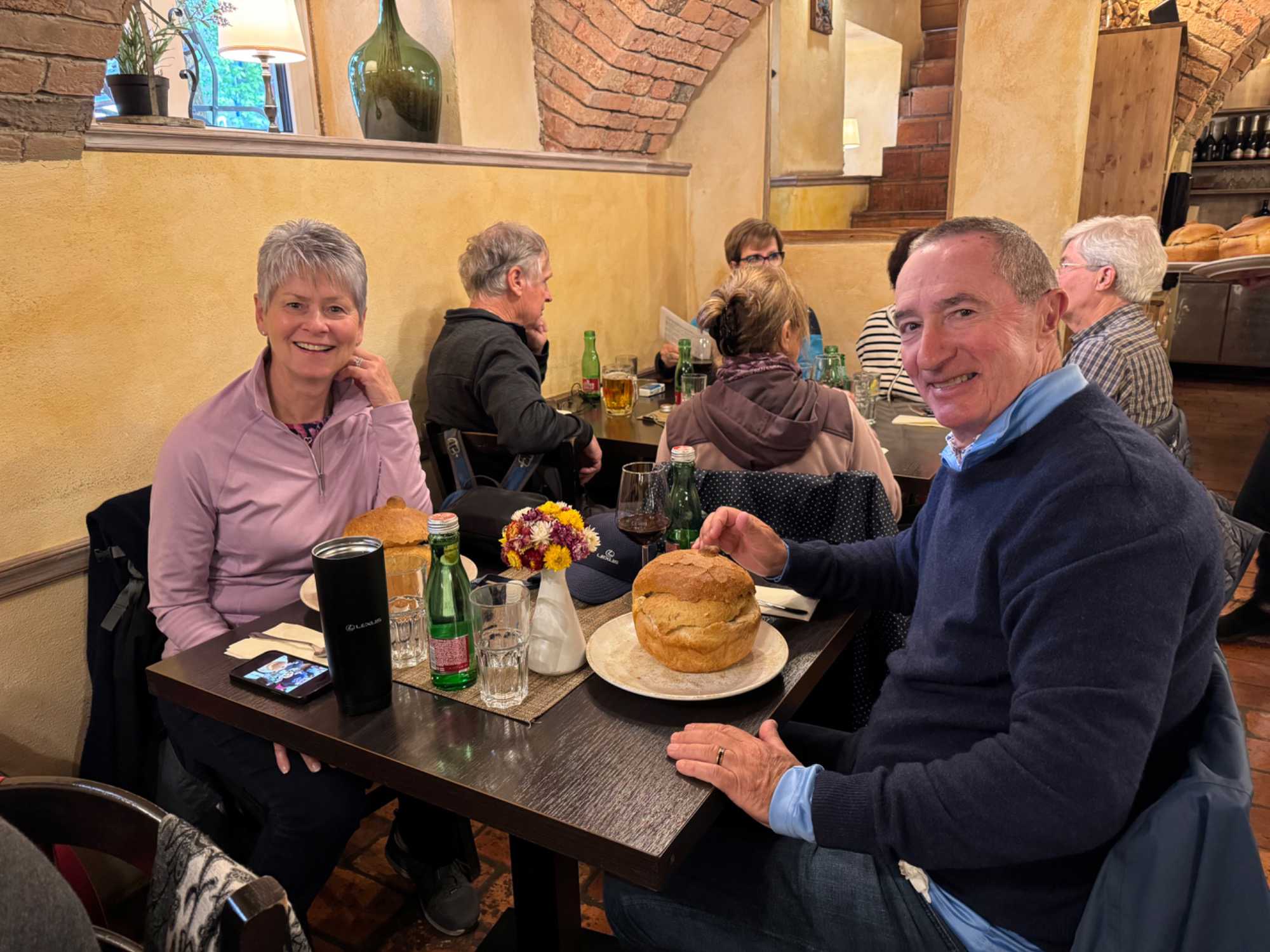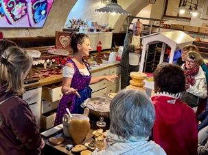 Après un moment de temps libre, il est temps de savourer un bon repas dans l’un des restaurants de la vieille ville. Nous nous rendons au restaurant Hiža pod Gradom. Nous mangeons un plat de polenta frite avec une sauce aux champignons et des graines de courge. Nous poursuivons avec un goulash de Ljubljana servi dans une tasse de pain, un confort parfait avant de passer au dessert. En fin de repas, nous partageons une gibanica, une pâtisserie traditionnelle en multicouches, remplie de graines de pavot, de noix, de pommes, de raisins et de fromage blanc. Chaque bouchée est un délice, et nous nous réjouissons de découvrir ces saveurs locales.