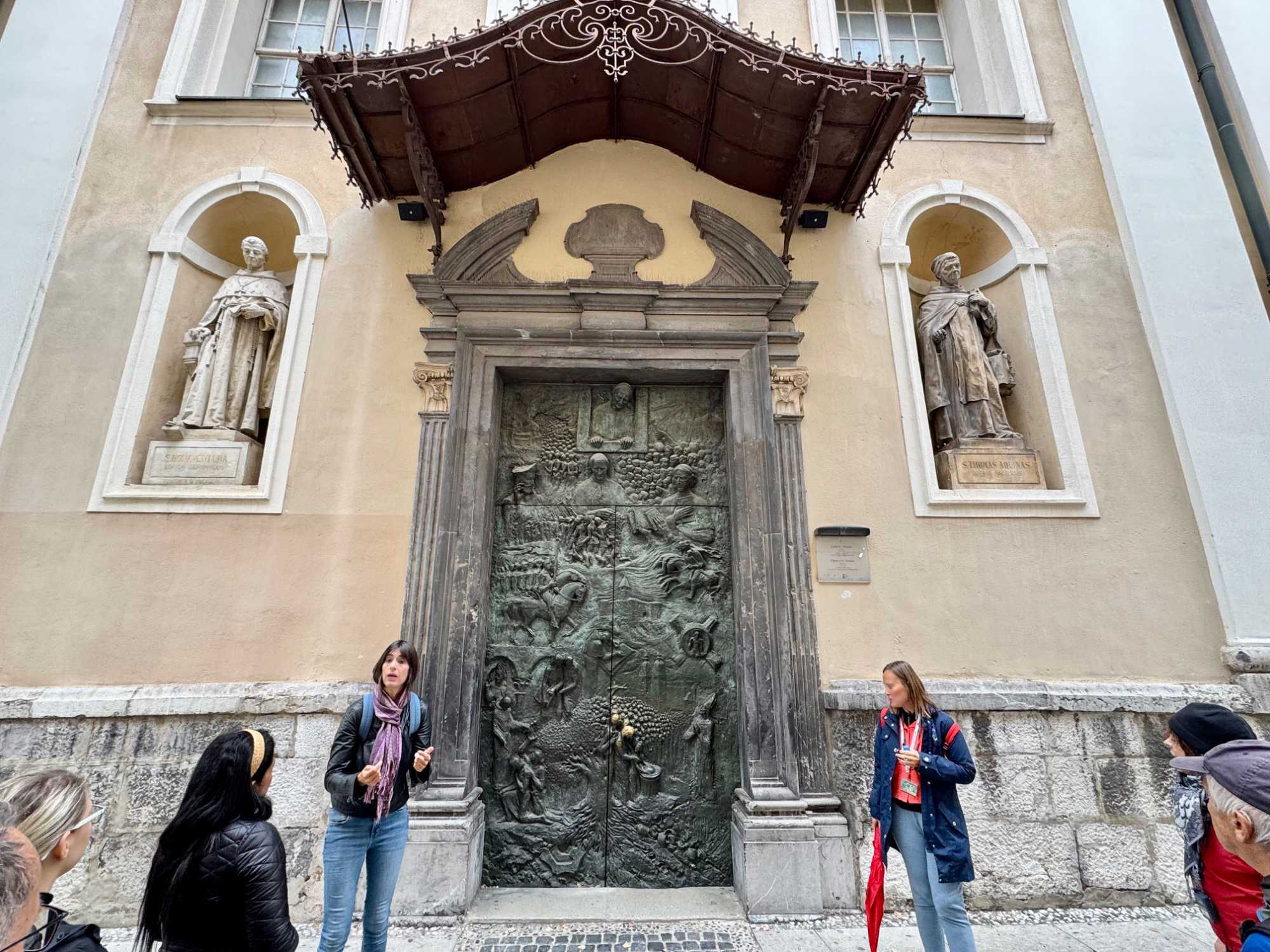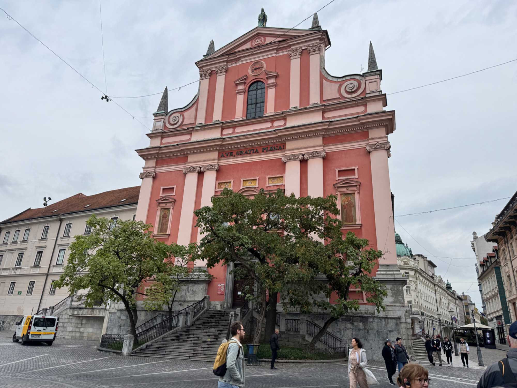 Nous embarquons à bord du petit train touristique à Ljubljana, prêts à explorer les merveilles de la ville. L’ambiance est décontractée et familiale. Le conducteur nous accueille avec le sourire et nous explique que cette visite nous fera découvrir les principales attractions de la capitale slovène. Ce trajet de 1h15 nous permet d’admirer les beautés de la ville tout en nous offrant un peu de répit. Le train démarre, et notre première halte est au château de Ljubljana qui surplombe la ville depuis 900 ans. À partir de la tour d’observation, les panoramas sur Ljubljana et ses alentours sont absolument spectaculaires. Nous admirons la vue depuis ses murs médiévaux. Le château, perché sur une colline, offre un panorama spectaculaire sur la ville et les montagnes environnantes. Nous sortons prendre quelques photos avant de remonter à bord afin de poursuivre notre route. Nous passons devant la cathédrale Saint-Nicolas, avec son dôme vert et ses ornements baroques, elle attire forcément notre attention. Le conducteur nous parle de son histoire fascinante, y compris des œuvres d’art à l’intérieur, comme le fameux maître-autel. Nous profitons de ce moment pour nous imprégner de la beauté de l’architecture environnante.