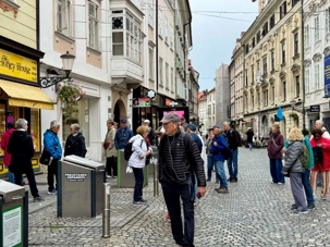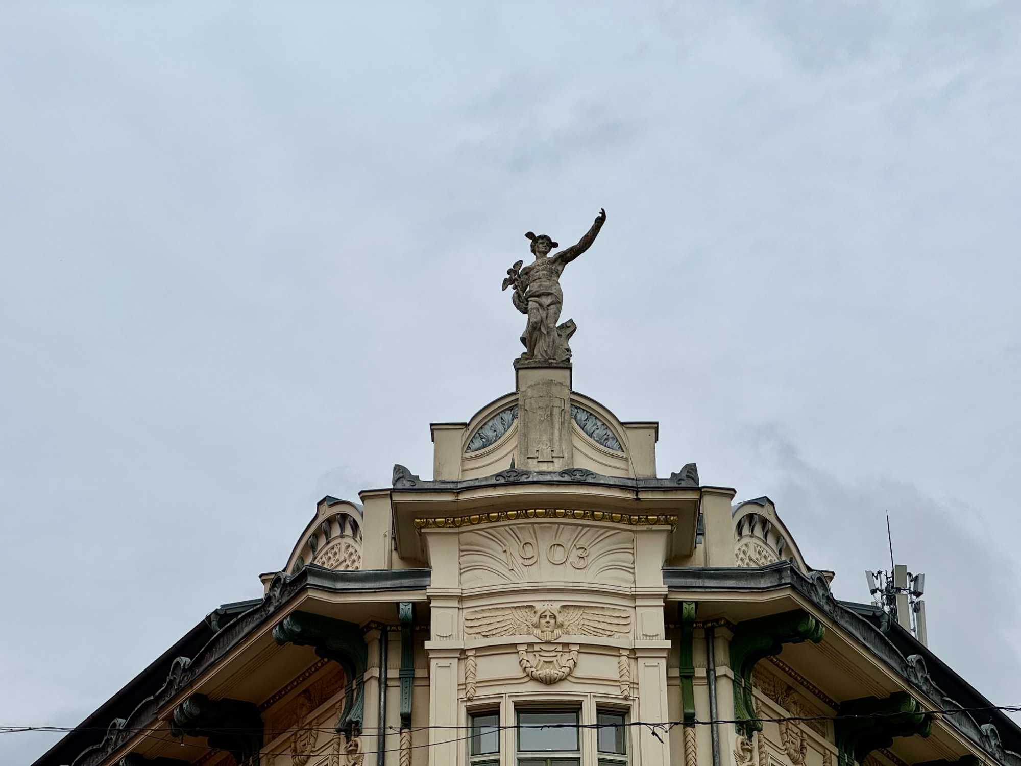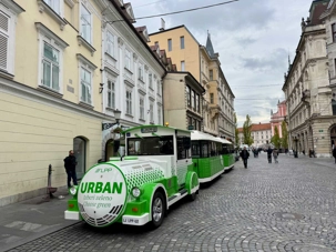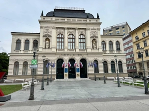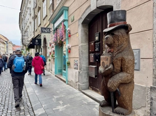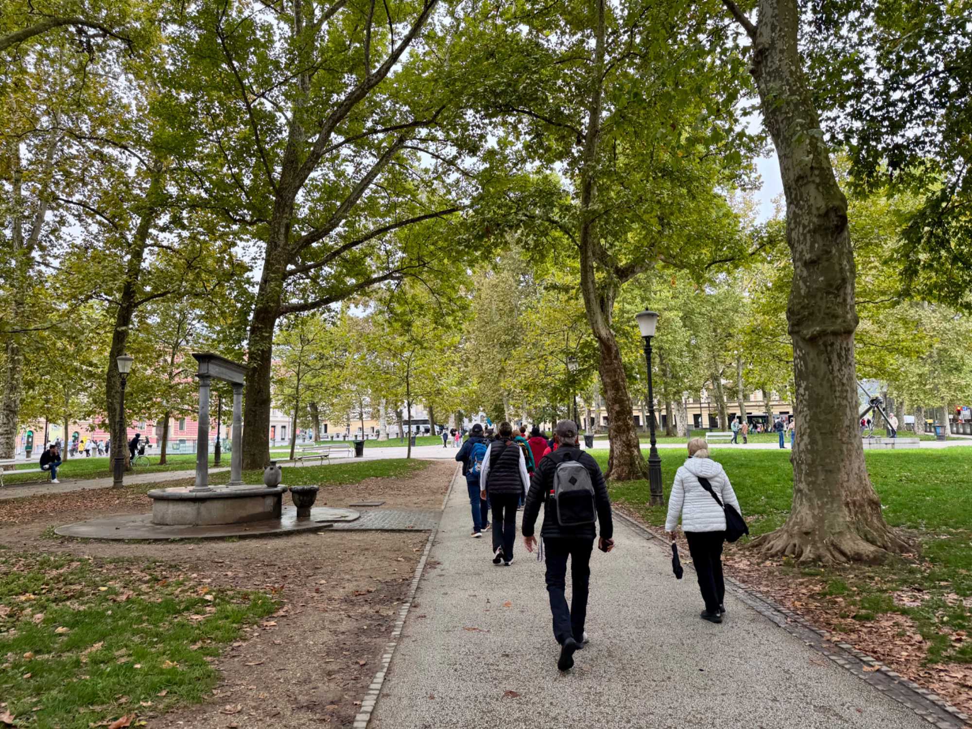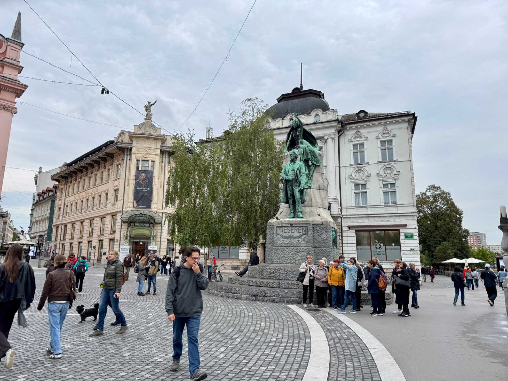 Le petit train poursuit son chemin vers la place Prešeren, le cœur de Ljubljana. Là, nous admirons la célèbre statue de France Prešeren, poète slovène. Nous prenons quelques instants pour explorer les environs, où des cafés et boutiques locales ajoutent à l’ambiance vivante.