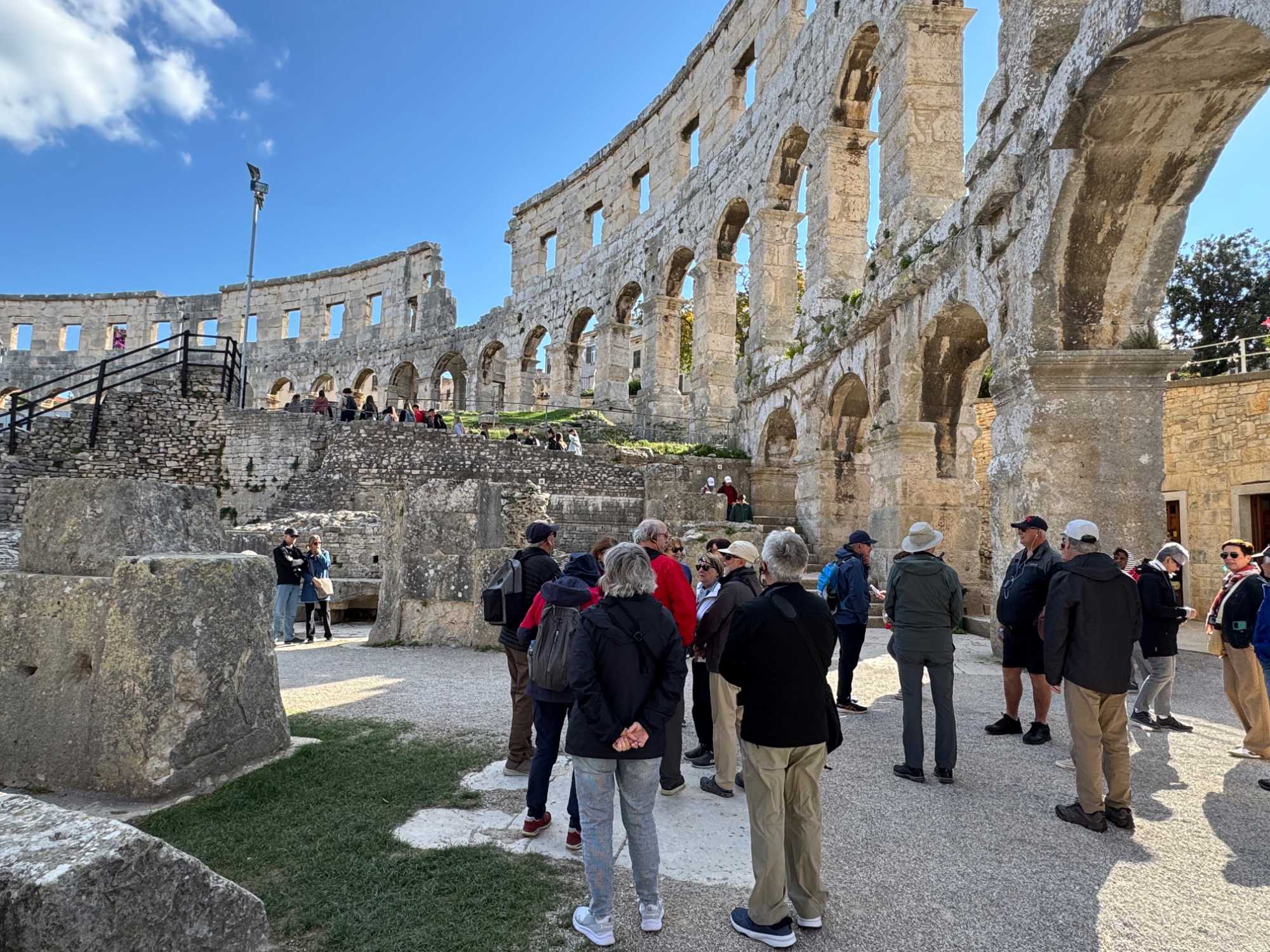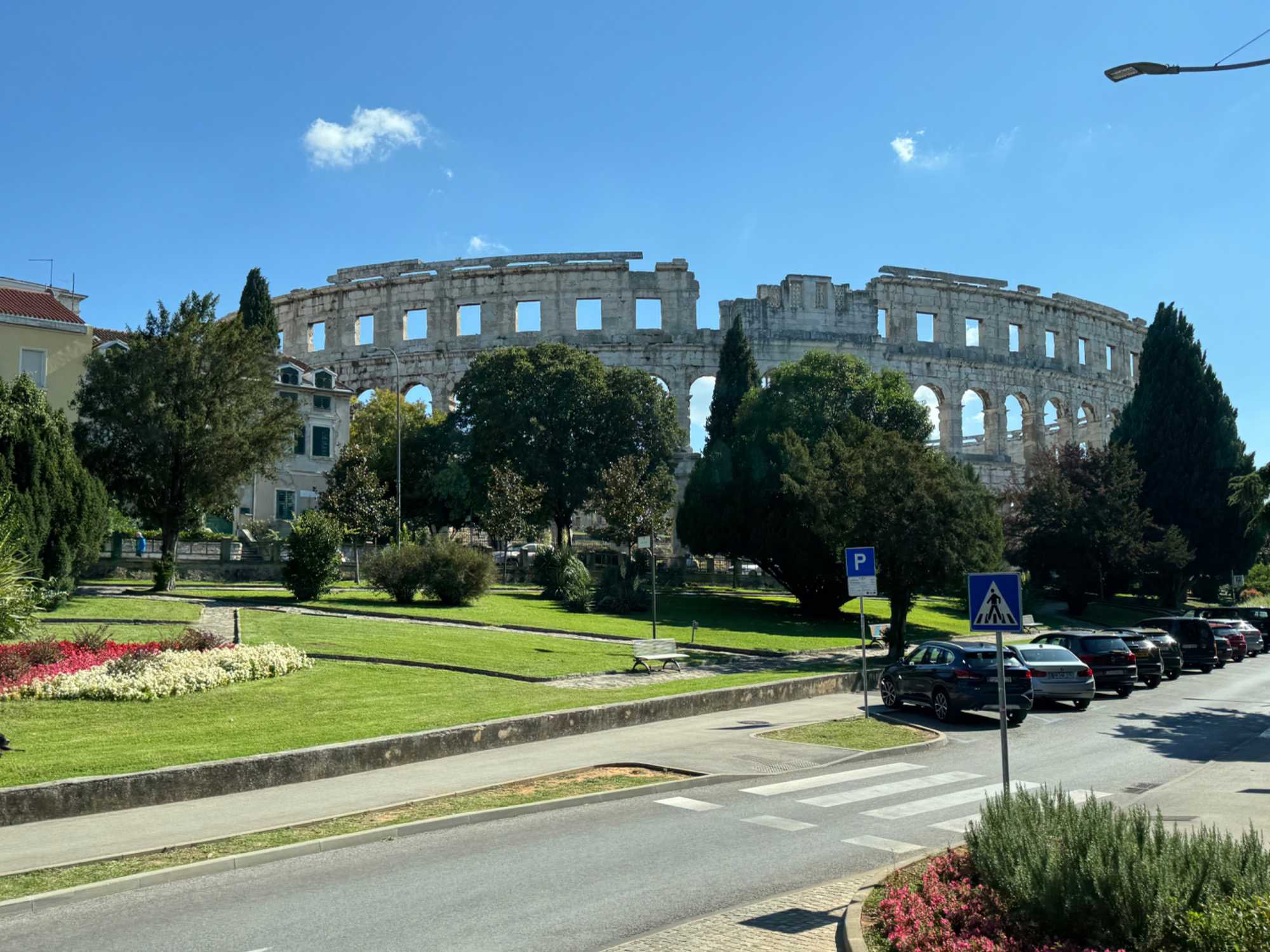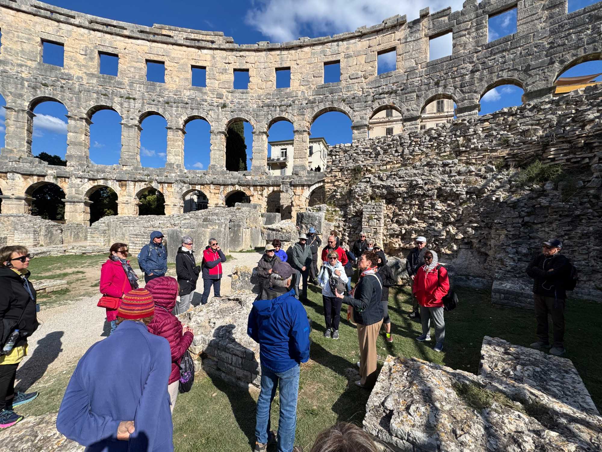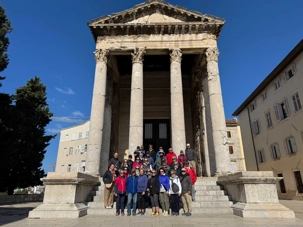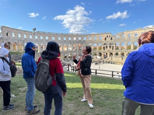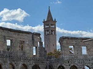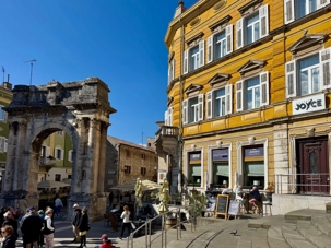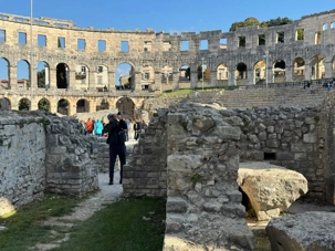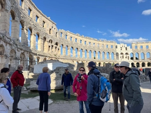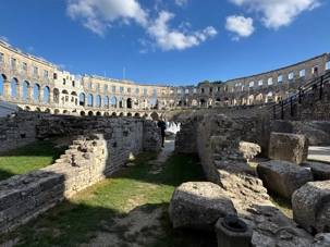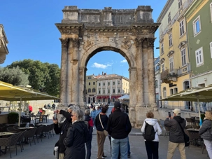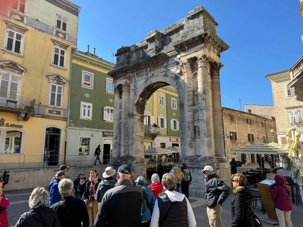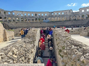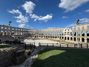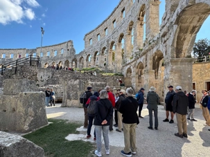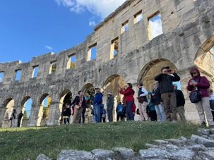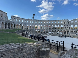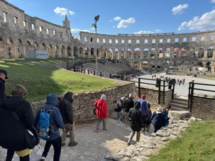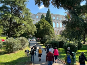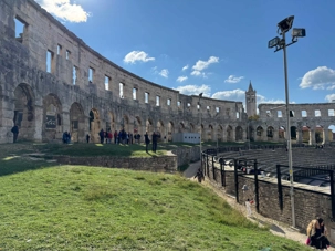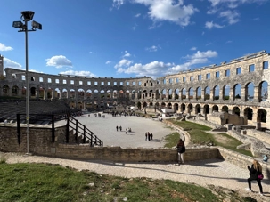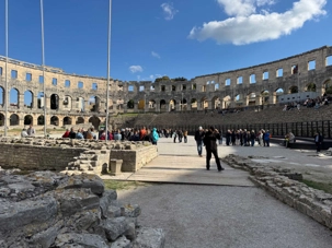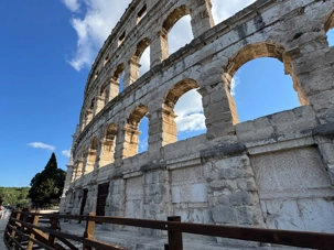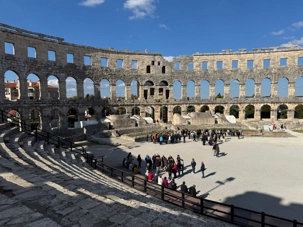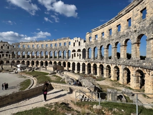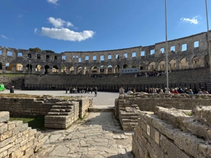 Notre voyage débute sur une route panoramique sous un soleil radieux. Après deux heures de route splendide, nous atteignons notre première destination de la journée : Pula. C’est la plus grande ville de l’Istrie, bien que le centre administratif se trouve à Pazin. Renommée pour ses monuments romains, Pula nous éblouit dès notre arrivée.