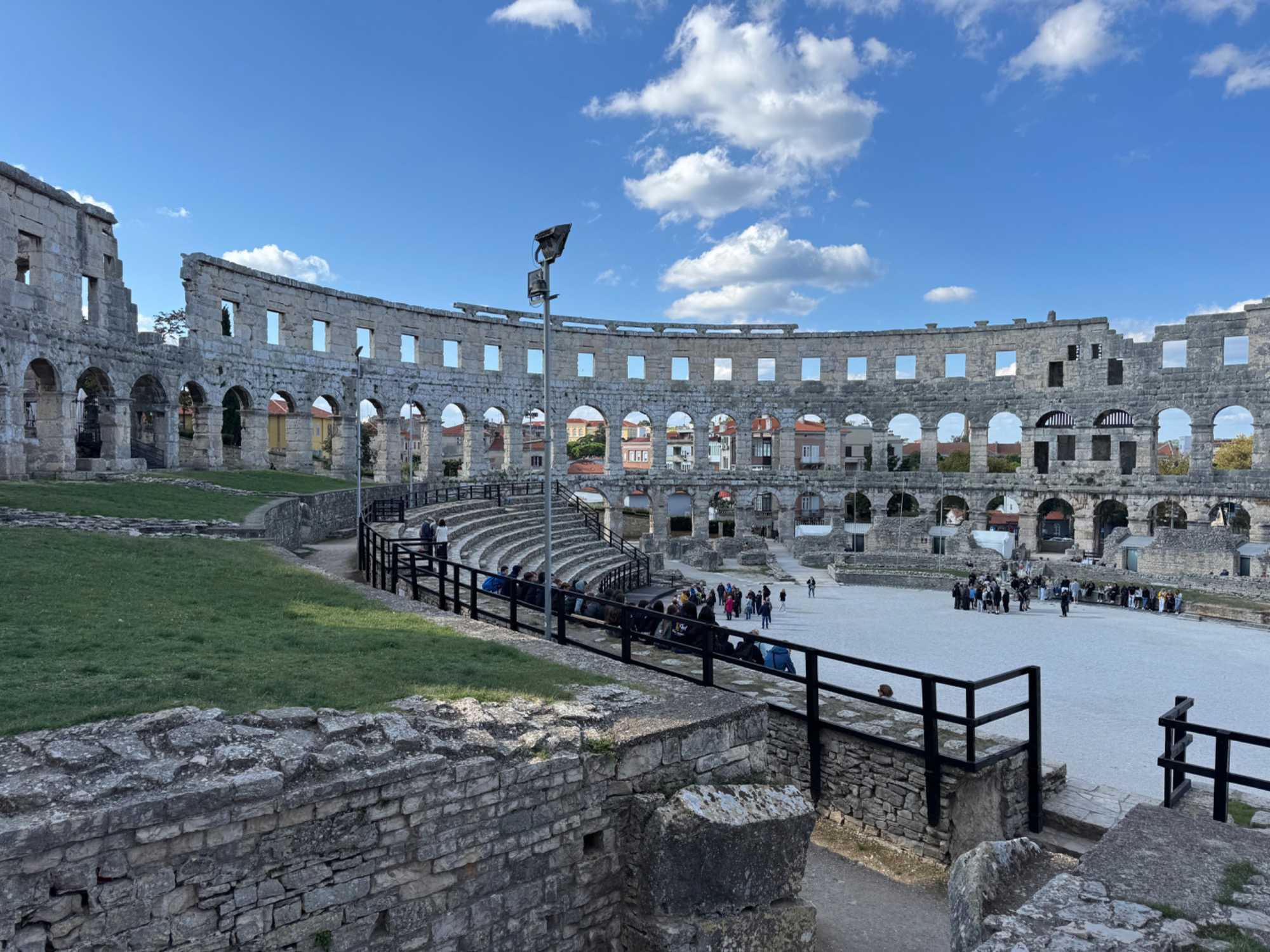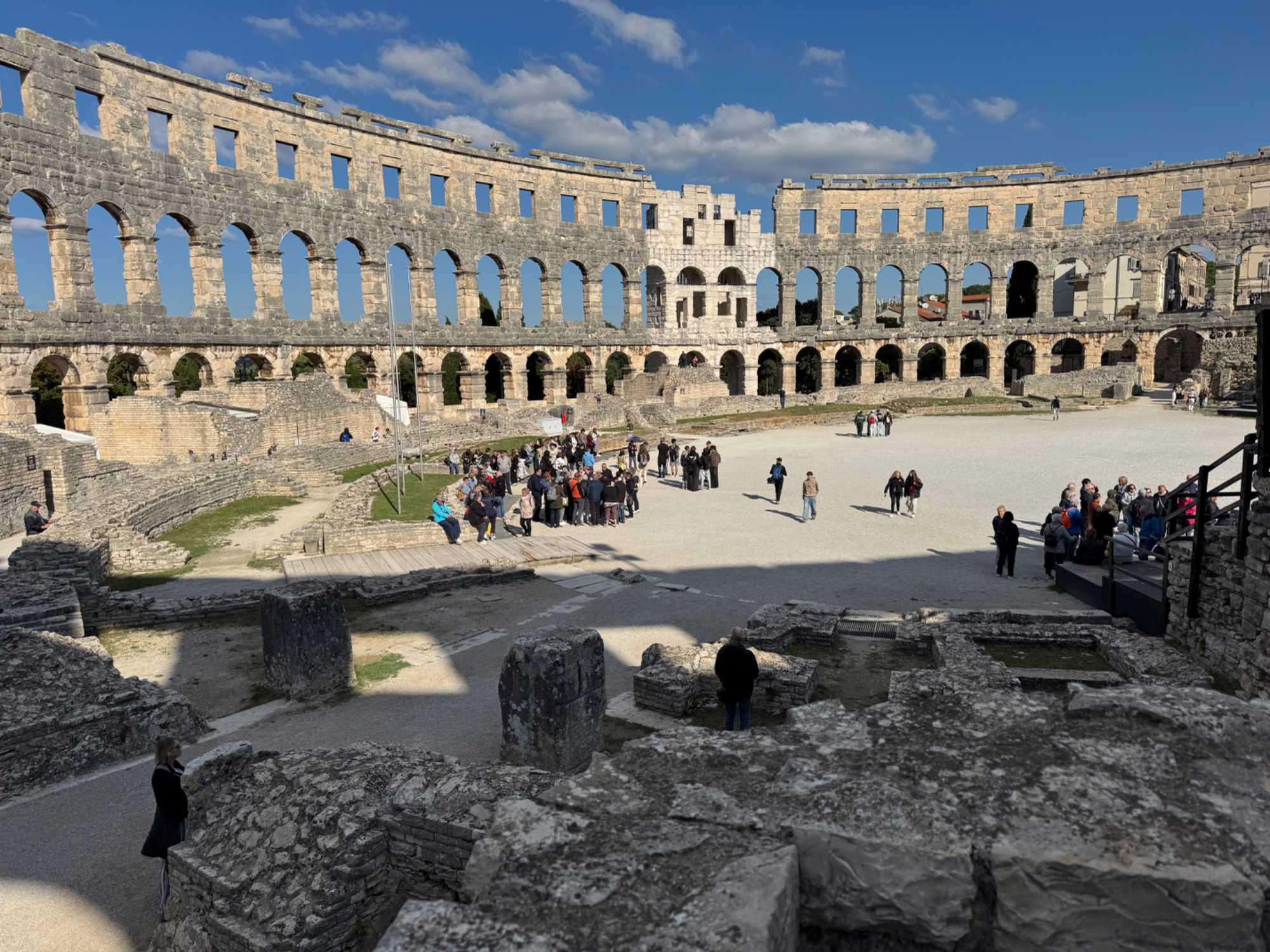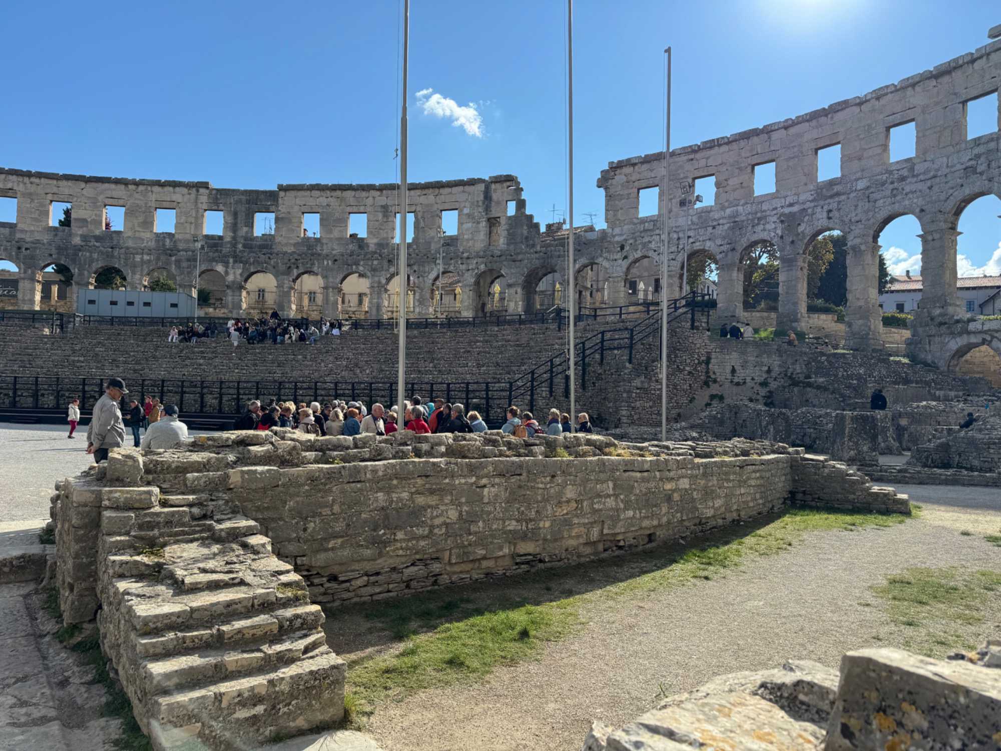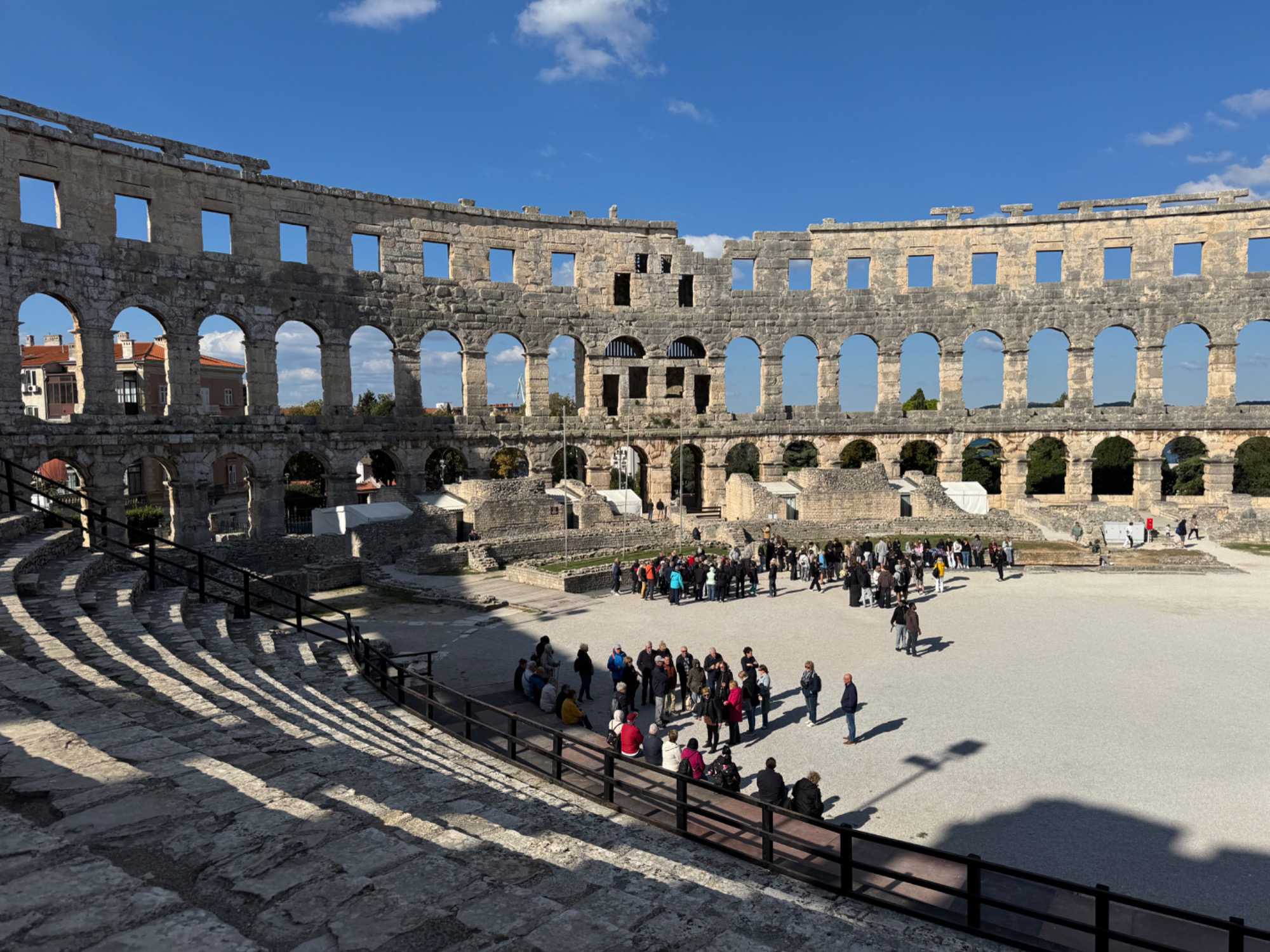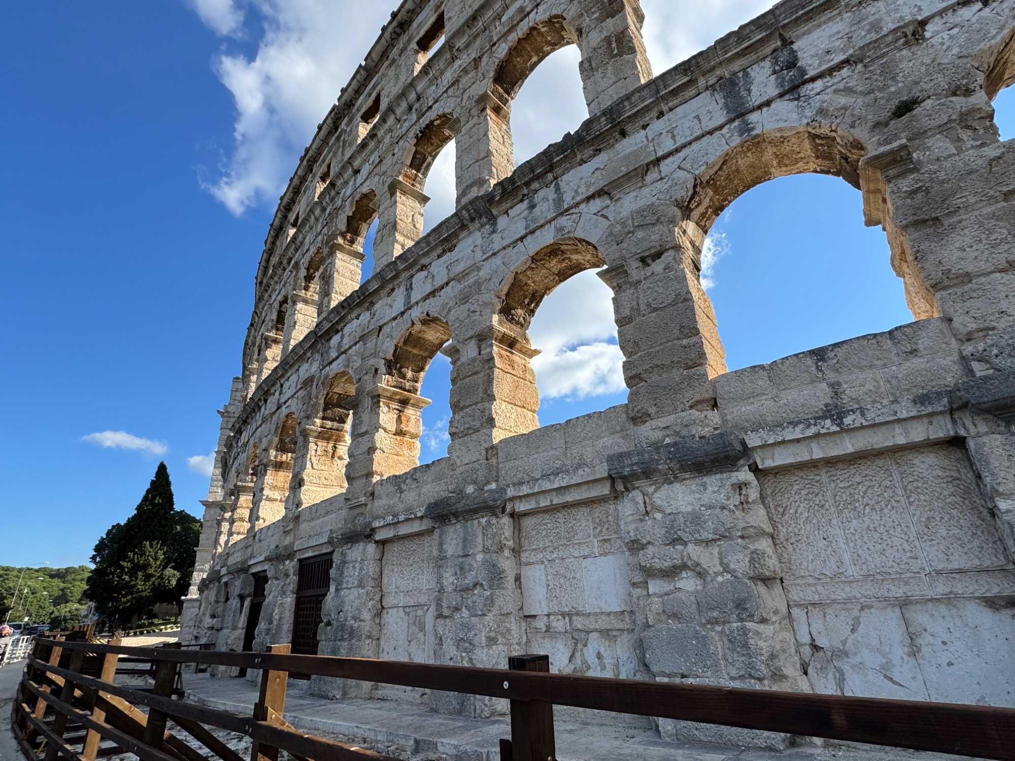 Notre voyage débute sur une route panoramique sous un soleil radieux. Après deux heures de route splendide, nous atteignons notre première destination de la journée : Pula. C’est la plus grande ville de l’Istrie, bien que le centre administratif se trouve à Pazin. Renommée pour ses monuments romains, Pula nous éblouit dès notre arrivée.