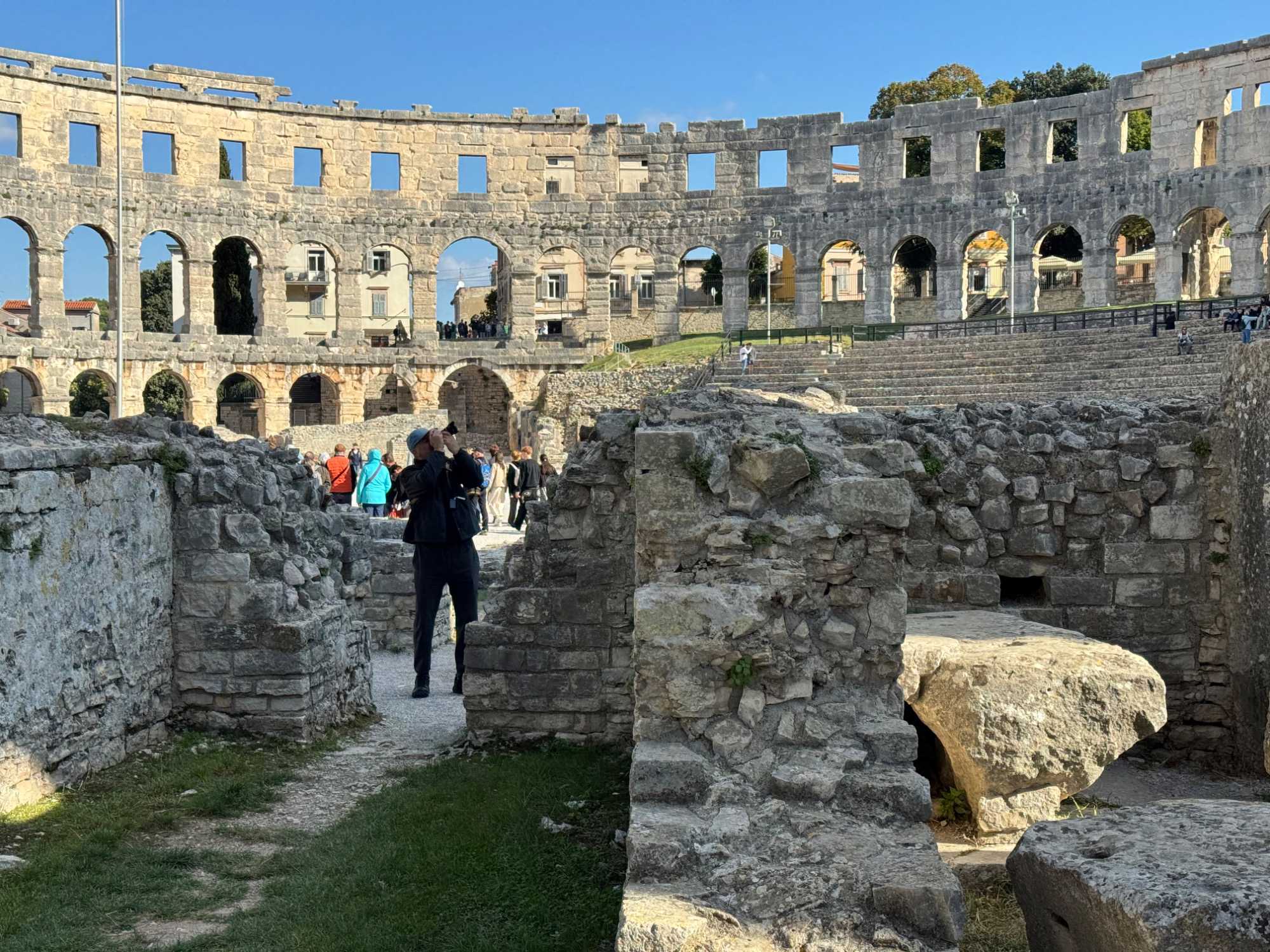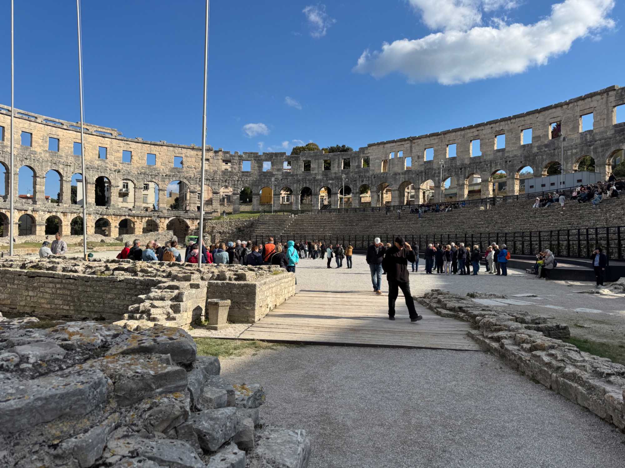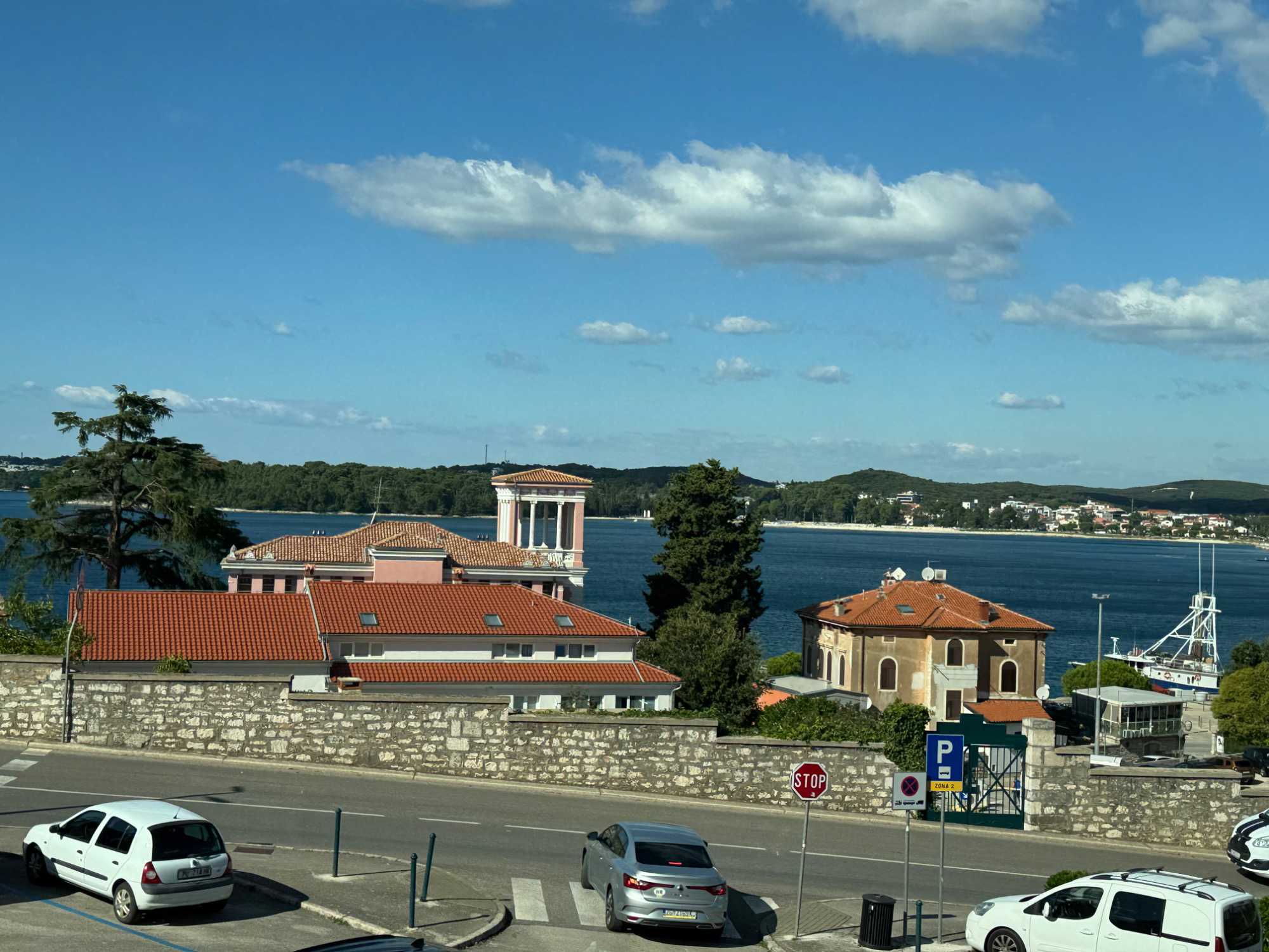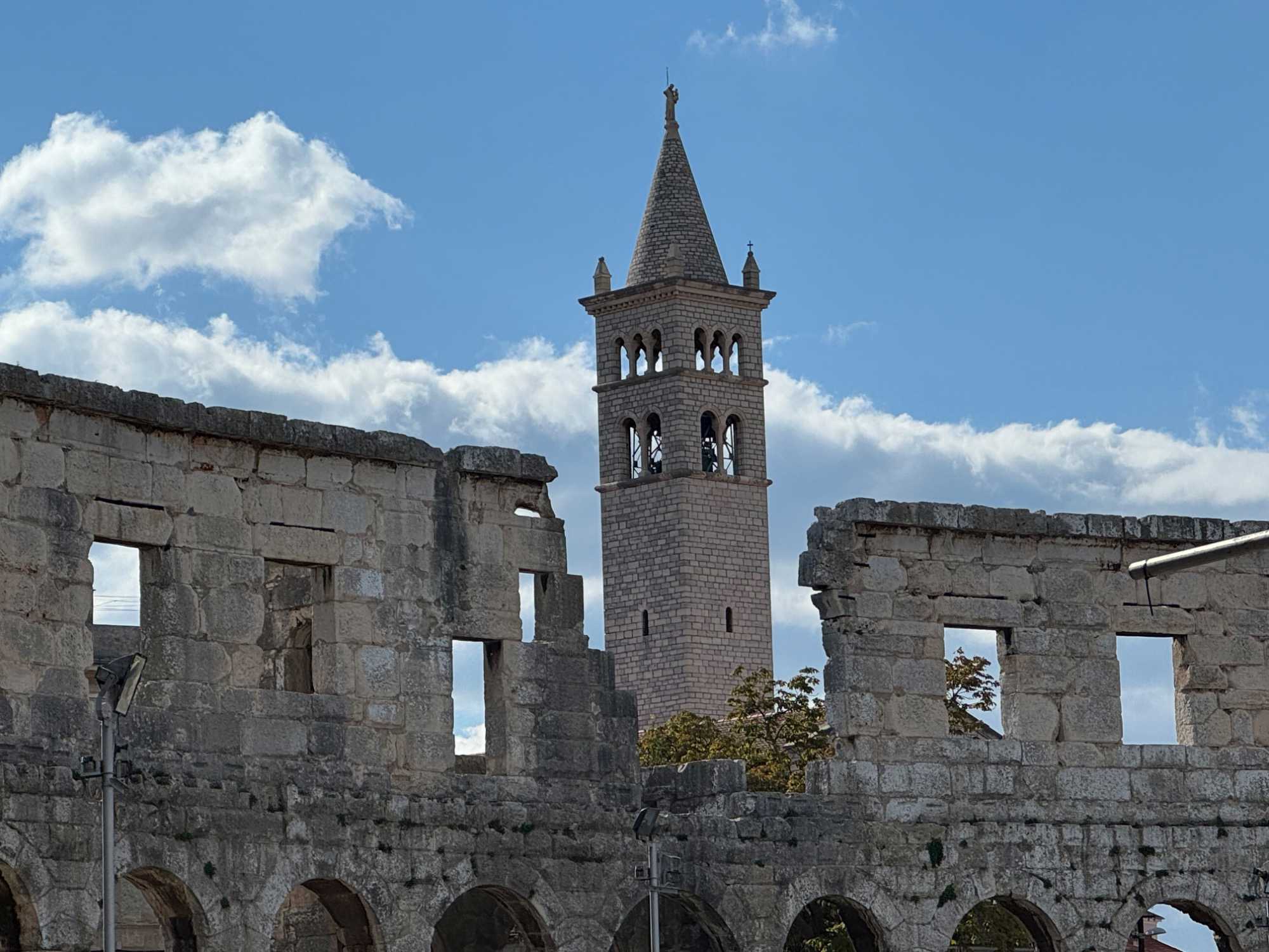 Notre voyage débute sur une route panoramique sous un soleil radieux. Après deux heures de route splendide, nous atteignons notre première destination de la journée : Pula. C’est la plus grande ville de l’Istrie, bien que le centre administratif se trouve à Pazin. Renommée pour ses monuments romains, Pula nous éblouit dès notre arrivée.