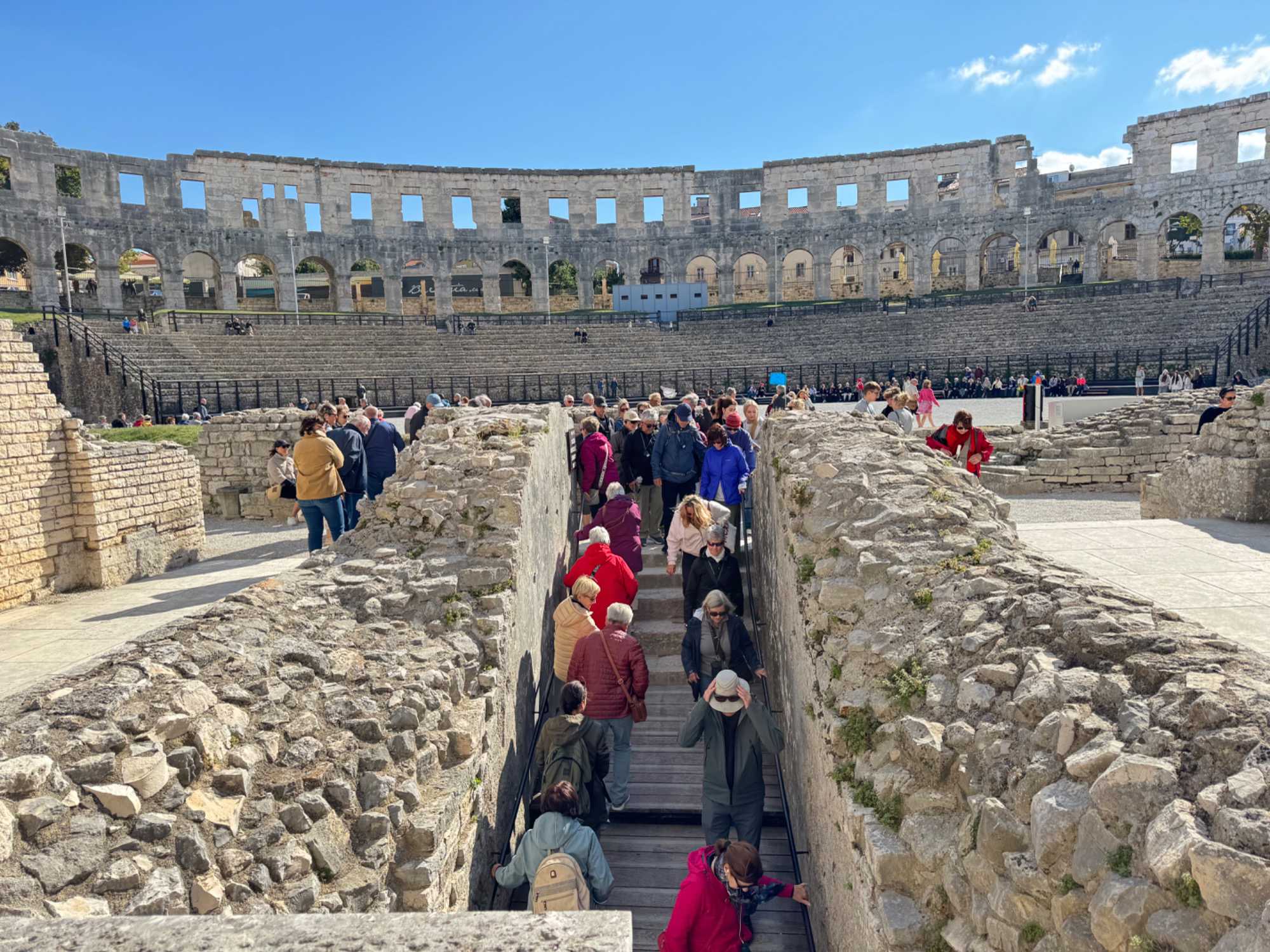 Une fois dans le vieux port, nous nous dirigeons vers l’amphithéâtre romain, l’un des mieux conservés d’Europe. Construit sous le règne de l’empereur Claude et agrandi par Flavien en 79, cet amphithéâtre pouvait accueillir plus de 23 000 spectateurs pour des spectacles de gladiateurs et des batailles navales. Aujourd’hui, il est le cadre de concerts, d’opéras et de pièces de théâtre, tandis que les anciens souterrains, autrefois réservés aux fauves, accueillent une exposition dédiée à la culture de la vigne et de l’olivier.