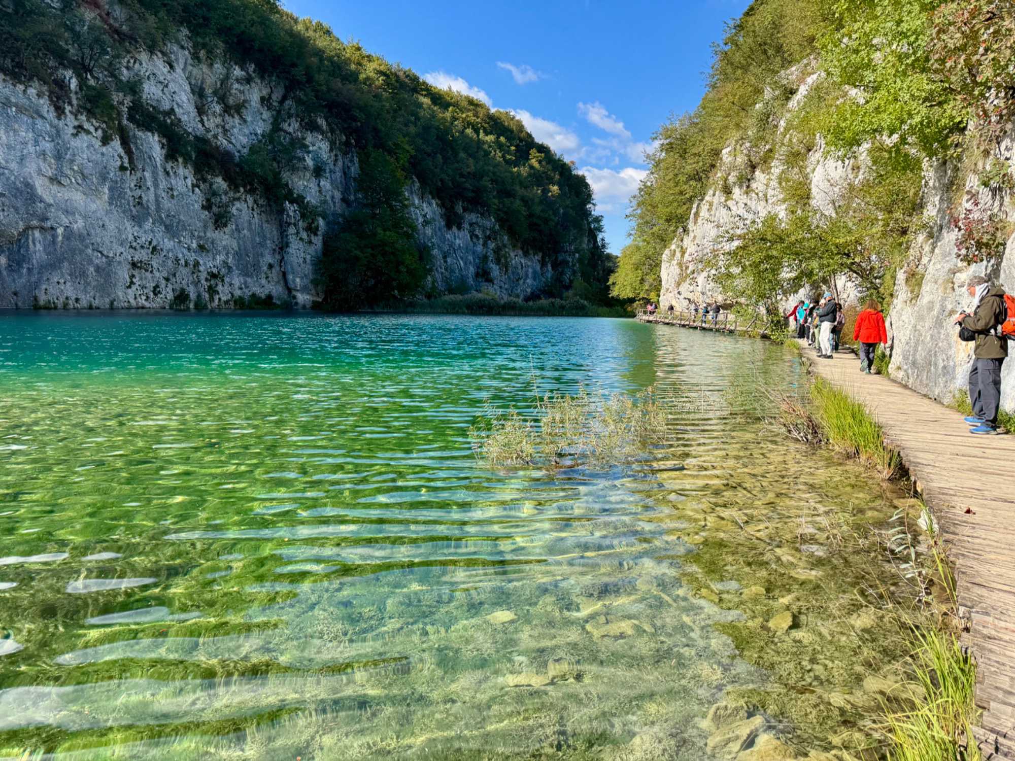 C’est par une splendide journée ensoleillée que nous entreprenons une des excursions les plus emblématiques de la Croatie : la visite des lacs et des cascades de Plitvice. S’il y a une journée où nous souhaitons avoir du soleil, c’est aujourd’hui. Nous avons la chance de bénéficier d’un ciel dégagé avec un soleil resplendissant et une température idéale de 10 degrés C; parfait pour cette immersion en pleine nature et une randonnée de quelques kilomètres !