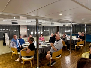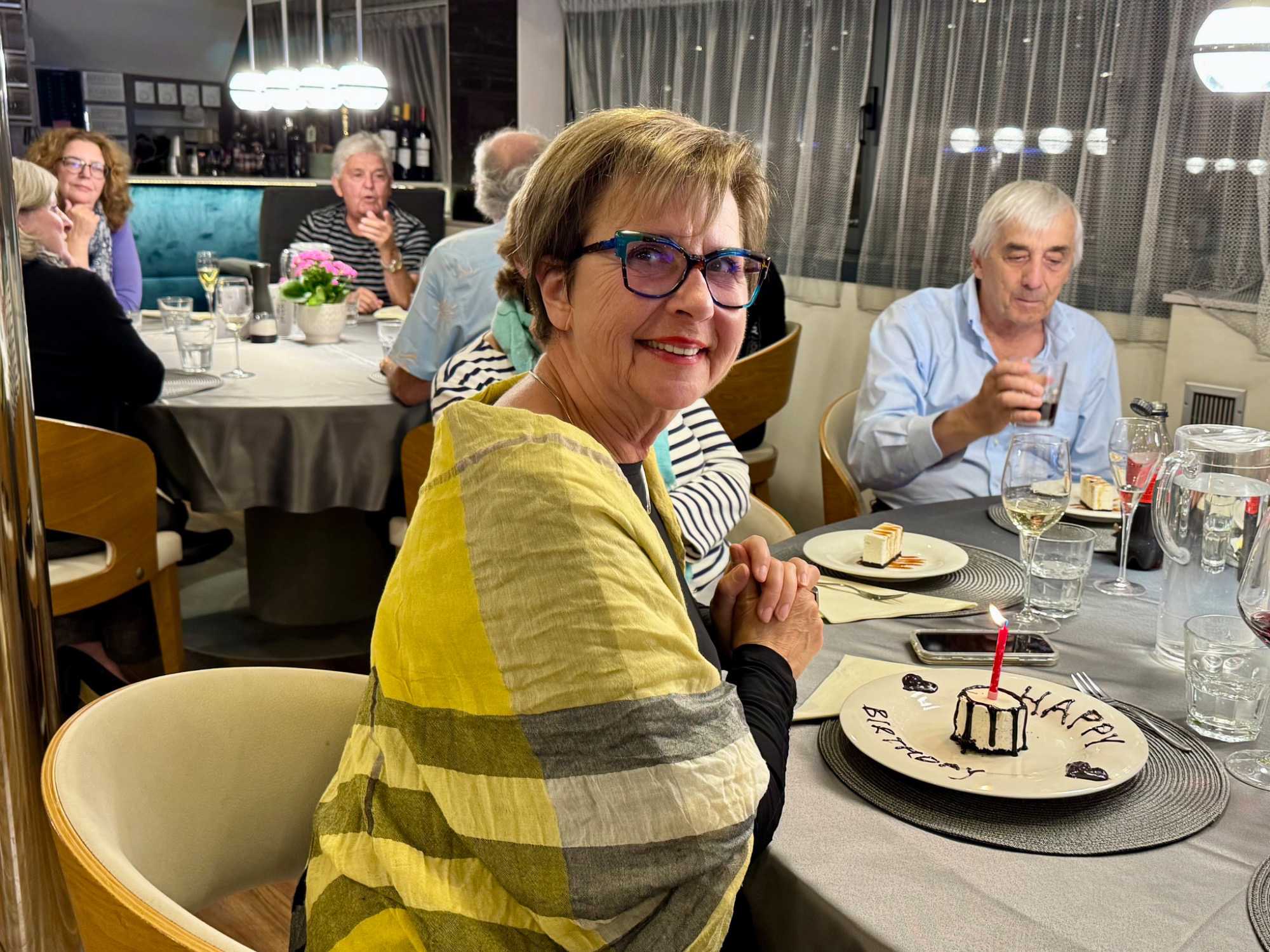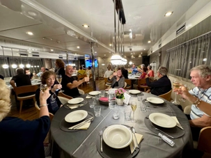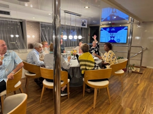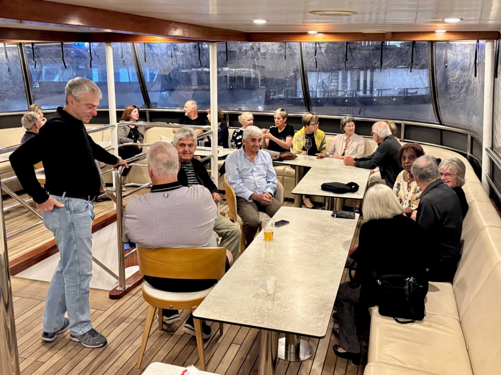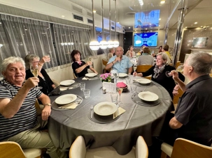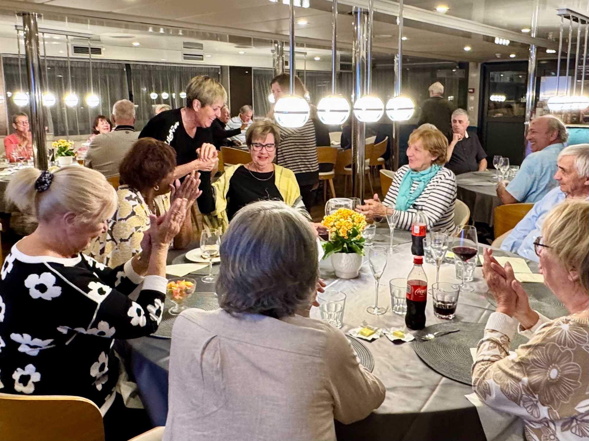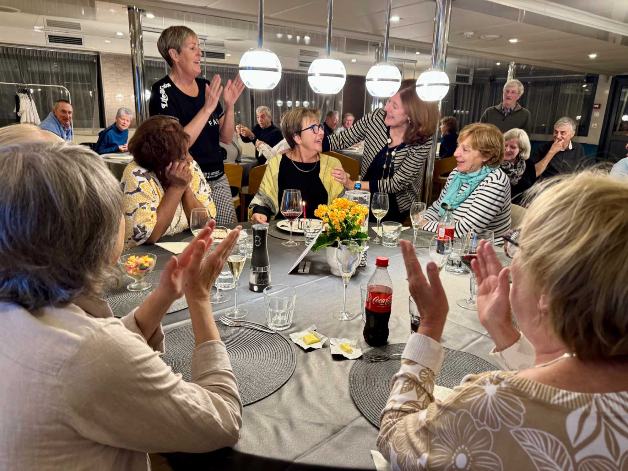 Pour notre premier souper à bord, nous sommes tous réunis, savourant des mets raffinés. Nous en profitons aussi pour célébrer l’anniversaire de naissance de Christiane et lui chanter nos souhaits de bonne fête. Après le repas, certains choisissent de descendre du navire pour une promenade dans les environs, tandis que d’autres profitent des installations à bord ou se dirigent vers leurs cabines pour un repos bien mérité.