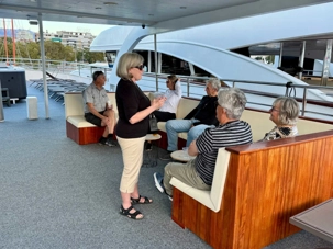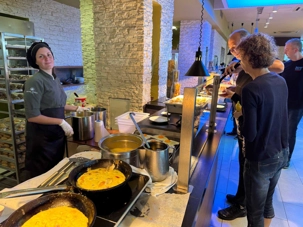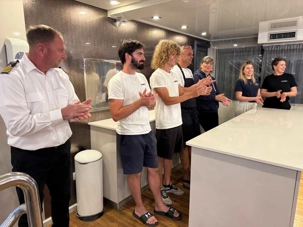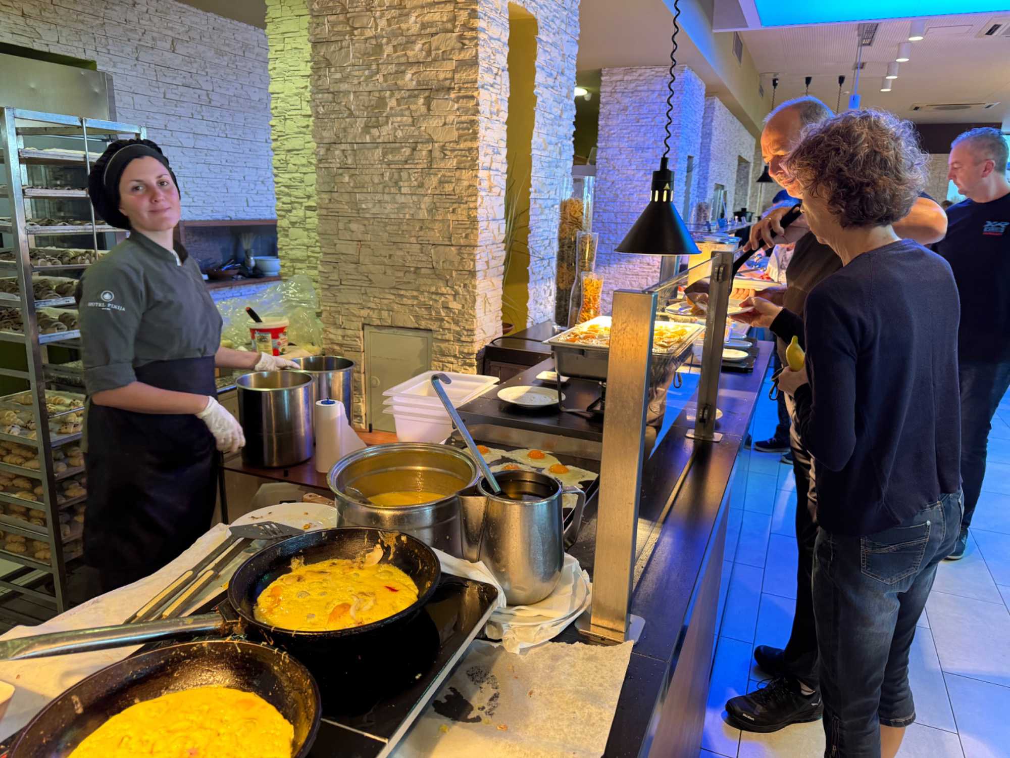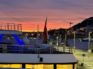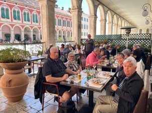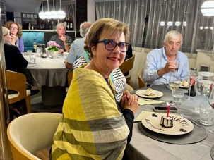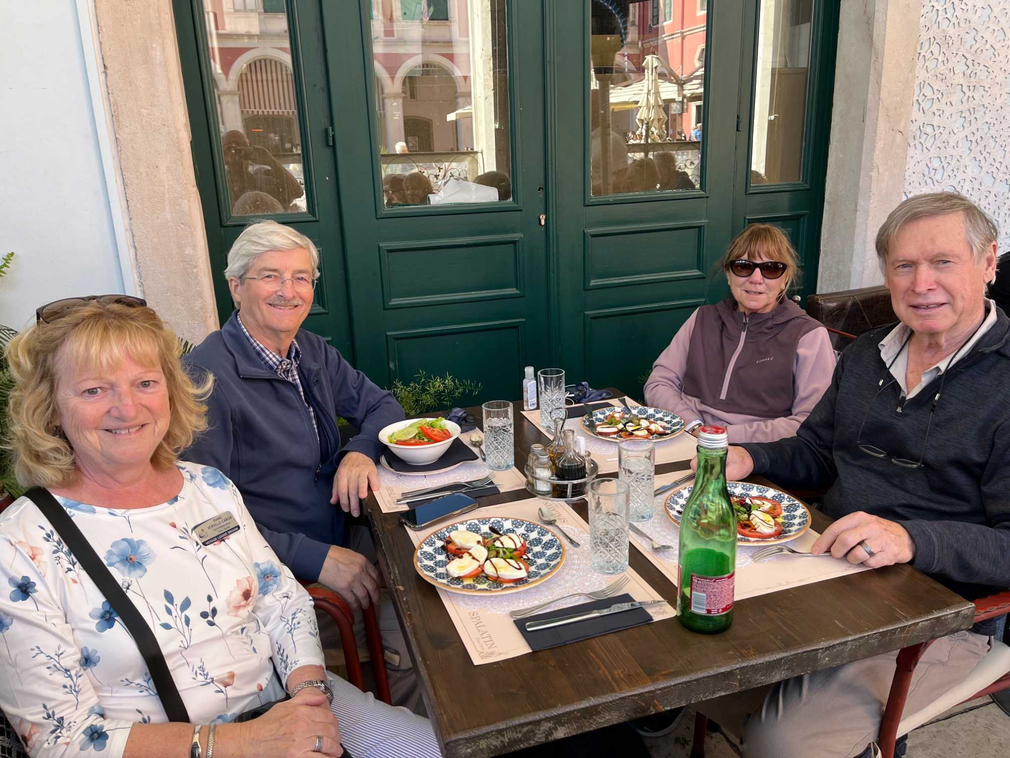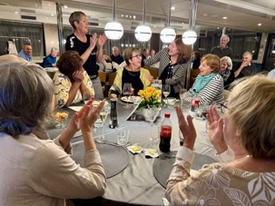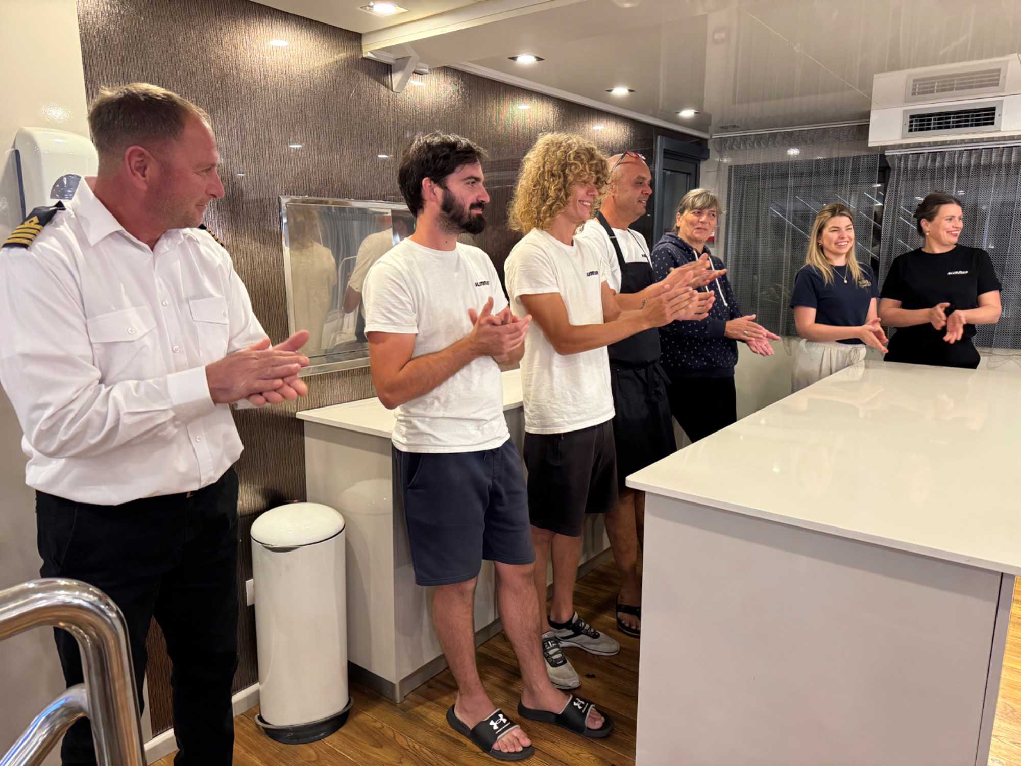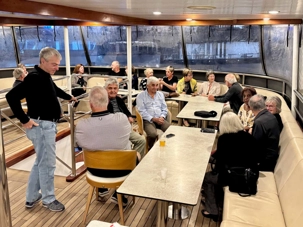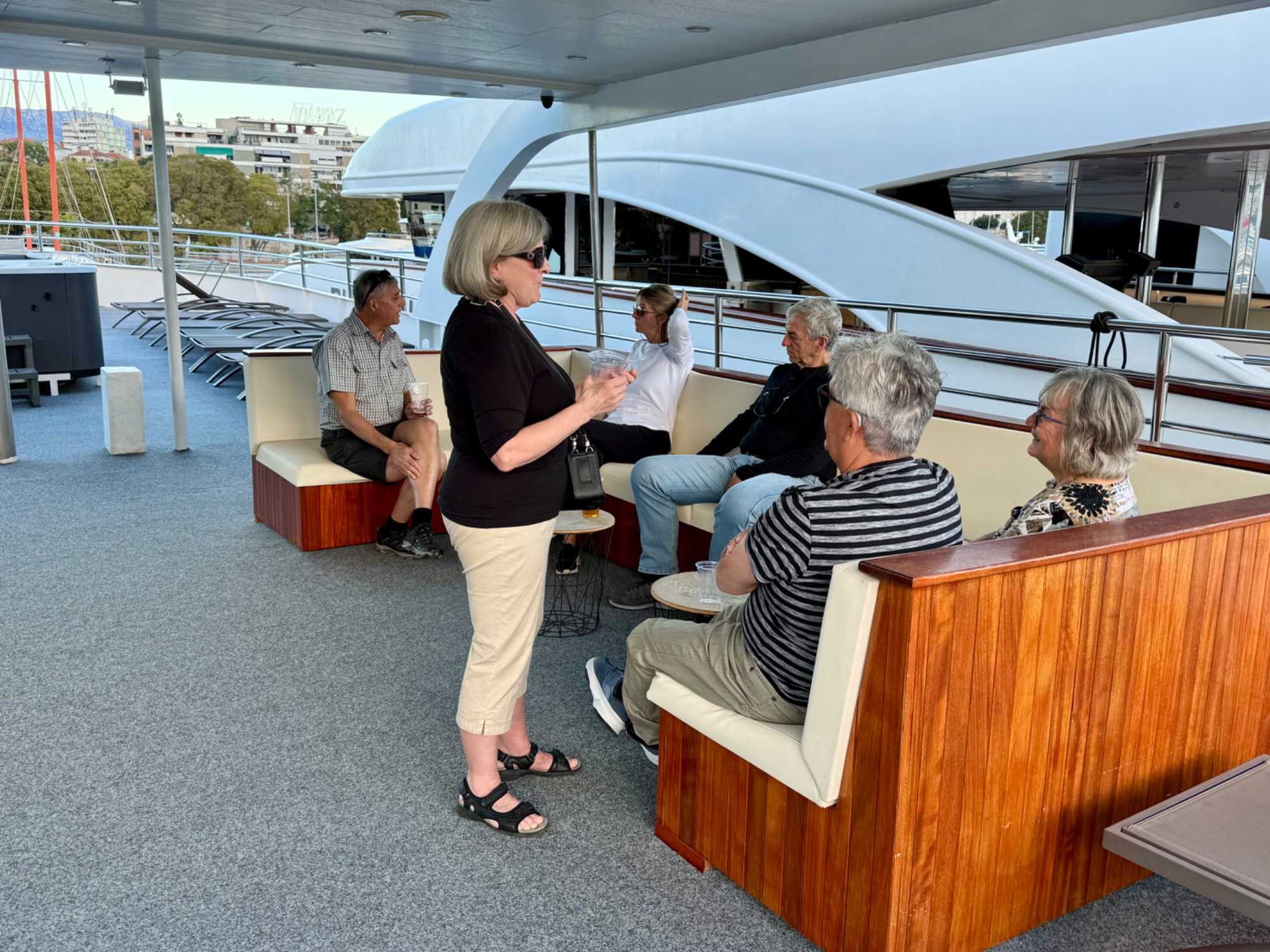 Pour notre premier souper à bord, nous sommes tous réunis, savourant des mets raffinés. Nous en profitons aussi pour célébrer l’anniversaire de naissance de Christiane et lui chanter nos souhaits de bonne fête. Après le repas, certains choisissent de descendre du navire pour une promenade dans les environs, tandis que d’autres profitent des installations à bord ou se dirigent vers leurs cabines pour un repos bien mérité.