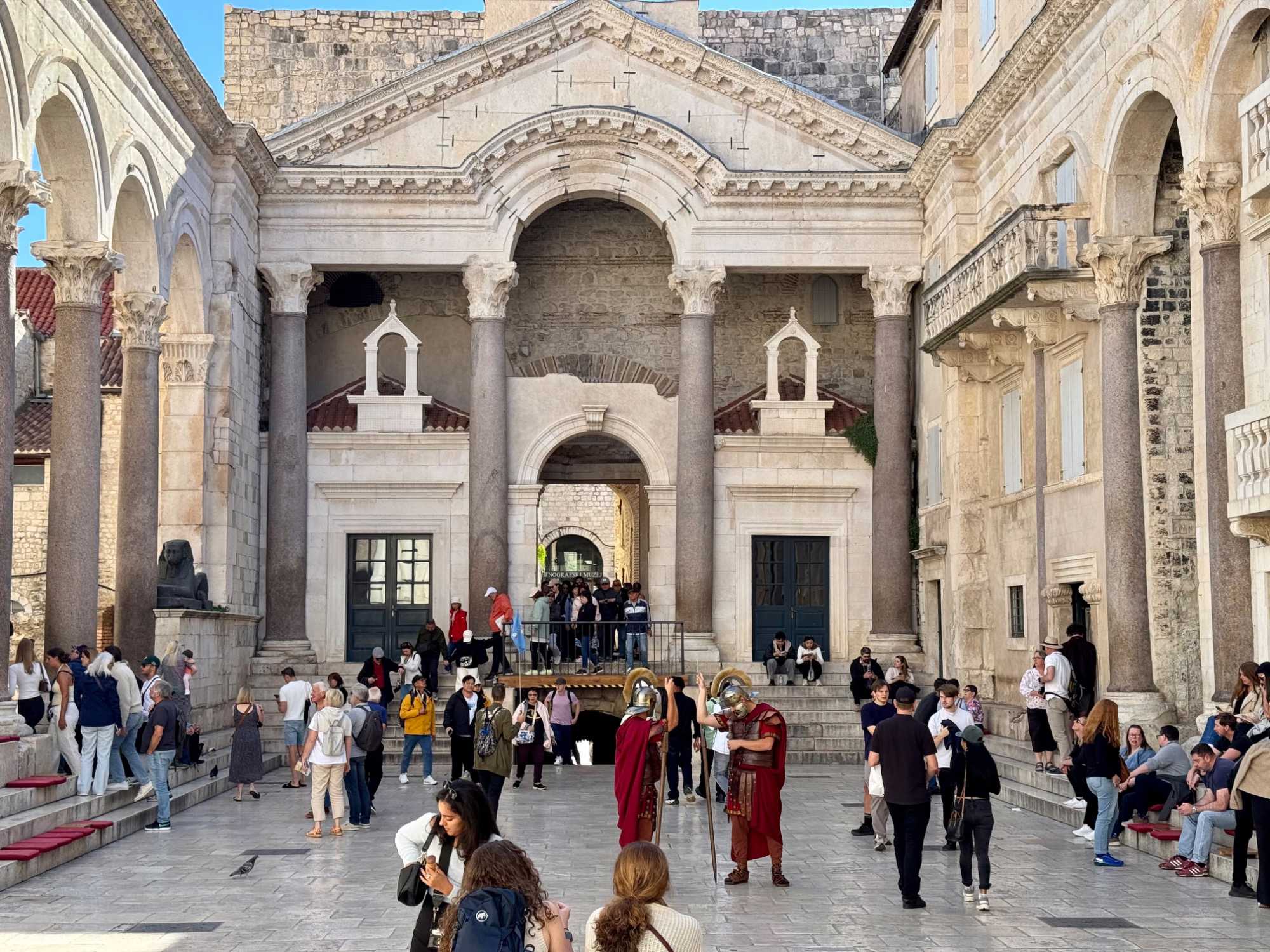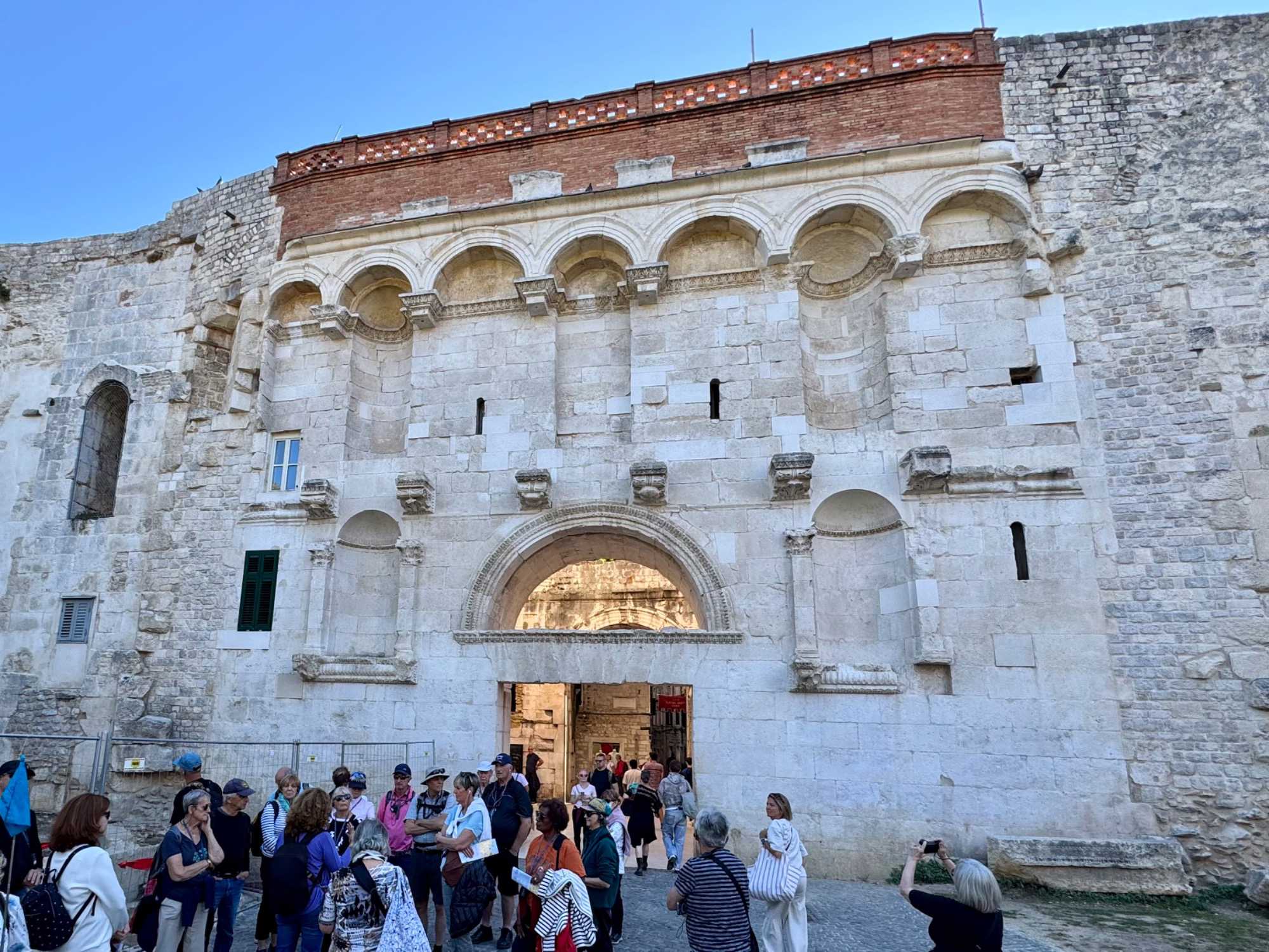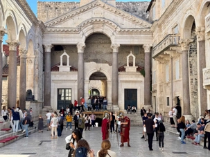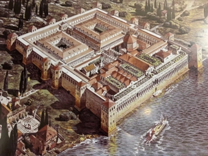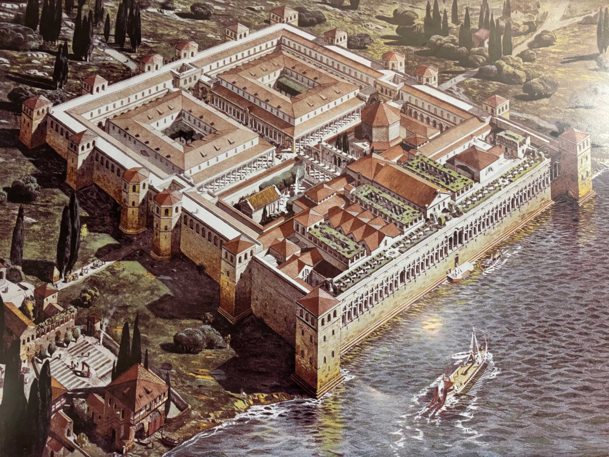 Le palais, qui fut érigé en sept ans, est stratégiquement situé face à la mer Adriatique. En entrant par la porte de bronze, nous explorons les anciennes structures qui, après le règne des romains, servaient d’égouts et qui sont maintenant transformées en musée. Auparavant, le palais s’étendait jusqu’à la mer, mais une magnifique promenade touristique s’y trouve maintenant, permettant aux visiteurs d’admirer le splendide littoral.