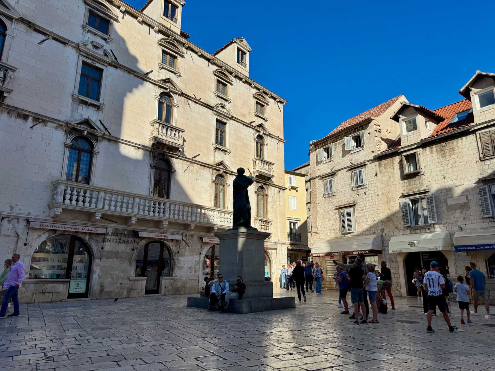 Split la capitale économique de la Dalmatie, ville de 250 000 habitants, se développe rapidement. C’est la 2e ville de Croatie et elle fût fondée au 2e siècle par l’empereur romain Dioclétien (245-313). Celui-ci décida de faire construire un immense palais pour terminer sa vie. Ainsi, nous avons appris que c’est l’empereur romain Dioclétien qui a choisi cet emplacement pour construire un palais autour duquel la ville de Split s’est transformée et développée. D’ailleurs, le palais de Dioclétien et la vieille ville de Split sont inscrits sur la liste du patrimoine de l’UNESCO depuis 1979 en raison de leur beauté, de leur bon état de conservation et de leur histoire mémorable, mais aussi parce que Split est une ville vivante, et non uniquement un musée figé dans le temps et l’espace. On ressent les différents moments historiques vécus par la ville à travers l’architecture antique, médiévale, romane, gothique, de la Renaissance, baroque et moderne. La richesse du patrimoine de Split est exceptionnelle, comme celui de la ville de Dubrovnik ou de Zagreb. Ce patrimoine continue d’être la scène de la vie de Split. Les habitants et les touristes se croisent dans les rues, les places, les monuments, les cafés et les terrasses de cette ville vibrante et animée aux innombrables attractions culturelles et festives. Nous sommes vraiment tombés sous son charme.