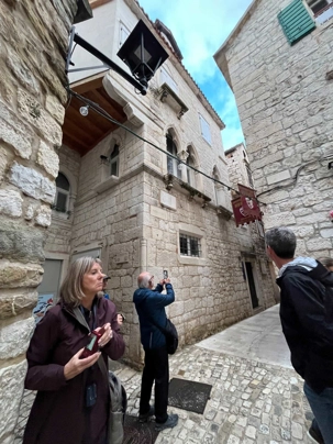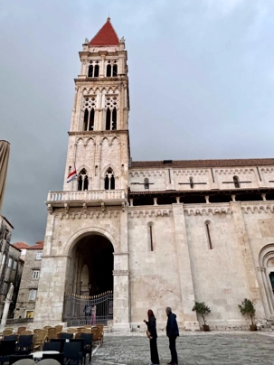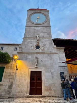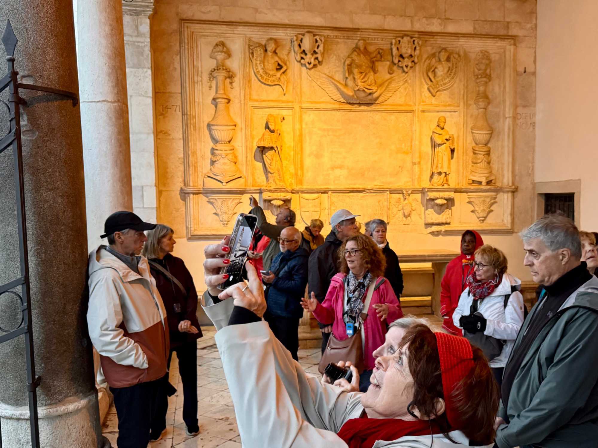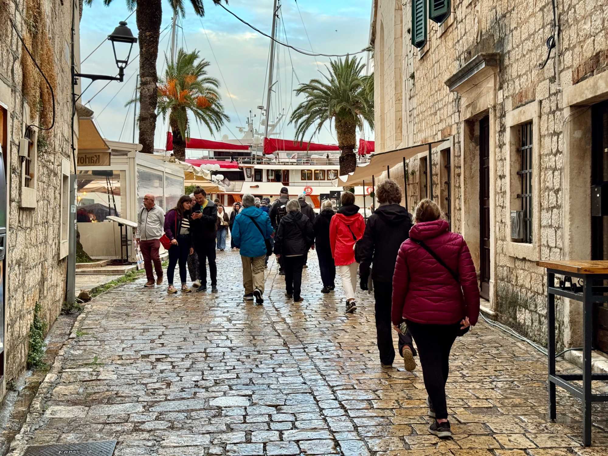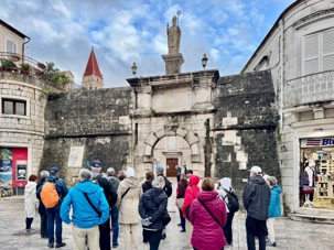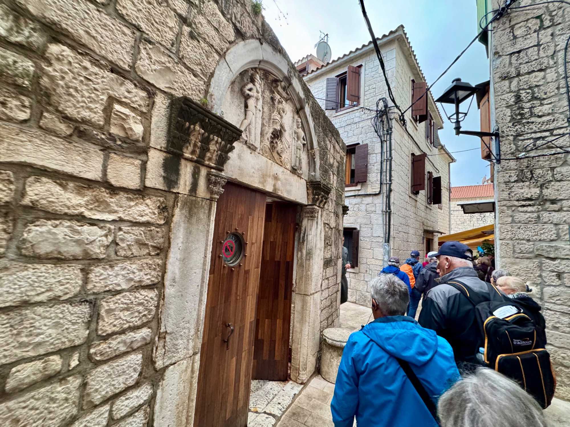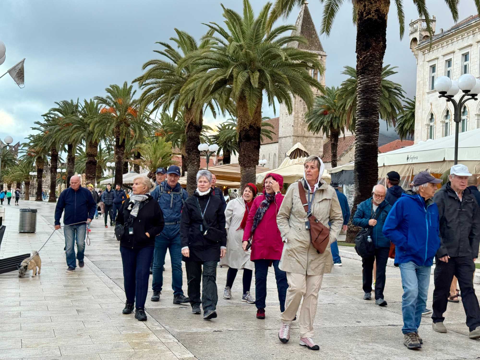 C’est à 17h00 que nous pouvons partir pour la belle ville de Trogir, mais en autobus. Trogir, petite ville à l’histoire riche, est classée au patrimoine mondial de l’UNESCO, elle nous accueille avec ses rues pavées et son charme médiéval. Dès notre arrivée, nous sommes séduits par l’architecture qui témoigne de l’influence des différentes civilisations qui ont occupé la ville au fil des siècles. Petite ville de 13 000 habitants, Trogir n’a jamais été prise ni vandalisée, et conserve donc un patrimoine représentatif de 2 500 ans d’architecture méditerranéenne. Son riche patrimoine culturel est issu de l’influence des anciens Grecs, Romains et Vénitiens. Trogir compte de nombreux palais, églises, tours et une forteresse insulaire. Nous partons à la découverte des lieux emblématiques de Trogir en compagnie de notre charmante guide, Isabelle. Nous arpentons les rues qui remontent à l’antiquité hellénistique, admirant les bâtiments qui ont été embellis au fil des ans. Les fortifications qui entourent la ville nous rappellent son importance stratégique au cours des siècles. Nous prenons le temps d’explorer la ville avec ses multiples églises, véritables trésors d’architecture, ainsi que les remarquables édifices baroques de la période vénitienne qui ajoutent une touche de splendeur à la ville. Chaque coin de rue nous réserve une surprise, que ce soit une petite boutique d’artisanat ou un café accueillant. Nous nous imprégnons de l’atmosphère tranquille de Trogir, un contraste agréable avec l’effervescence de Split. Nous prenons le temps de comprendre leur culture et leur histoire avec excellentes informations données par notre guide.