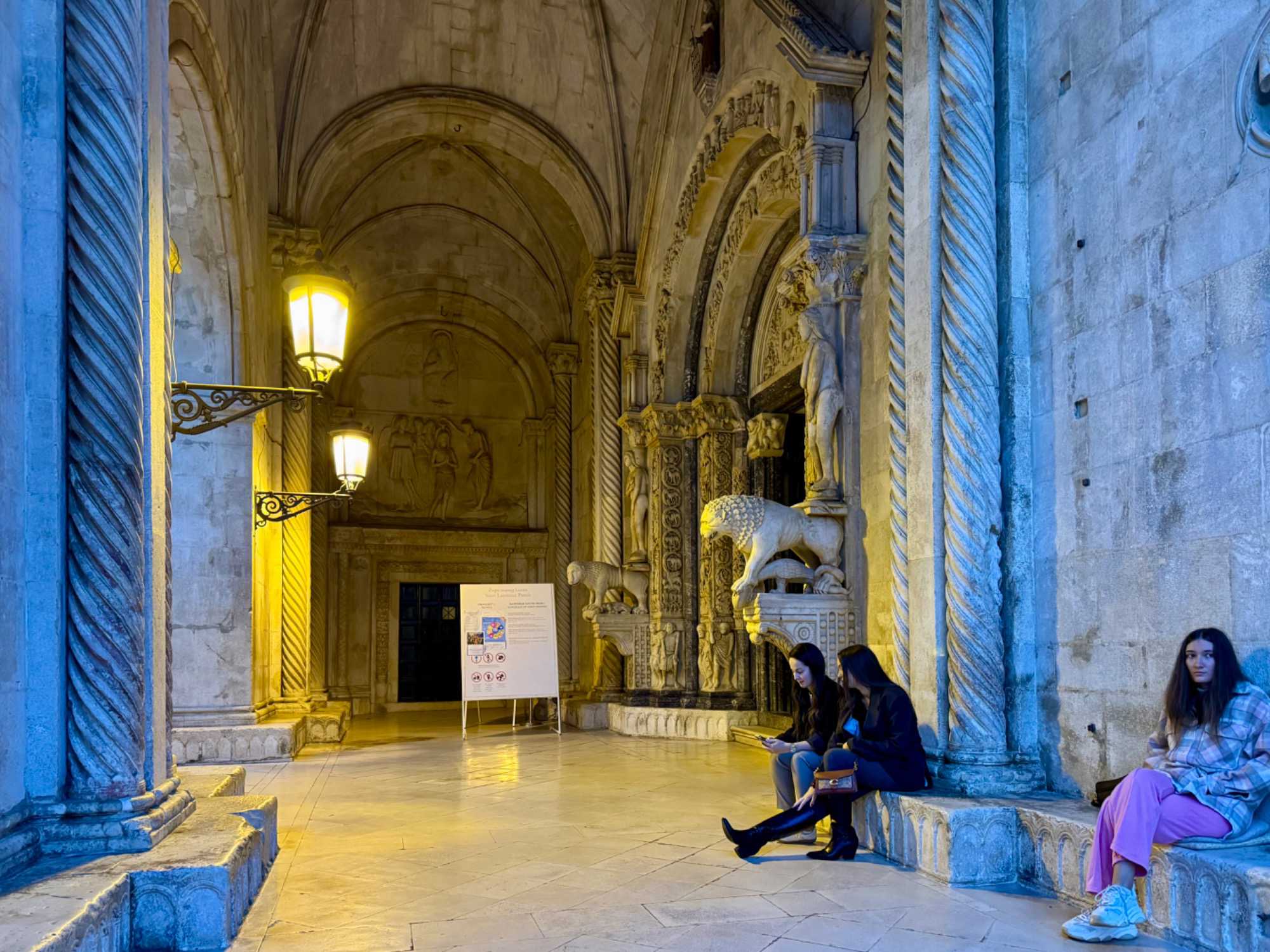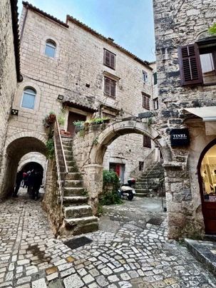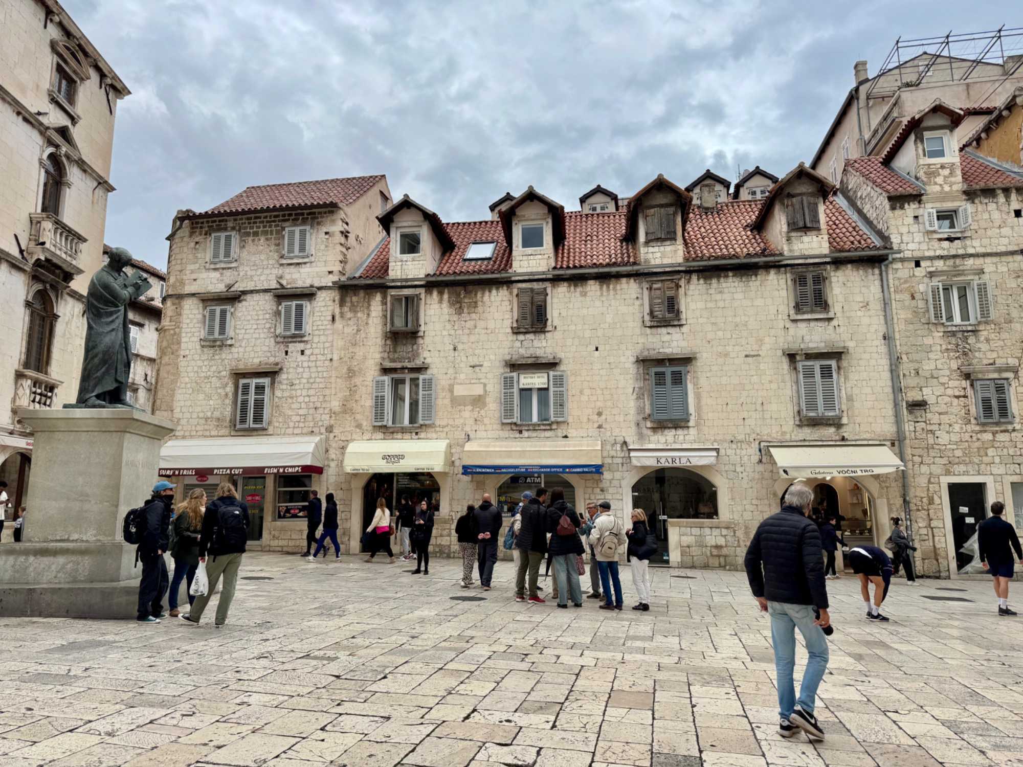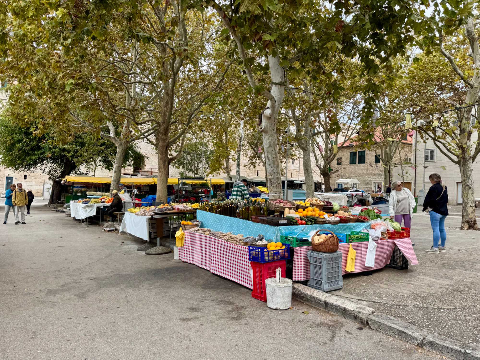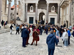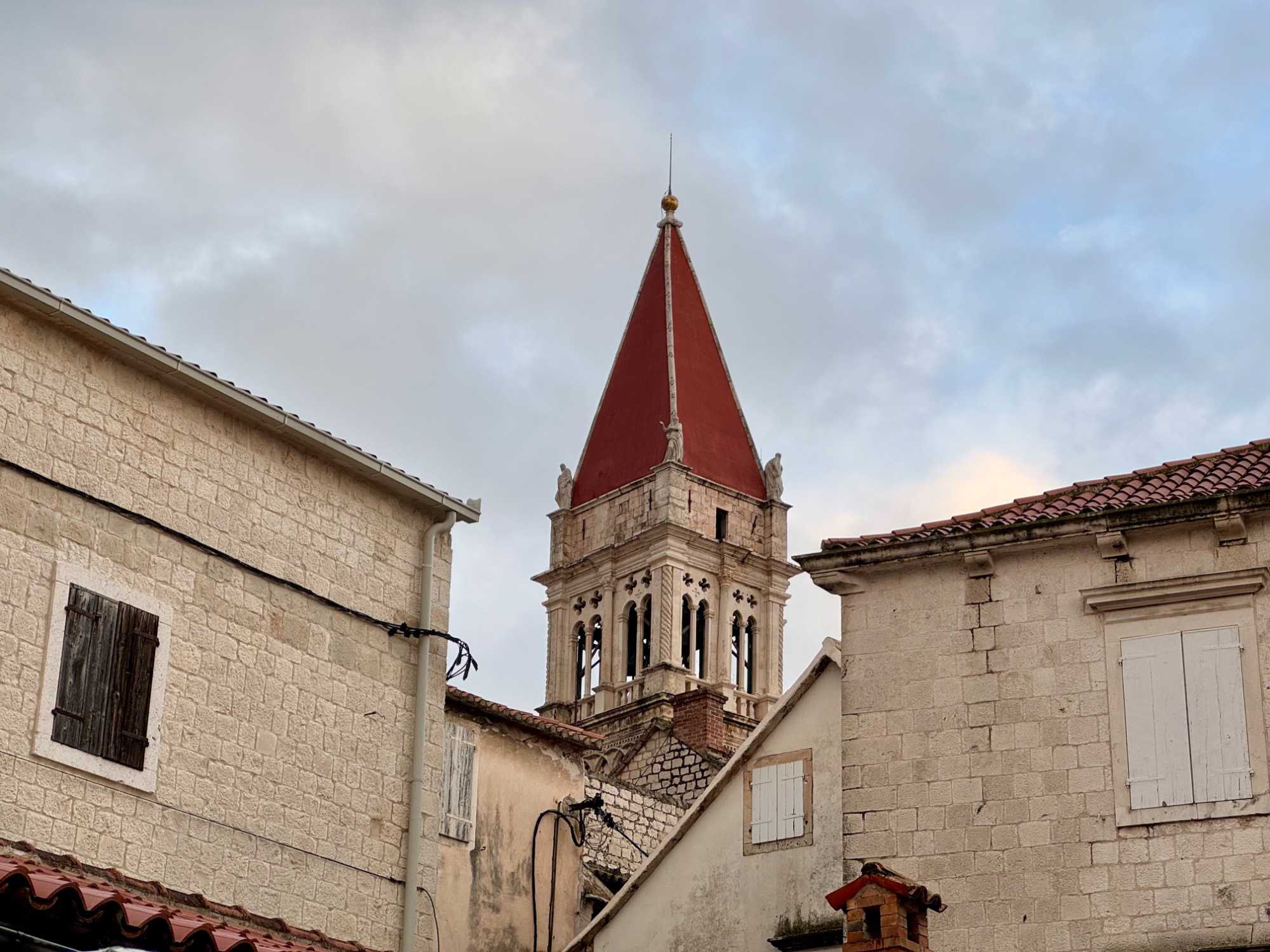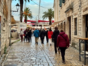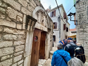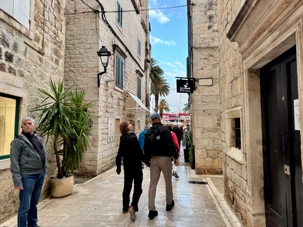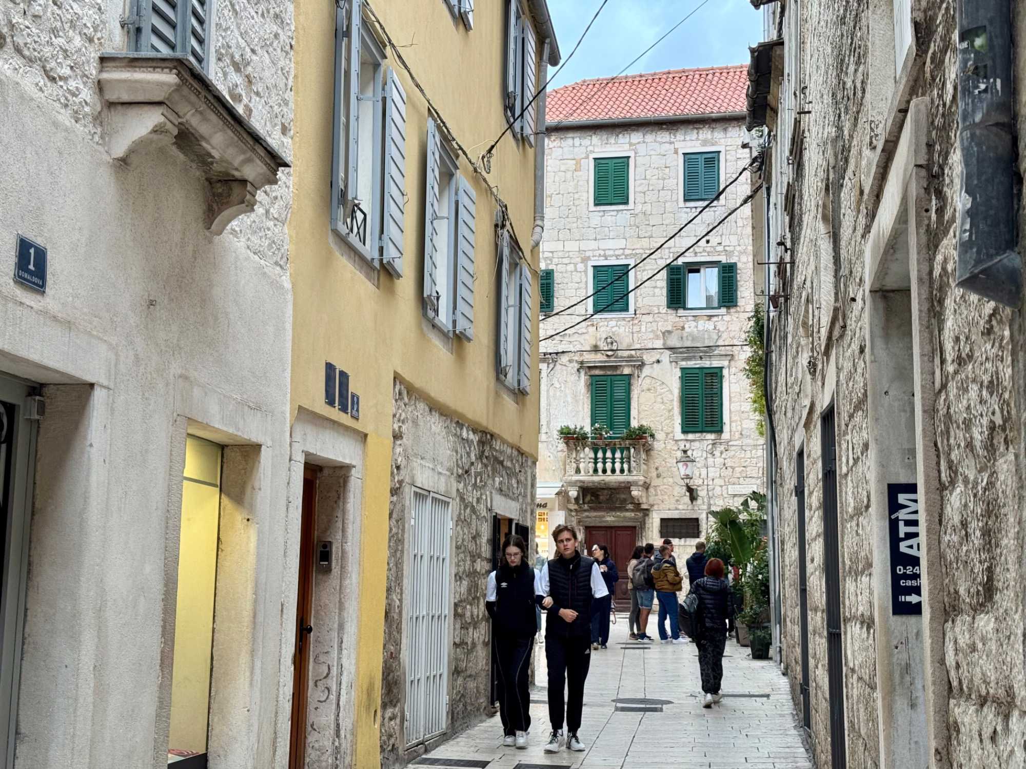 C’est à 17h00 que nous pouvons partir pour la belle ville de Trogir, mais en autobus. Trogir, petite ville à l’histoire riche, est classée au patrimoine mondial de l’UNESCO, elle nous accueille avec ses rues pavées et son charme médiéval. Dès notre arrivée, nous sommes séduits par l’architecture qui témoigne de l’influence des différentes civilisations qui ont occupé la ville au fil des siècles. Petite ville de 13 000 habitants, Trogir n’a jamais été prise ni vandalisée, et conserve donc un patrimoine représentatif de 2 500 ans d’architecture méditerranéenne. Son riche patrimoine culturel est issu de l’influence des anciens Grecs, Romains et Vénitiens. Trogir compte de nombreux palais, églises, tours et une forteresse insulaire. Nous partons à la découverte des lieux emblématiques de Trogir en compagnie de notre charmante guide, Isabelle. Nous arpentons les rues qui remontent à l’antiquité hellénistique, admirant les bâtiments qui ont été embellis au fil des ans. Les fortifications qui entourent la ville nous rappellent son importance stratégique au cours des siècles. Nous prenons le temps d’explorer la ville avec ses multiples églises, véritables trésors d’architecture, ainsi que les remarquables édifices baroques de la période vénitienne qui ajoutent une touche de splendeur à la ville. Chaque coin de rue nous réserve une surprise, que ce soit une petite boutique d’artisanat ou un café accueillant. Nous nous imprégnons de l’atmosphère tranquille de Trogir, un contraste agréable avec l’effervescence de Split. Nous prenons le temps de comprendre leur culture et leur histoire avec excellentes informations données par notre guide.