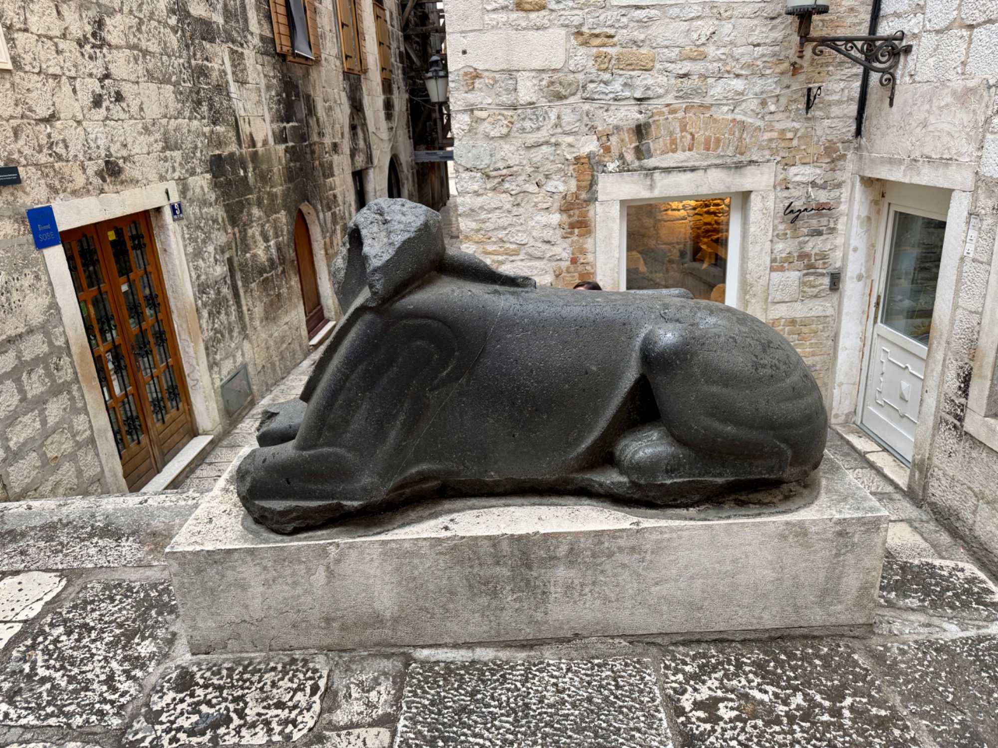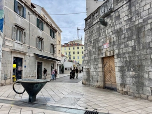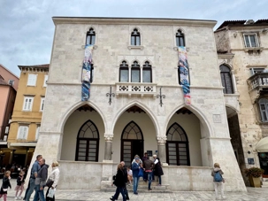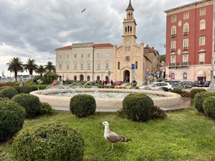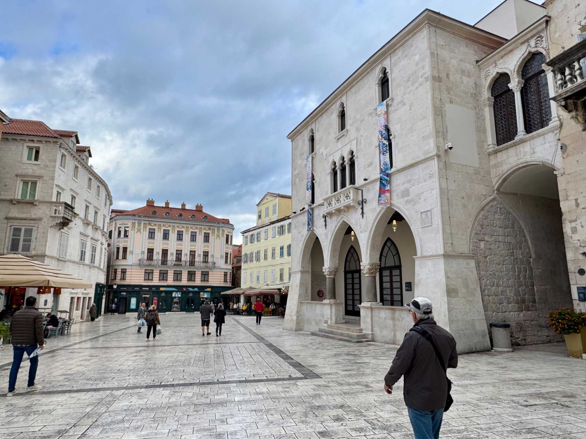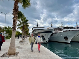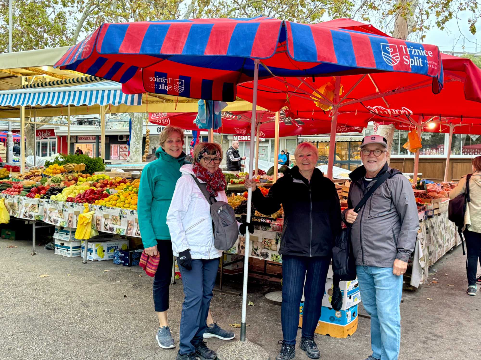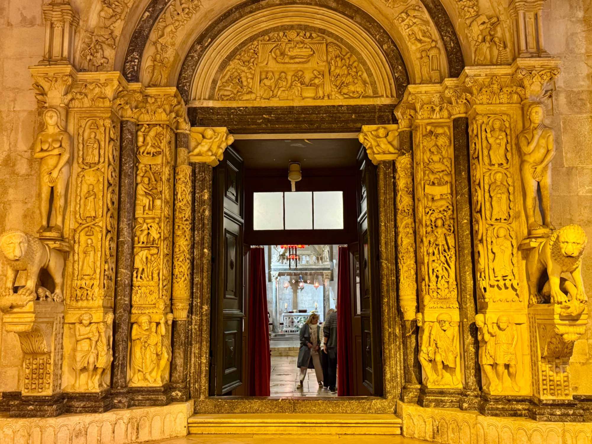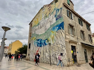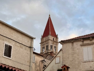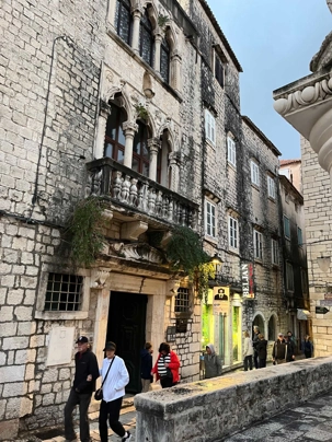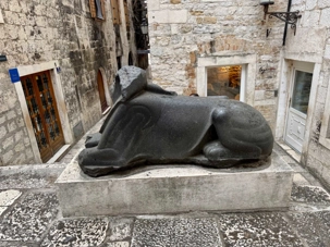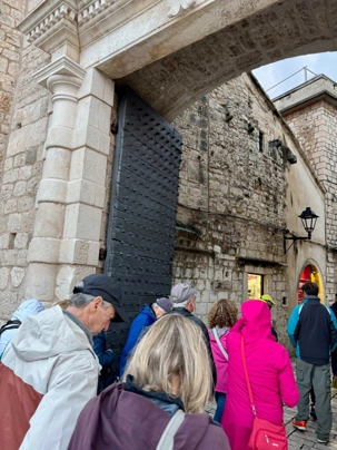 C’est à 17h00 que nous pouvons partir pour la belle ville de Trogir, mais en autobus. Trogir, petite ville à l’histoire riche, est classée au patrimoine mondial de l’UNESCO, elle nous accueille avec ses rues pavées et son charme médiéval. Dès notre arrivée, nous sommes séduits par l’architecture qui témoigne de l’influence des différentes civilisations qui ont occupé la ville au fil des siècles. Petite ville de 13 000 habitants, Trogir n’a jamais été prise ni vandalisée, et conserve donc un patrimoine représentatif de 2 500 ans d’architecture méditerranéenne. Son riche patrimoine culturel est issu de l’influence des anciens Grecs, Romains et Vénitiens. Trogir compte de nombreux palais, églises, tours et une forteresse insulaire. Nous partons à la découverte des lieux emblématiques de Trogir en compagnie de notre charmante guide, Isabelle. Nous arpentons les rues qui remontent à l’antiquité hellénistique, admirant les bâtiments qui ont été embellis au fil des ans. Les fortifications qui entourent la ville nous rappellent son importance stratégique au cours des siècles. Nous prenons le temps d’explorer la ville avec ses multiples églises, véritables trésors d’architecture, ainsi que les remarquables édifices baroques de la période vénitienne qui ajoutent une touche de splendeur à la ville. Chaque coin de rue nous réserve une surprise, que ce soit une petite boutique d’artisanat ou un café accueillant. Nous nous imprégnons de l’atmosphère tranquille de Trogir, un contraste agréable avec l’effervescence de Split. Nous prenons le temps de comprendre leur culture et leur histoire avec excellentes informations données par notre guide.