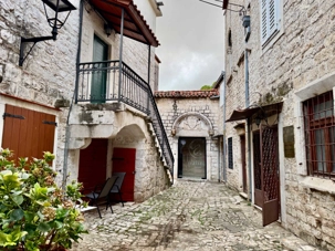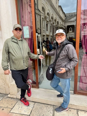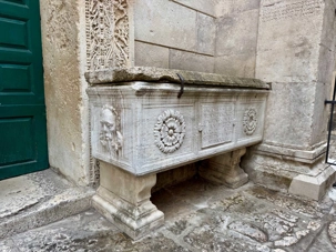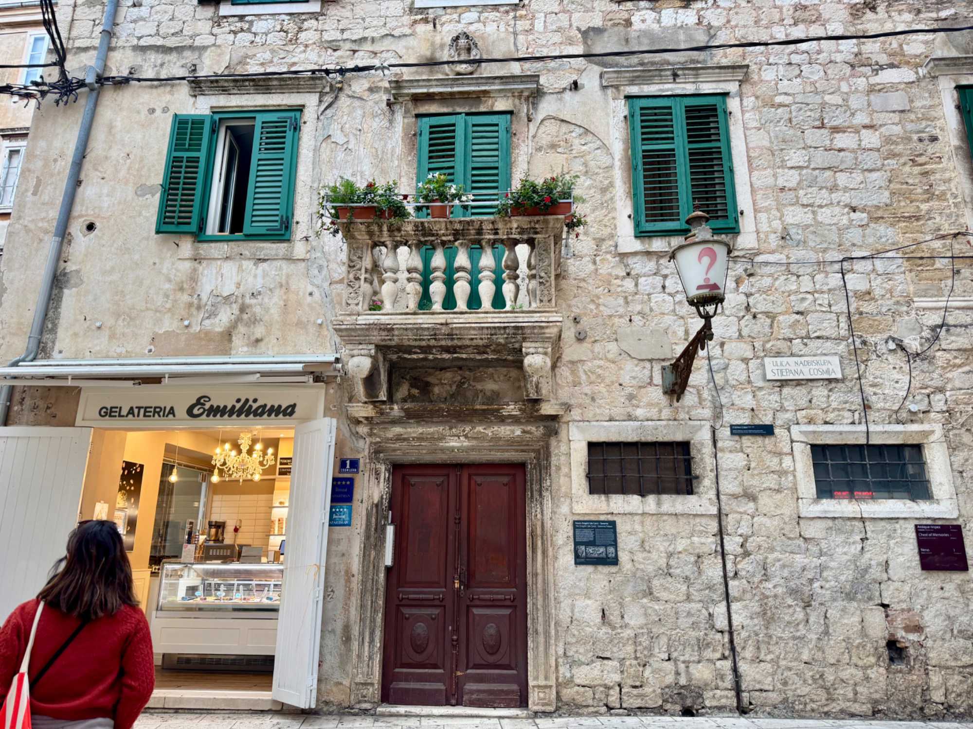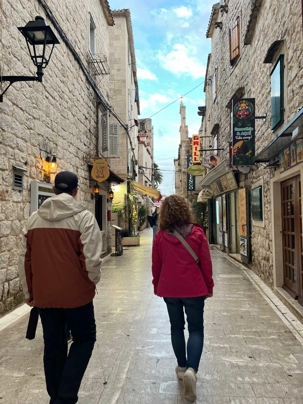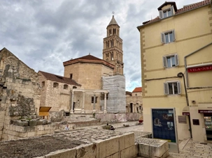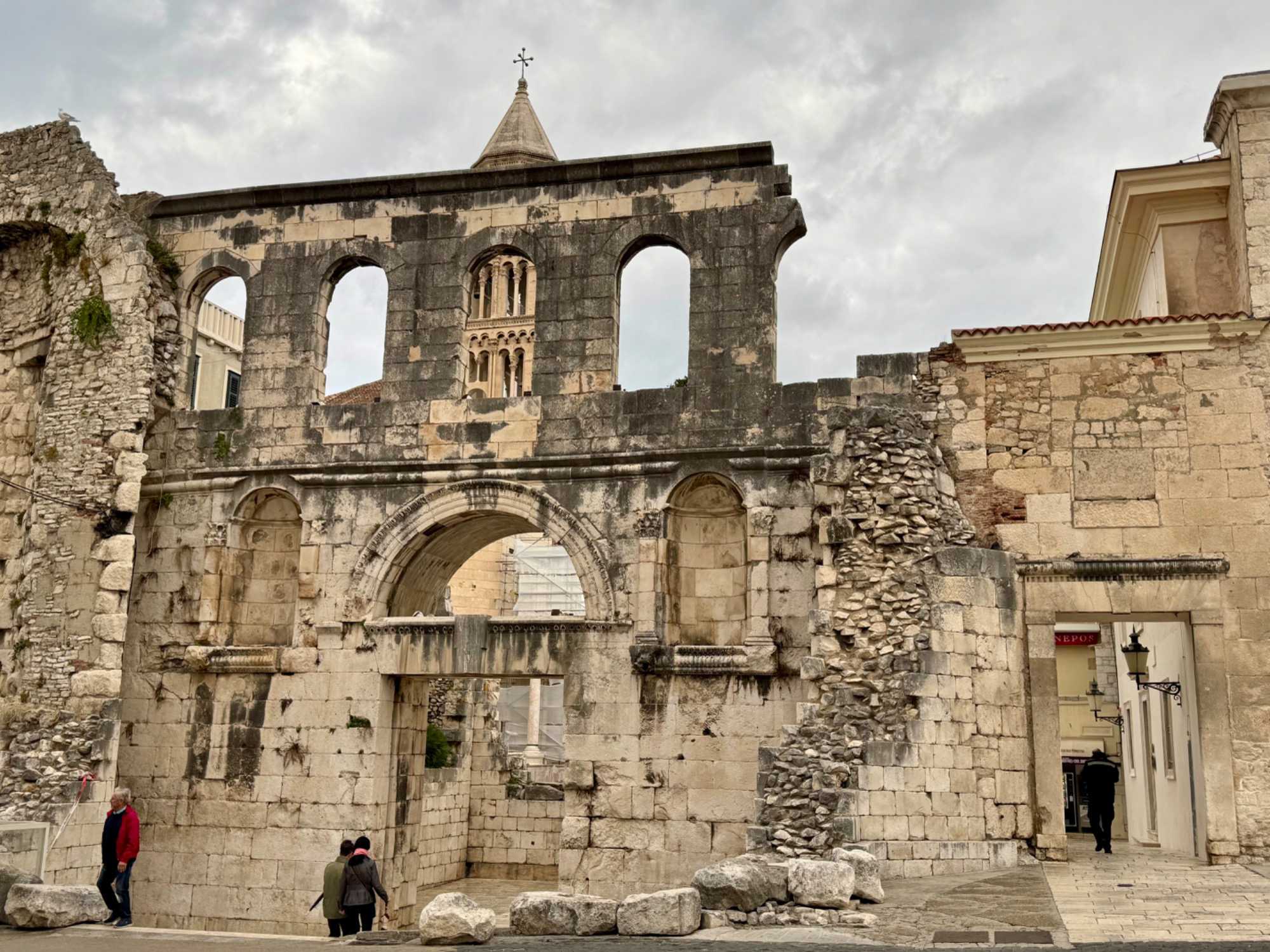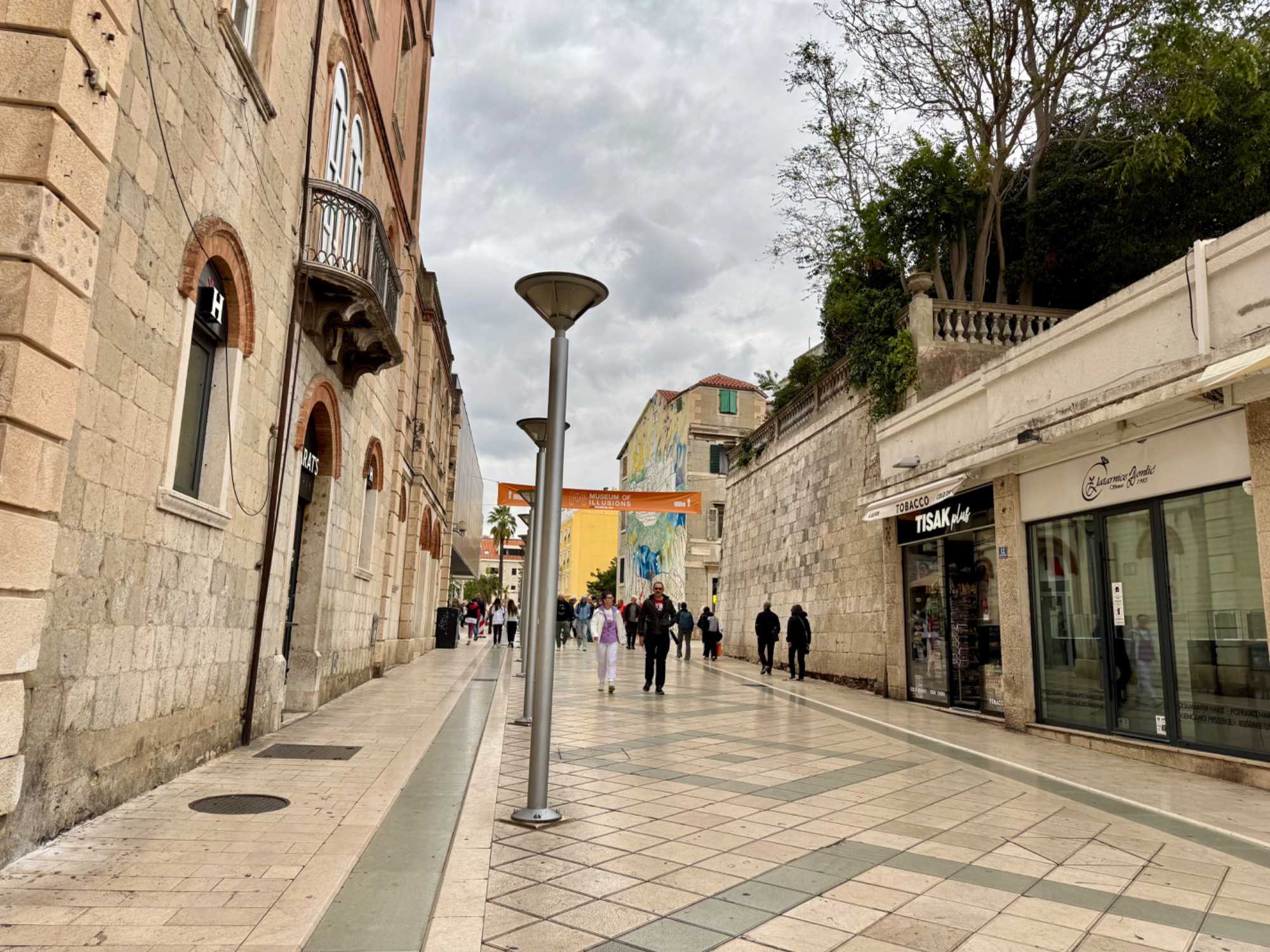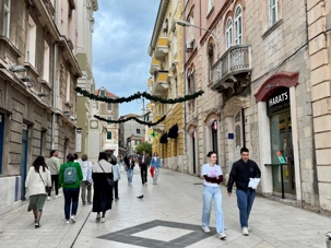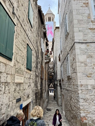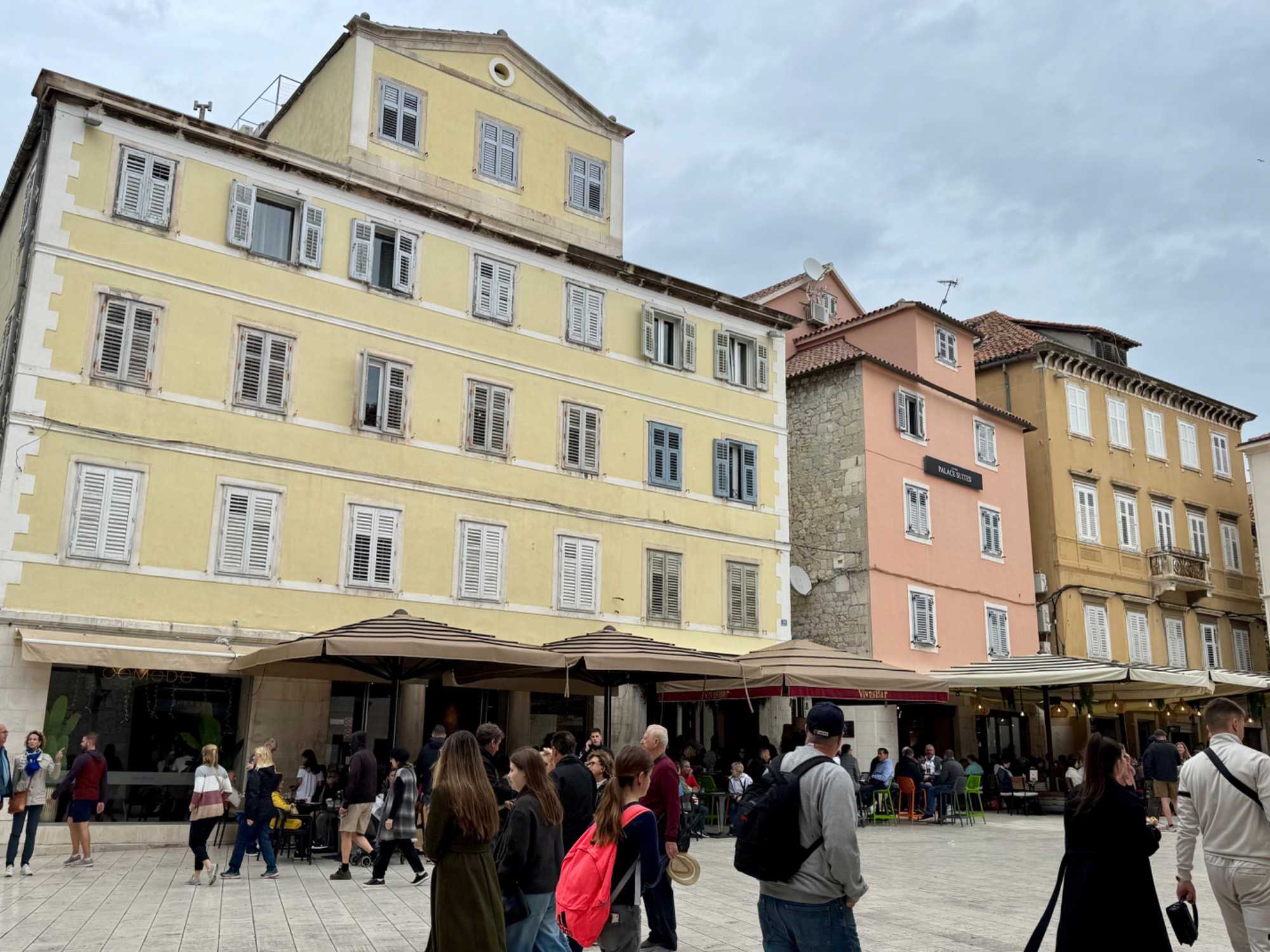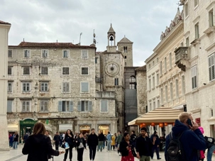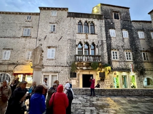 C’est à 17h00 que nous pouvons partir pour la belle ville de Trogir, mais en autobus. Trogir, petite ville à l’histoire riche, est classée au patrimoine mondial de l’UNESCO, elle nous accueille avec ses rues pavées et son charme médiéval. Dès notre arrivée, nous sommes séduits par l’architecture qui témoigne de l’influence des différentes civilisations qui ont occupé la ville au fil des siècles. Petite ville de 13 000 habitants, Trogir n’a jamais été prise ni vandalisée, et conserve donc un patrimoine représentatif de 2 500 ans d’architecture méditerranéenne. Son riche patrimoine culturel est issu de l’influence des anciens Grecs, Romains et Vénitiens. Trogir compte de nombreux palais, églises, tours et une forteresse insulaire. Nous partons à la découverte des lieux emblématiques de Trogir en compagnie de notre charmante guide, Isabelle. Nous arpentons les rues qui remontent à l’antiquité hellénistique, admirant les bâtiments qui ont été embellis au fil des ans. Les fortifications qui entourent la ville nous rappellent son importance stratégique au cours des siècles. Nous prenons le temps d’explorer la ville avec ses multiples églises, véritables trésors d’architecture, ainsi que les remarquables édifices baroques de la période vénitienne qui ajoutent une touche de splendeur à la ville. Chaque coin de rue nous réserve une surprise, que ce soit une petite boutique d’artisanat ou un café accueillant. Nous nous imprégnons de l’atmosphère tranquille de Trogir, un contraste agréable avec l’effervescence de Split. Nous prenons le temps de comprendre leur culture et leur histoire avec excellentes informations données par notre guide.