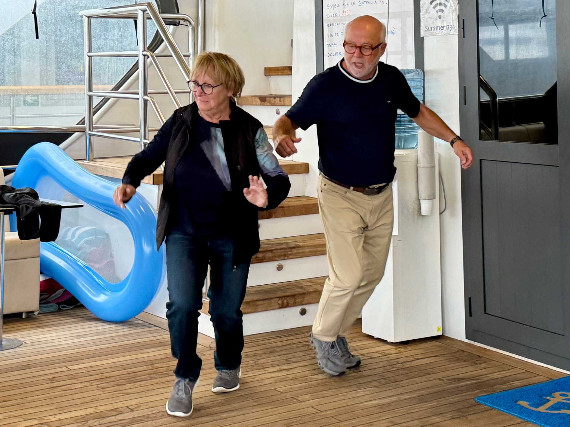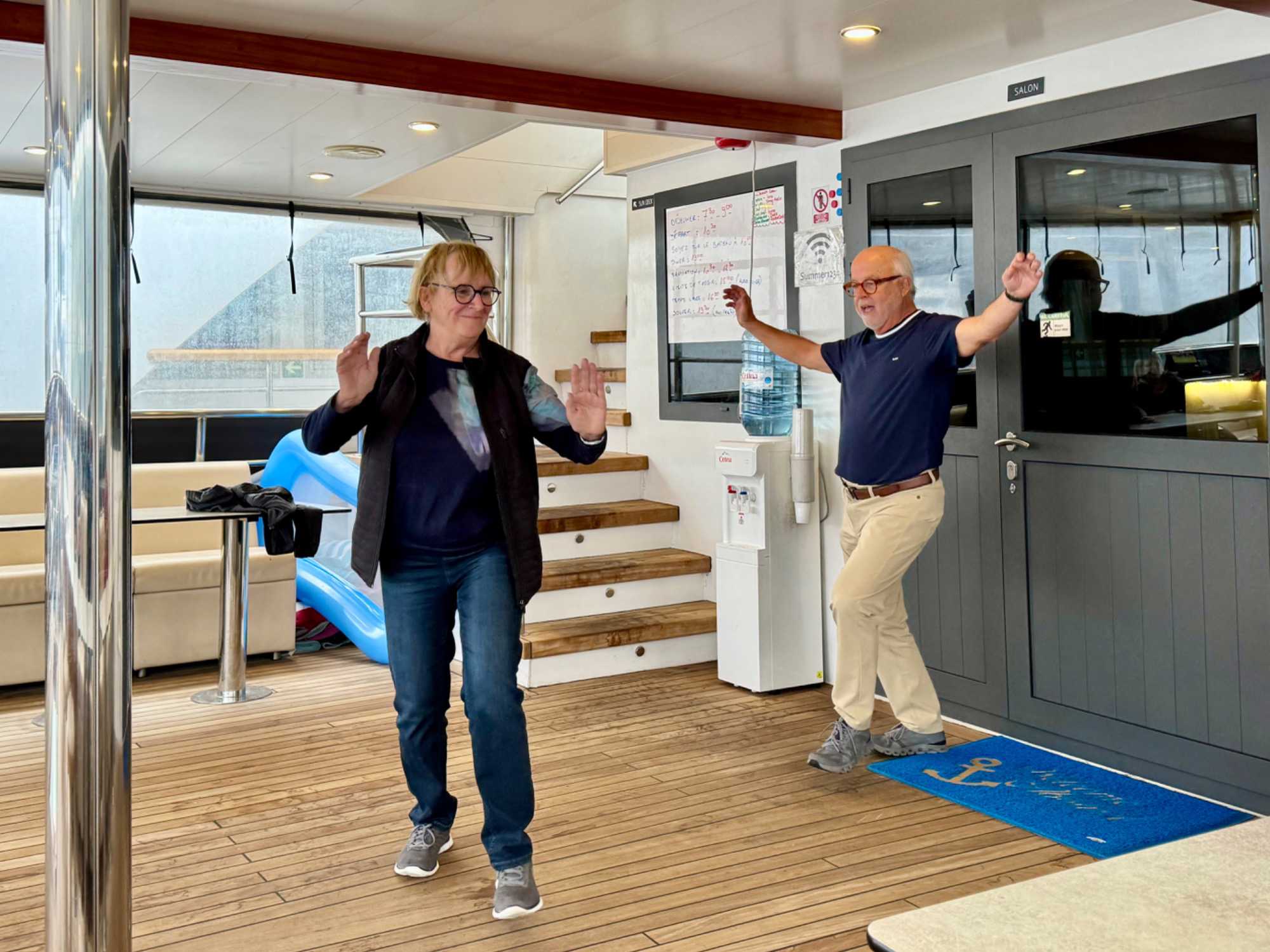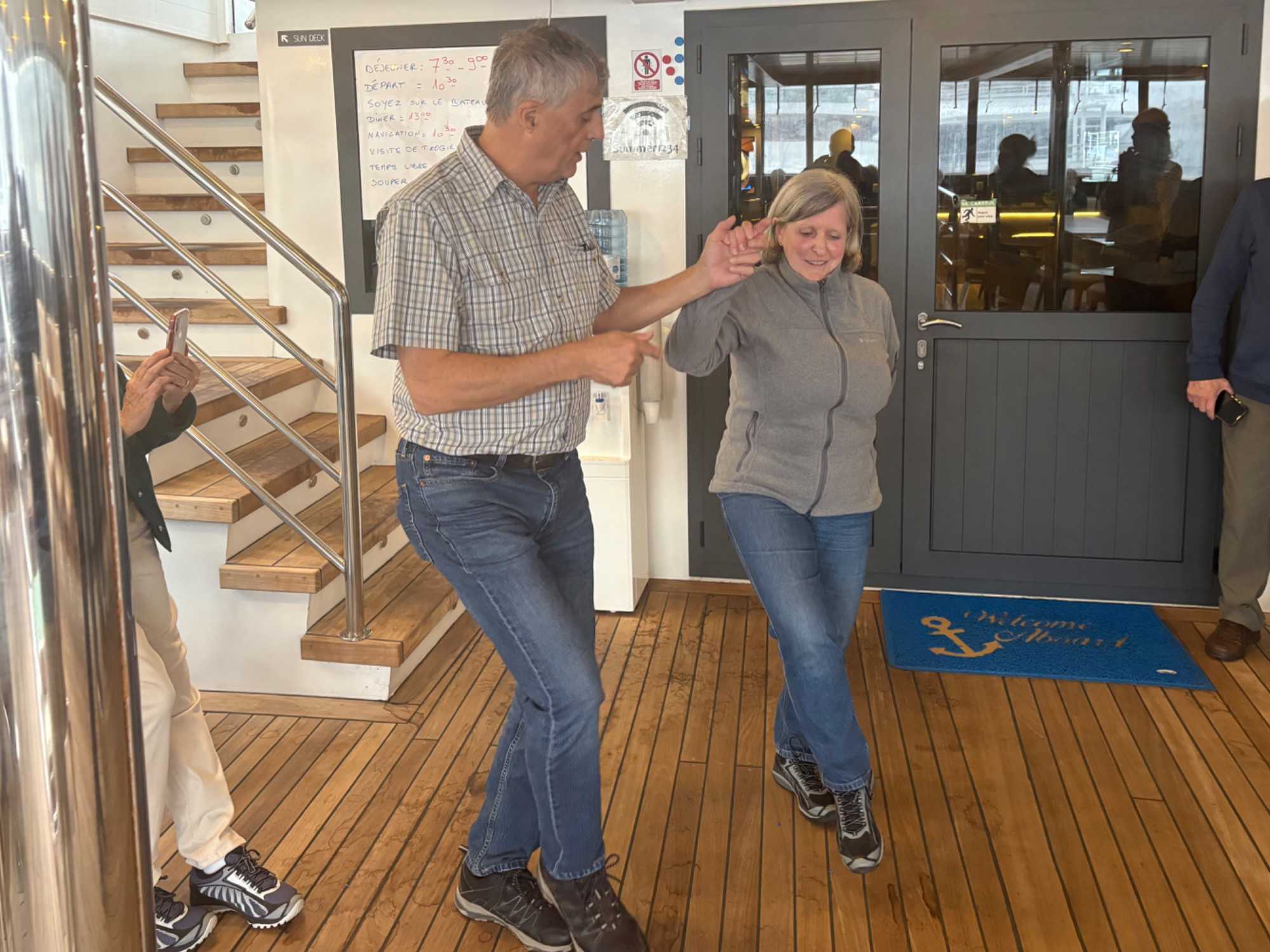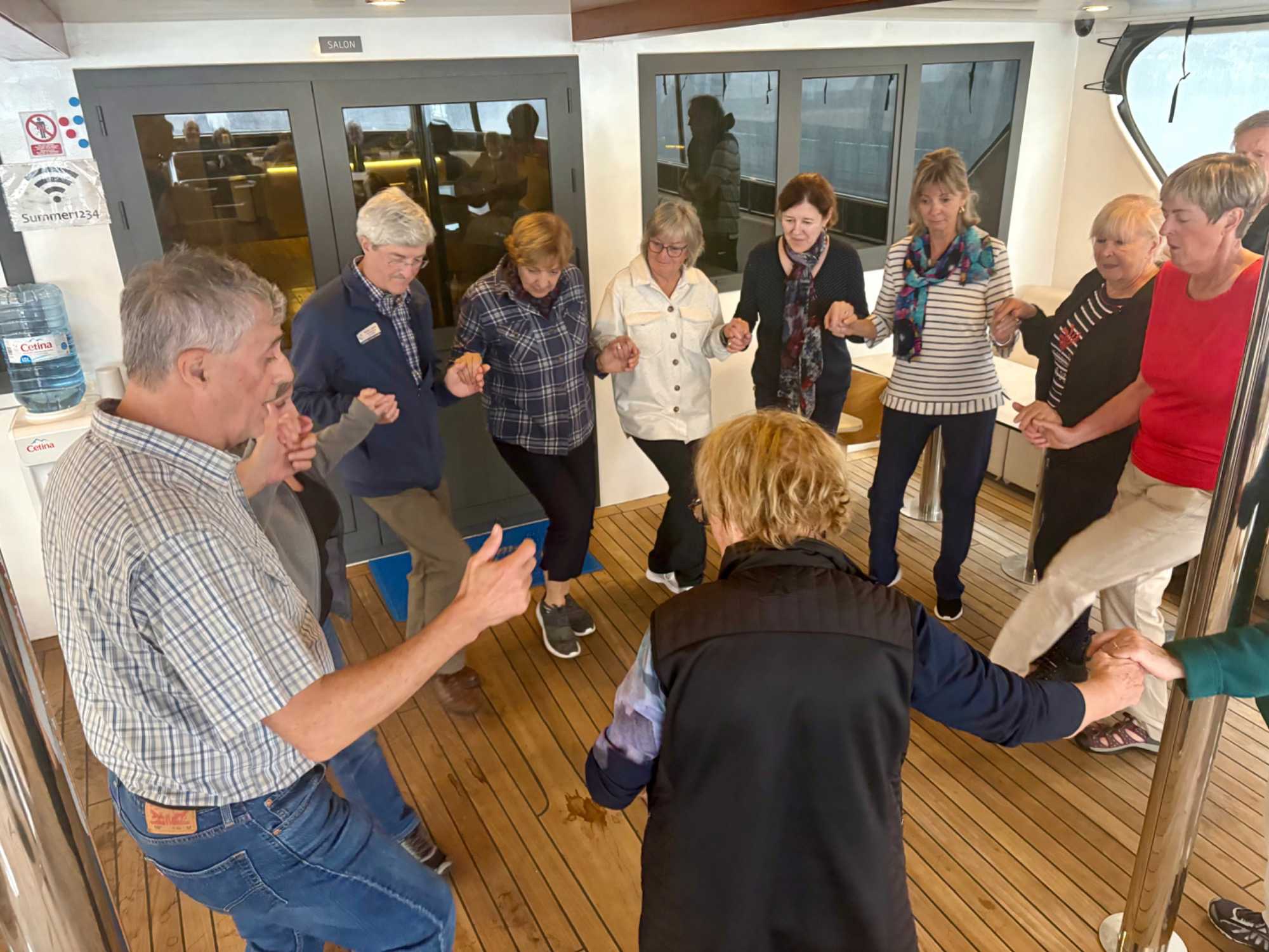 Un excellent dîner est servi à bord, un moment convivial où nous échangeons nos impressions sur le voyage avant notre prochaine escale. Après, on se réunit sur le pont couvert, à l’abri de la pluie, pour bouger un peu. En effet, Carole et Gilles nous ont montré une danse folklorique macédonienne avec une musique jouée sur le système de son du navire. Il y a aussi Rachel et Émilien qui nous apprennent une danse et nous font aussi une démonstration d’une danse folklorique. Pour terminer, Danielle se transforme en animatrice de spectacle pour un bref tour de chant avec Colette, Alourdes et Guy. Ils entament chacun leurs tours des chansons de Georges D’or, Jean-Pierre Ferland, Jean Ferrat, Paul Piché et Gilles Vigneault.