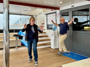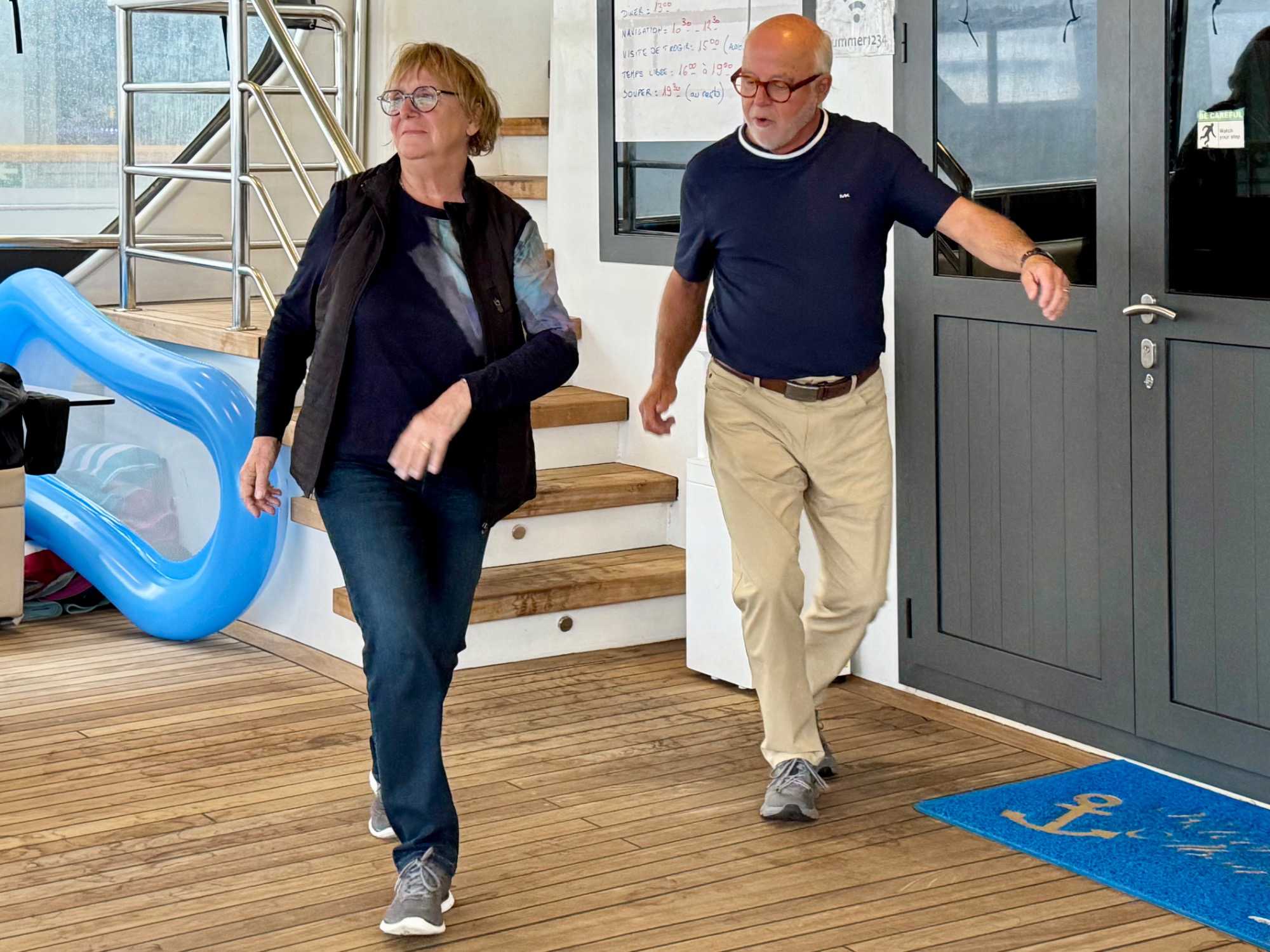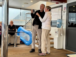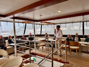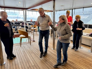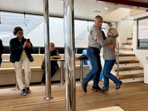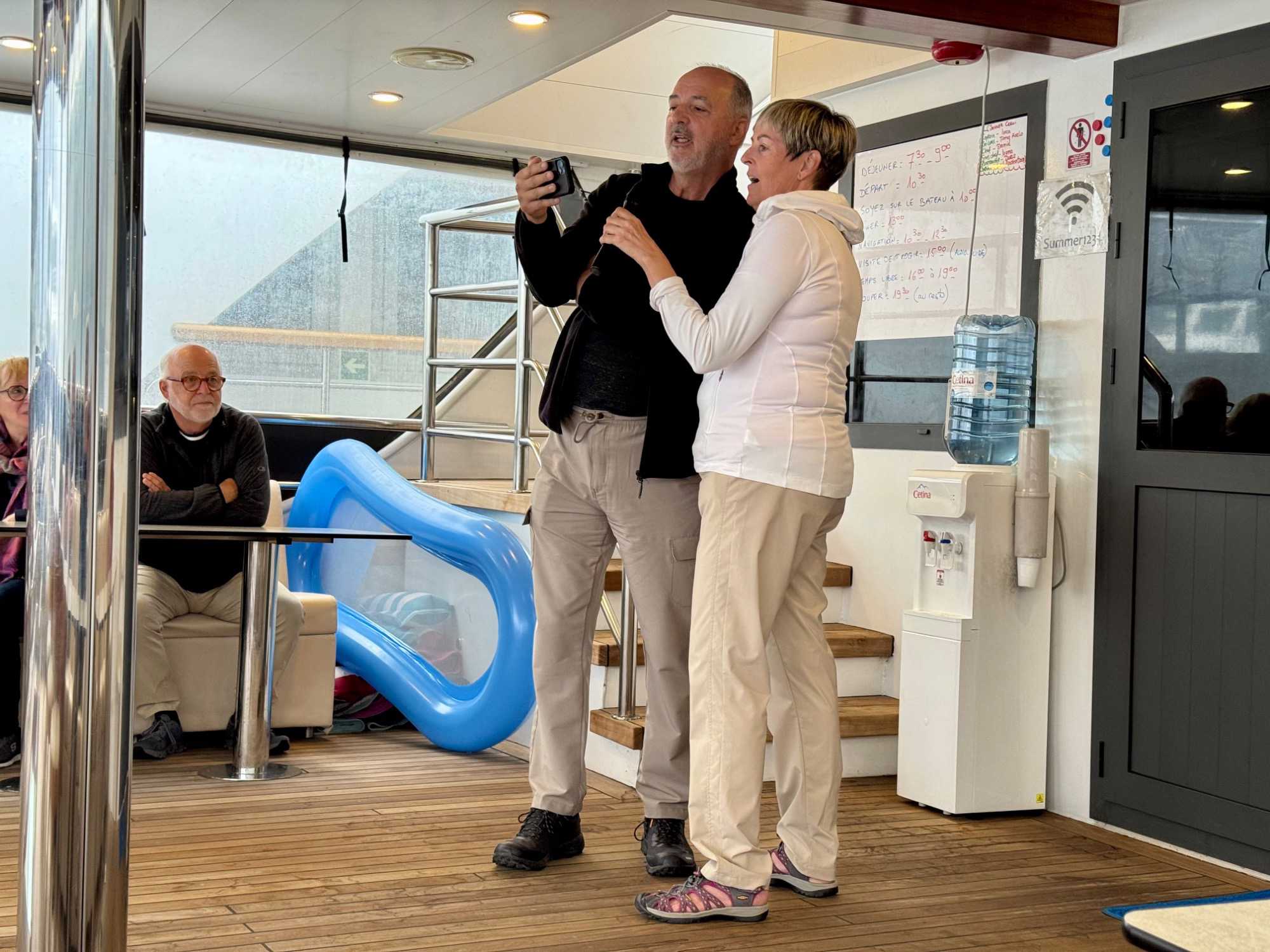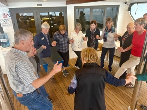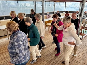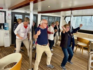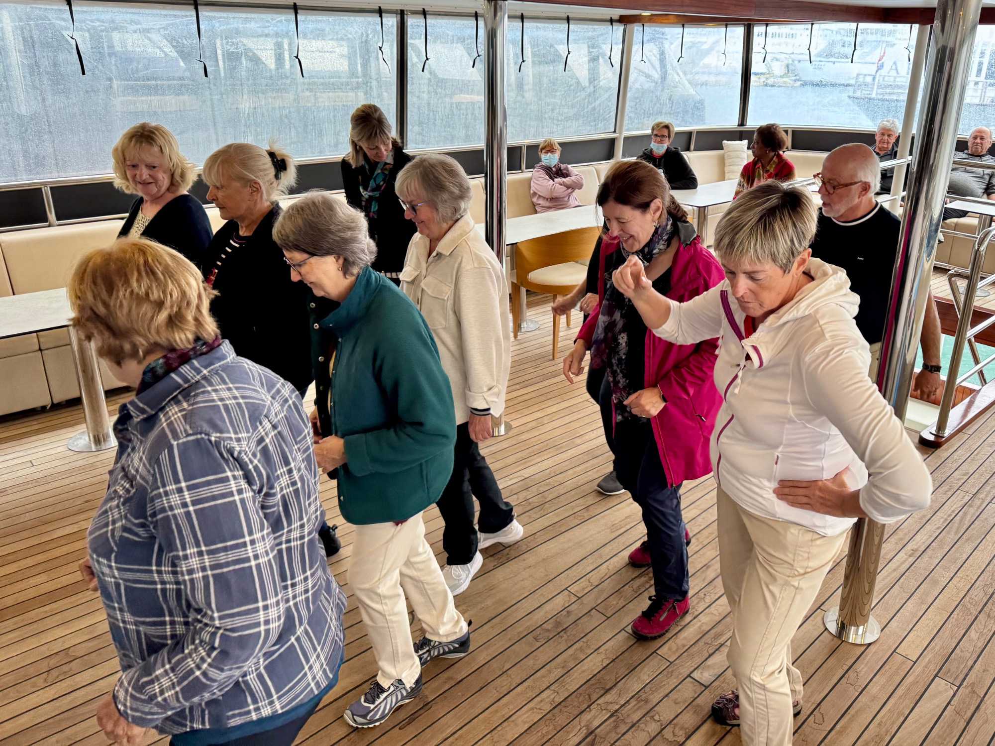 Un excellent dîner est servi à bord, un moment convivial où nous échangeons nos impressions sur le voyage avant notre prochaine escale. Après, on se réunit sur le pont couvert, à l’abri de la pluie, pour bouger un peu. En effet, Carole et Gilles nous ont montré une danse folklorique macédonienne avec une musique jouée sur le système de son du navire. Il y a aussi Rachel et Émilien qui nous apprennent une danse et nous font aussi une démonstration d’une danse folklorique. Pour terminer, Danielle se transforme en animatrice de spectacle pour un bref tour de chant avec Colette, Alourdes et Guy. Ils entament chacun leurs tours des chansons de Georges D’or, Jean-Pierre Ferland, Jean Ferrat, Paul Piché et Gilles Vigneault.