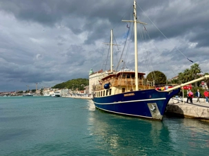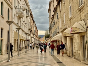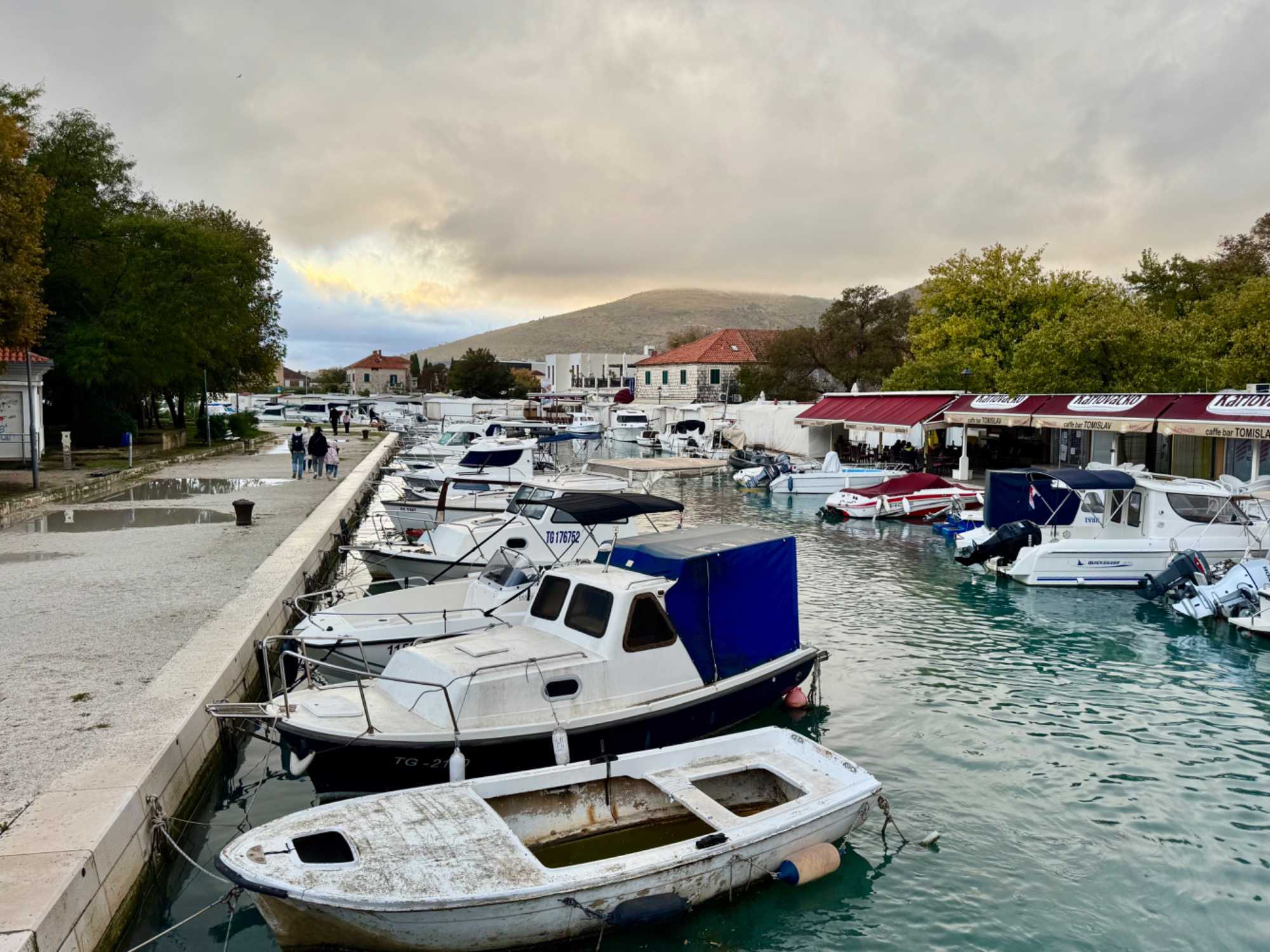 Après avoir passé quelques heures à Split, nous étions supposés de lever les amarres pour débuter notre croisière en direction de Trogir. Un orage se prépare à l’horizon et le capitaine décide de retarder notre départ jusqu’à demain. Ce fut une bonne décision car plusieurs des bateaux qui avaient quitté le port un peu plus tôt ont dû rebrousser chemin et revenir s’amarrer.