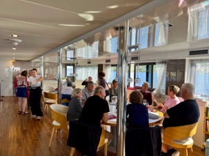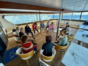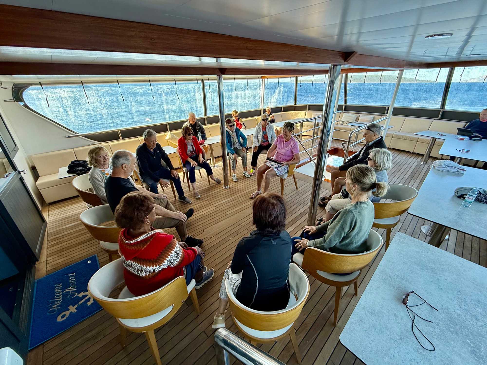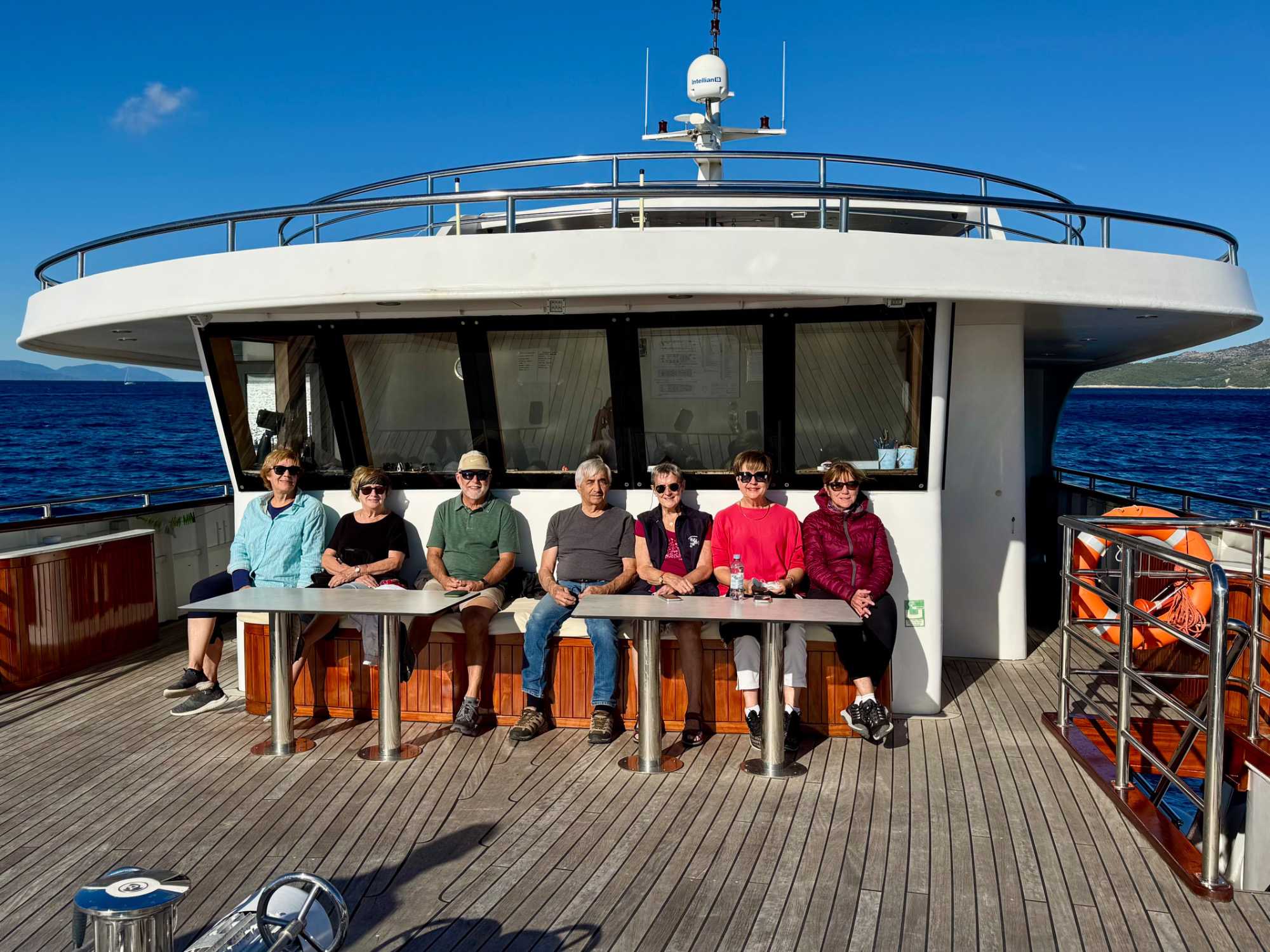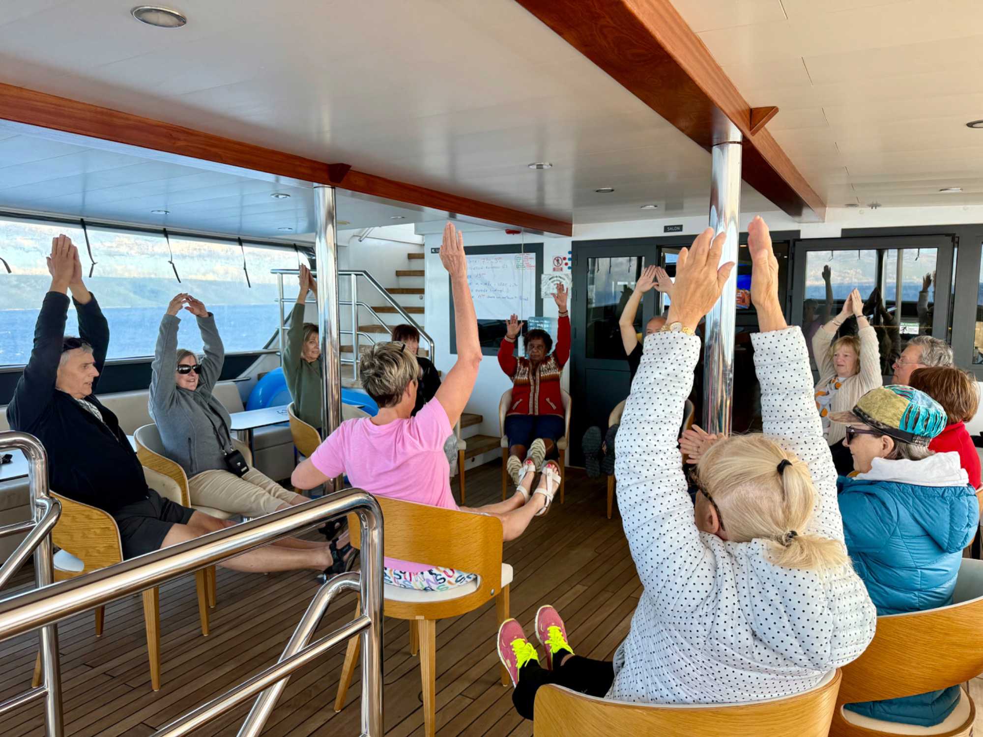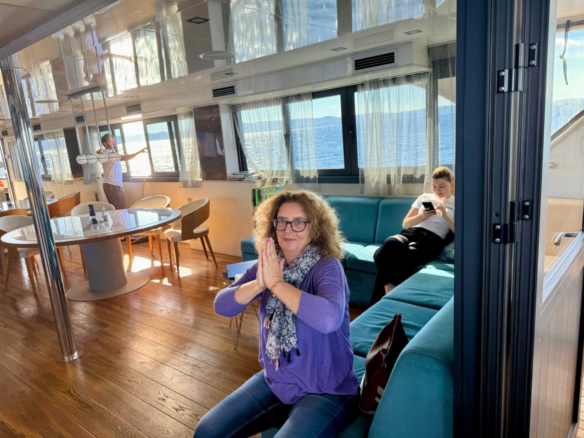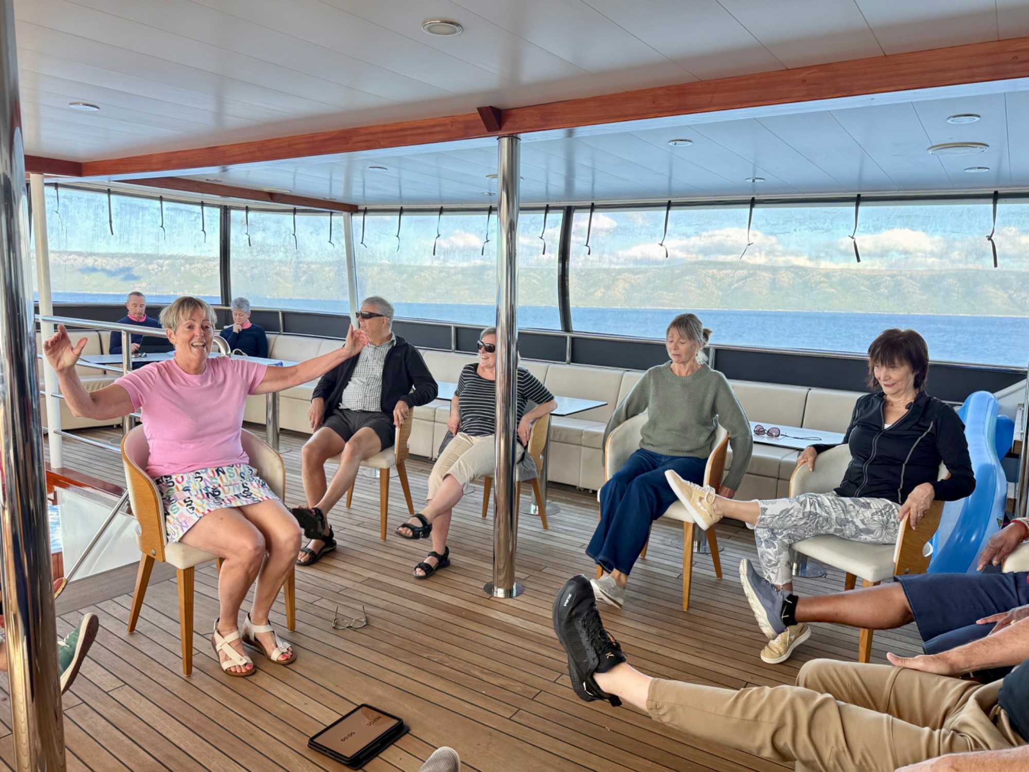 Lors de notre paisible matinée de navigation, les voyageurs ont profité du rythme tranquille de la mer Adriatique pour se détendre et partager de bons moments ensemble. Certains se sont retrouvés sur le pont pour une séance de yoga sur chaise guidée par Danielle, une parenthèse de douceur bercée par la brise marine. D’autres ont pris plaisir à discuter, à faire connaissance ou à s’adonner à des jeux de société dans une ambiance conviviale. Cette matinée a renforcé l’esprit de camaraderie à bord, tout en laissant à chacun l’espace pour savourer la traversée à son rythme. C’est un moment de pure détente, loin du quotidien. Les paysages environnants sont à couper le souffle, et nous nous sentons privilégiés d’être ici.