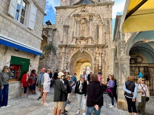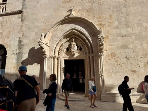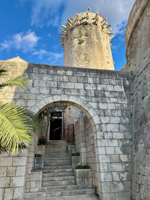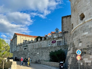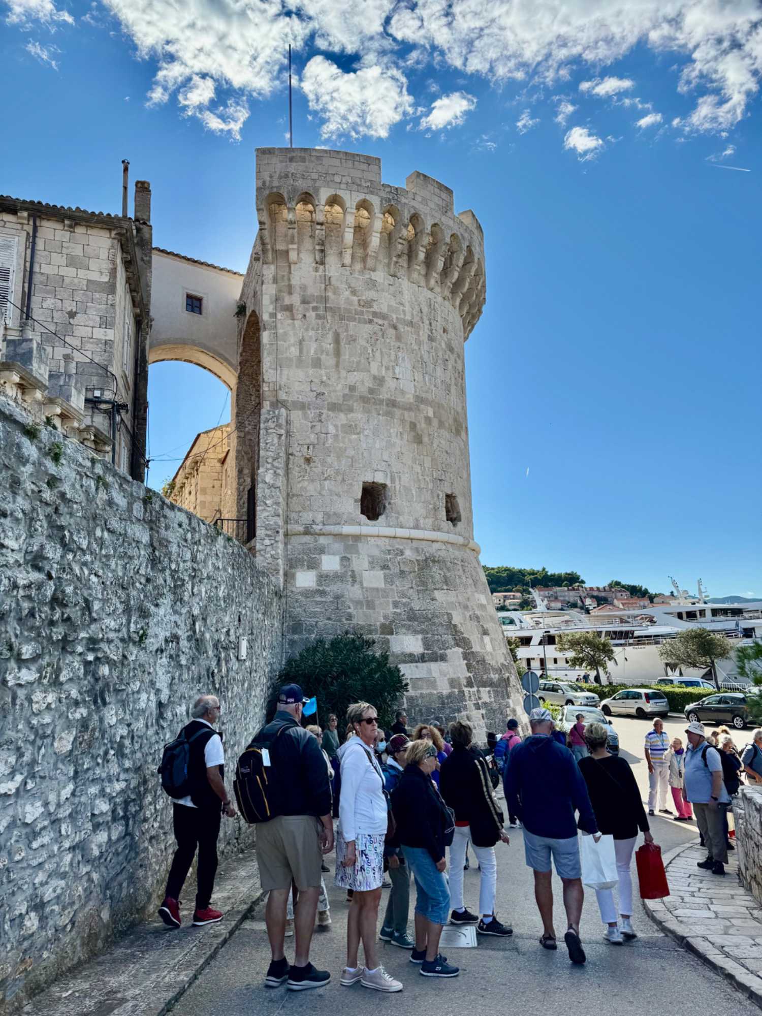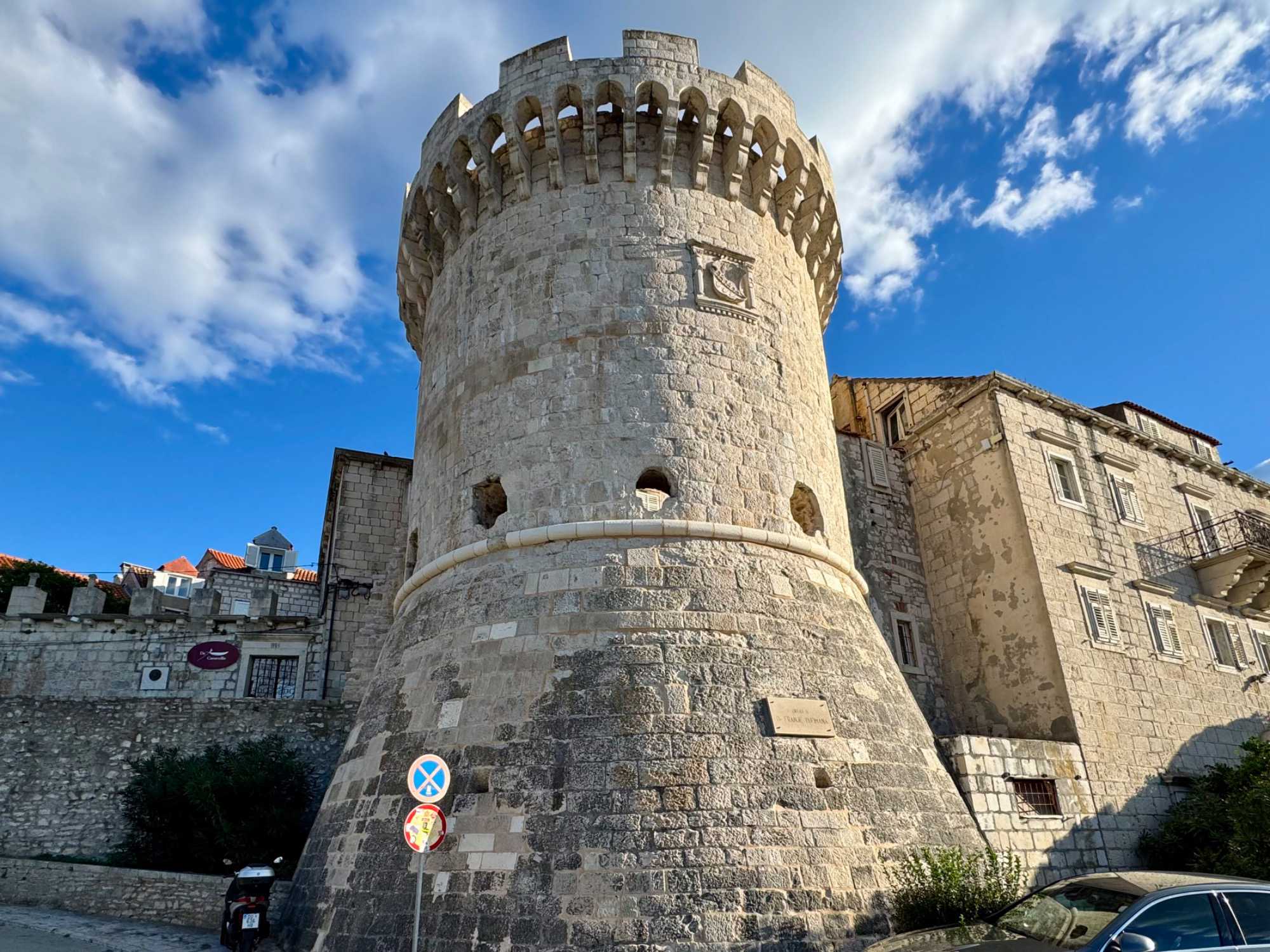 Isabelle nous emmène faire une visite de la ville. Son enthousiasme est contagieux, et nous sommes impatients d’en apprendre davantage sur l’histoire de cette île fascinante. C’est sur une petite péninsule que se trouve la vieille ville de Korčula, l’incontournable joyau de l’île. Les tours et remparts médiévaux de la vieille ville lui confèrent un cachet certain ! À l’intérieur de la fortification, les ruelles étroites qui séparent les beaux bâtiments font tout son charme. Cette ville fortifiée accueille le visiteur par la belle tour Revelin. Au milieu de la veille ville se dresse la belle Cathédrale Saint-Marc. Plusieurs musées peuvent être visités dans la ville, l’un d’entre eux étant consacré à la ville et un autre à Marco Polo.