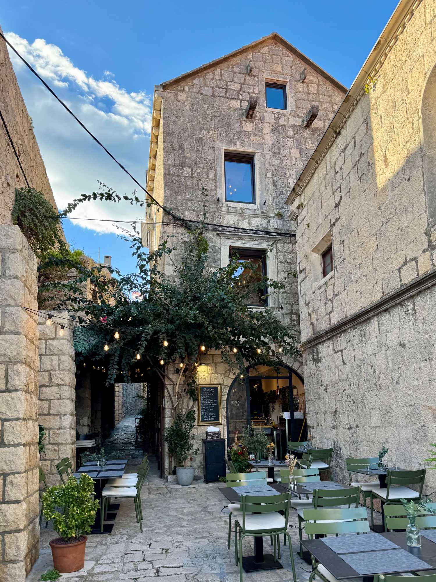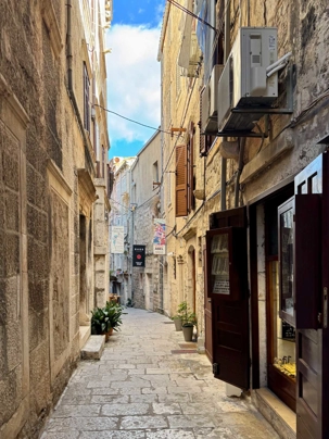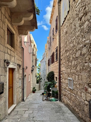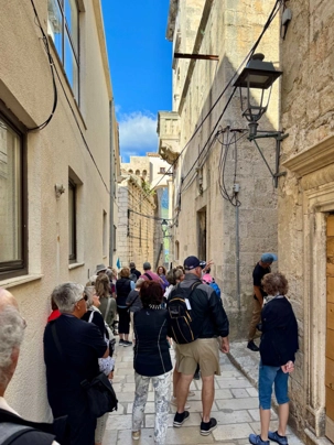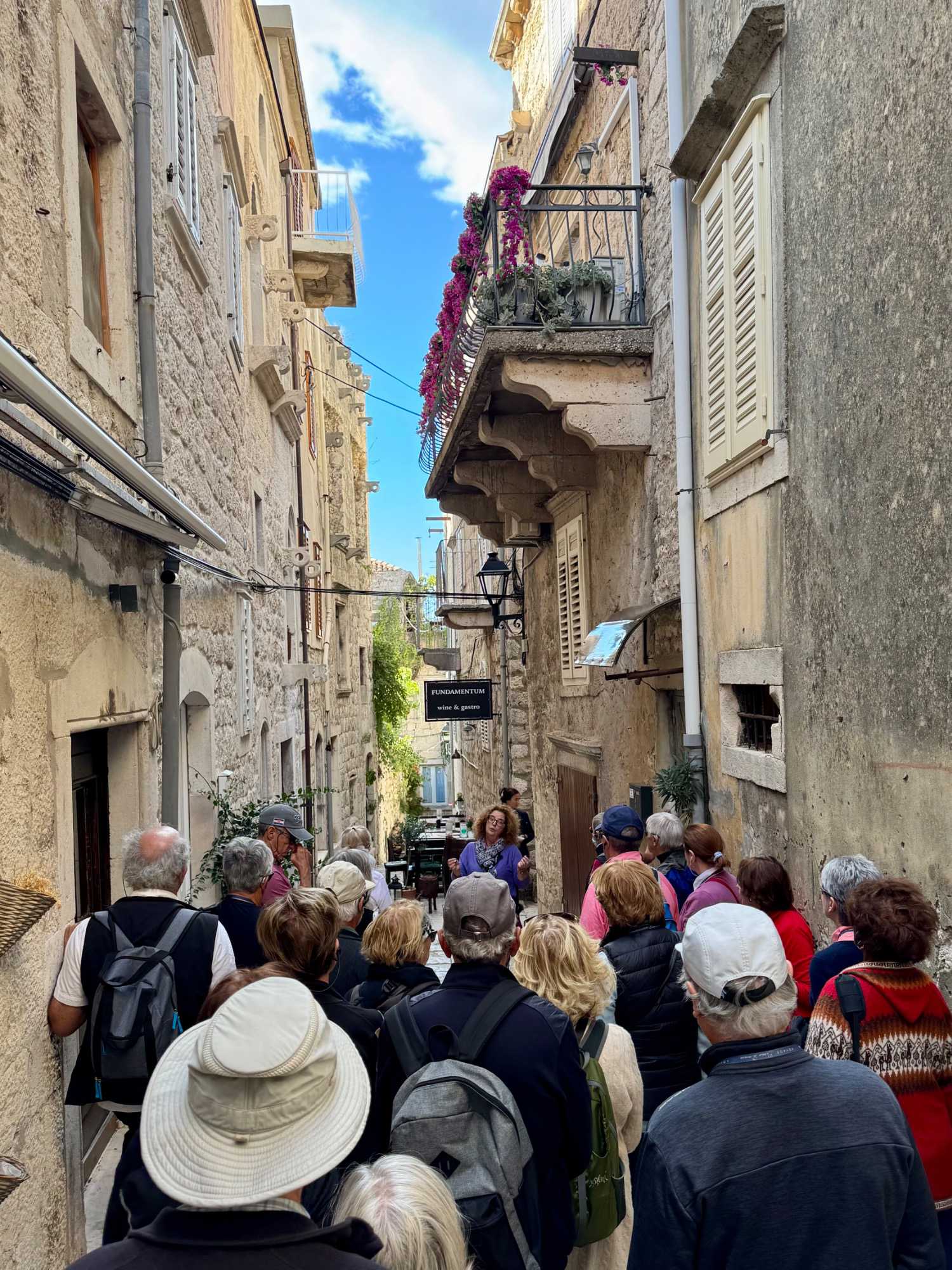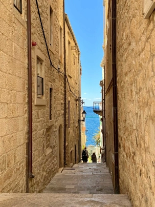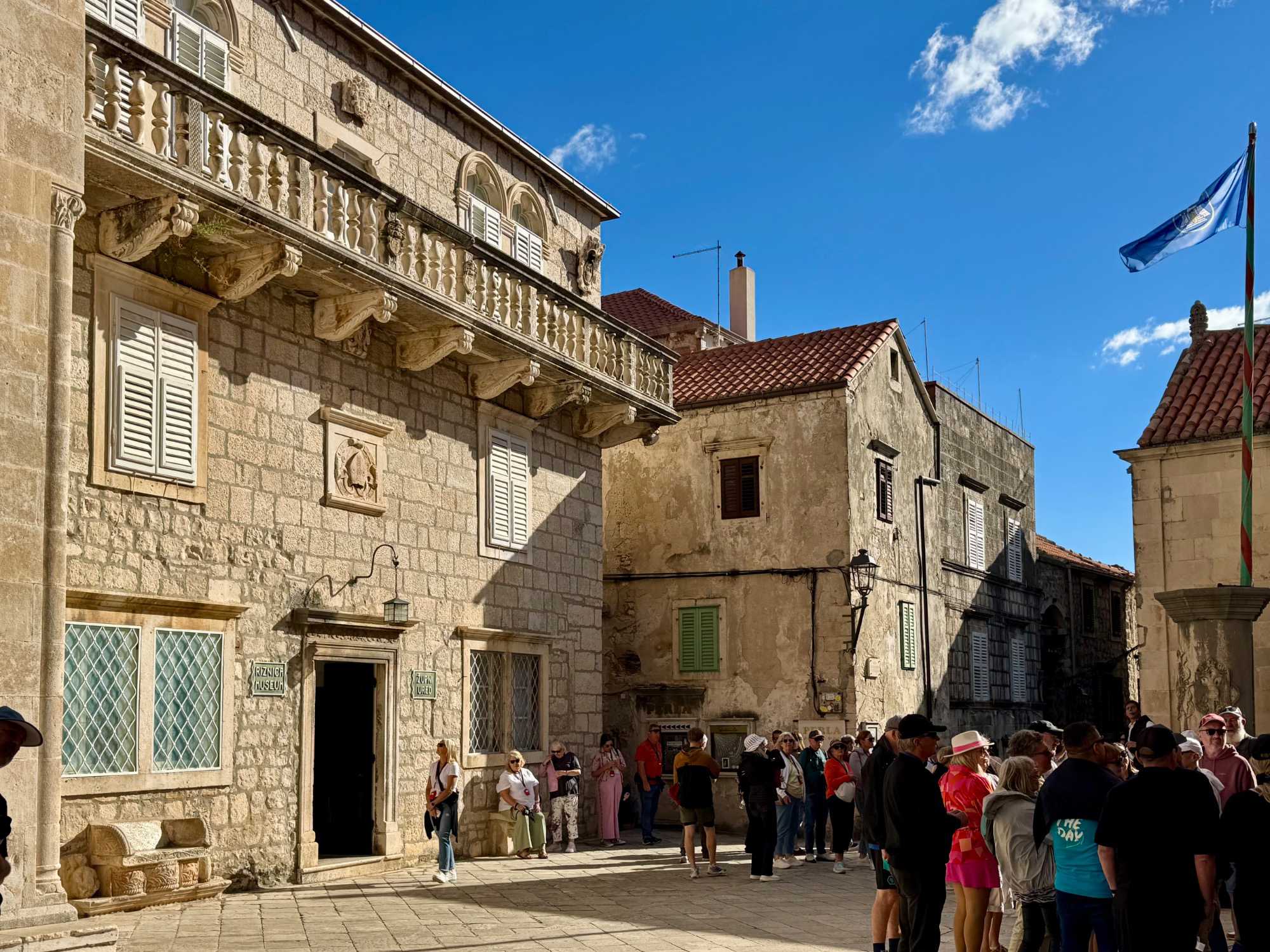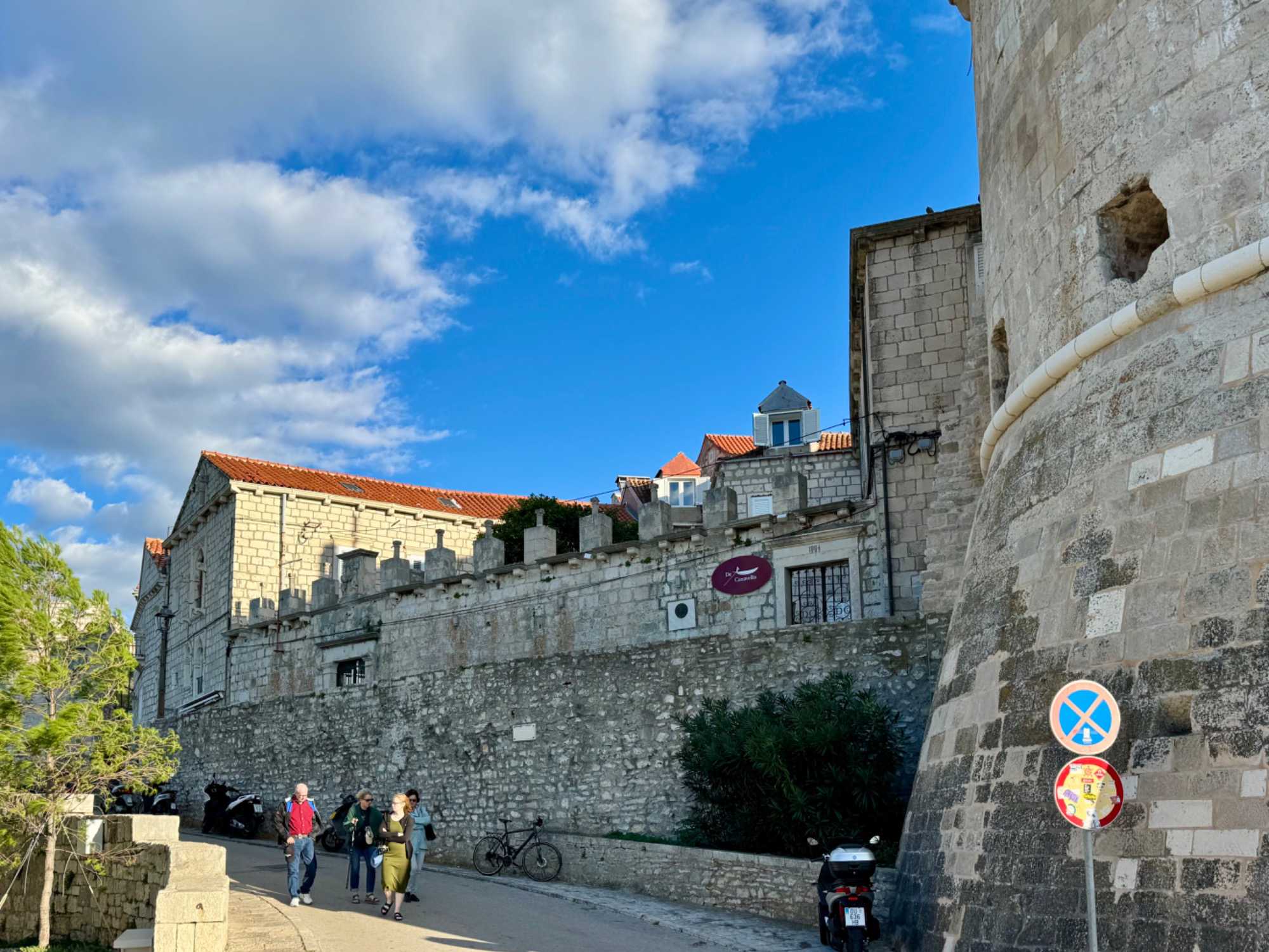 Nous explorons les ruelles étroites et pavées de Korčula, admirant l’architecture vénitienne qui a façonné son caractère unique. Isabelle nous parle des ingénieuses stratégies de construction qui ont permis à la ville de résister aux tempêtes et aux invasions. Chaque coin de rue semble raconter une histoire, et nous nous sentons transportés dans le temps.