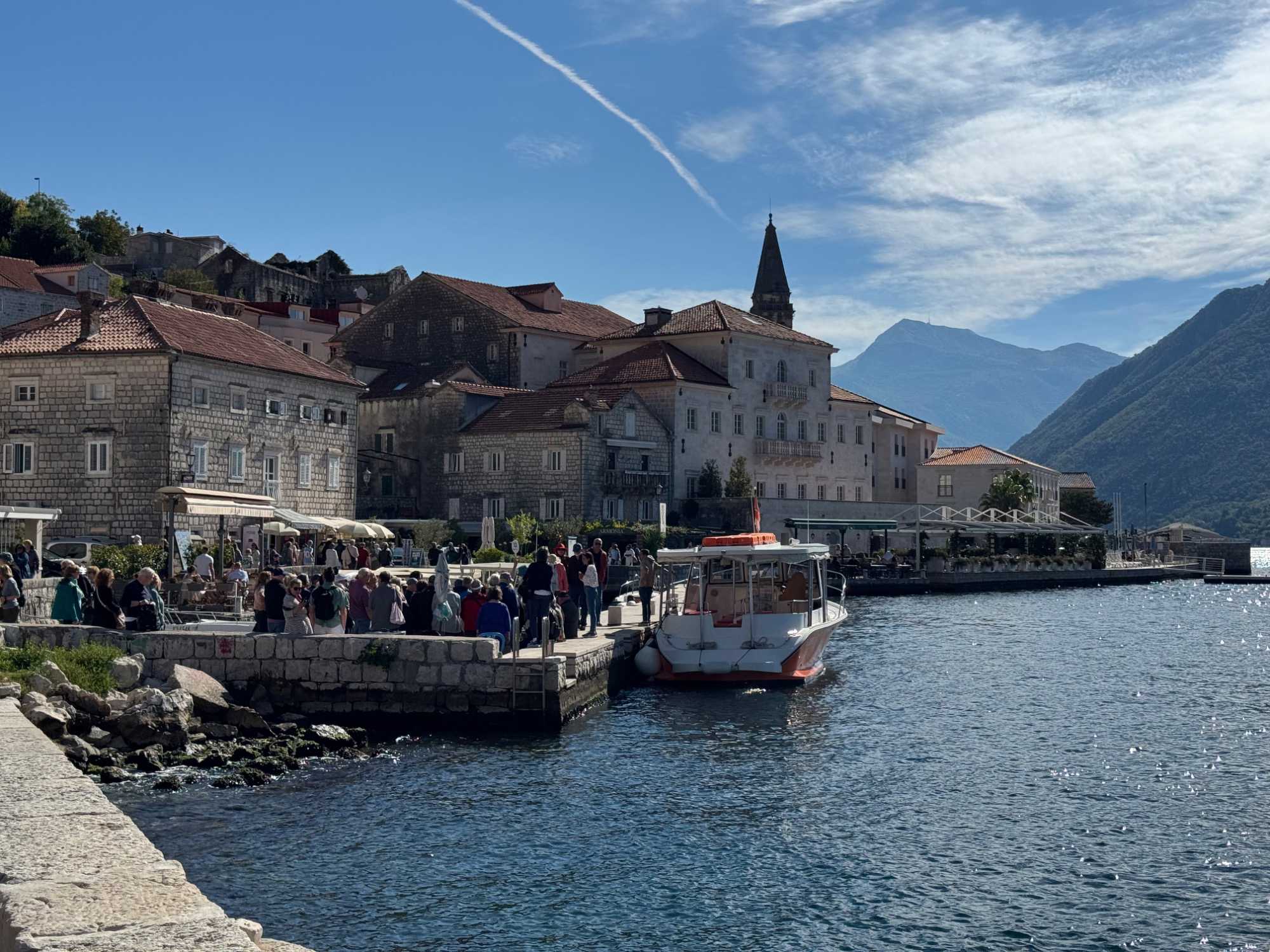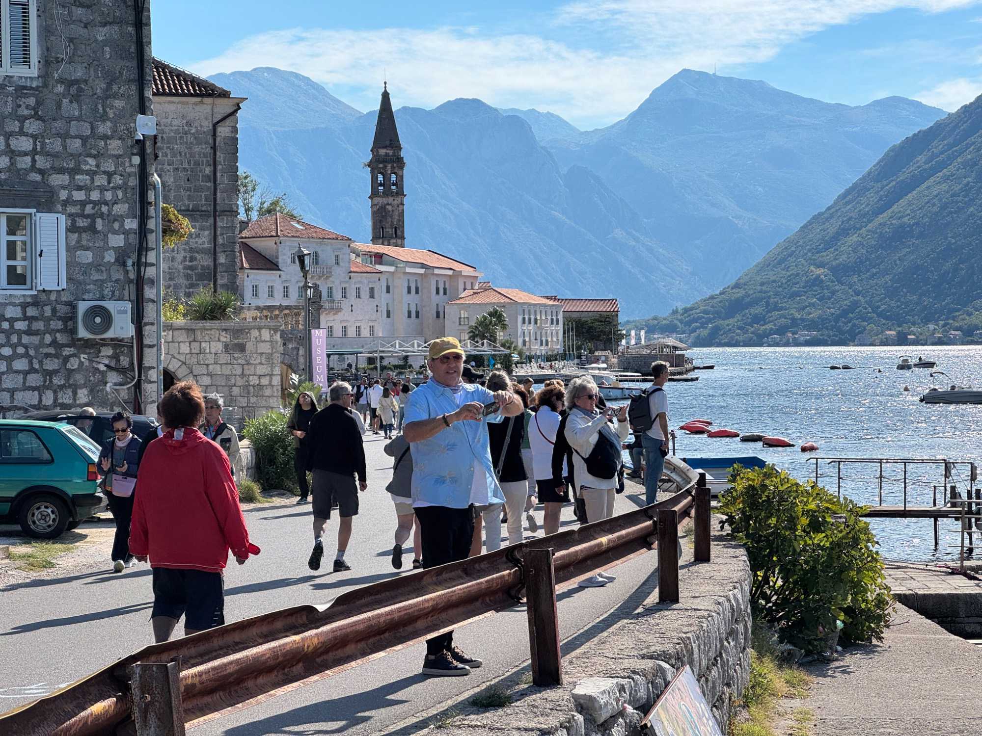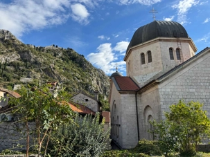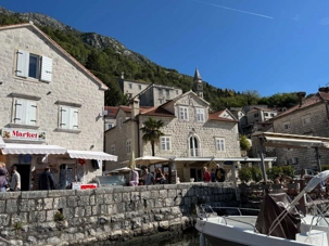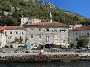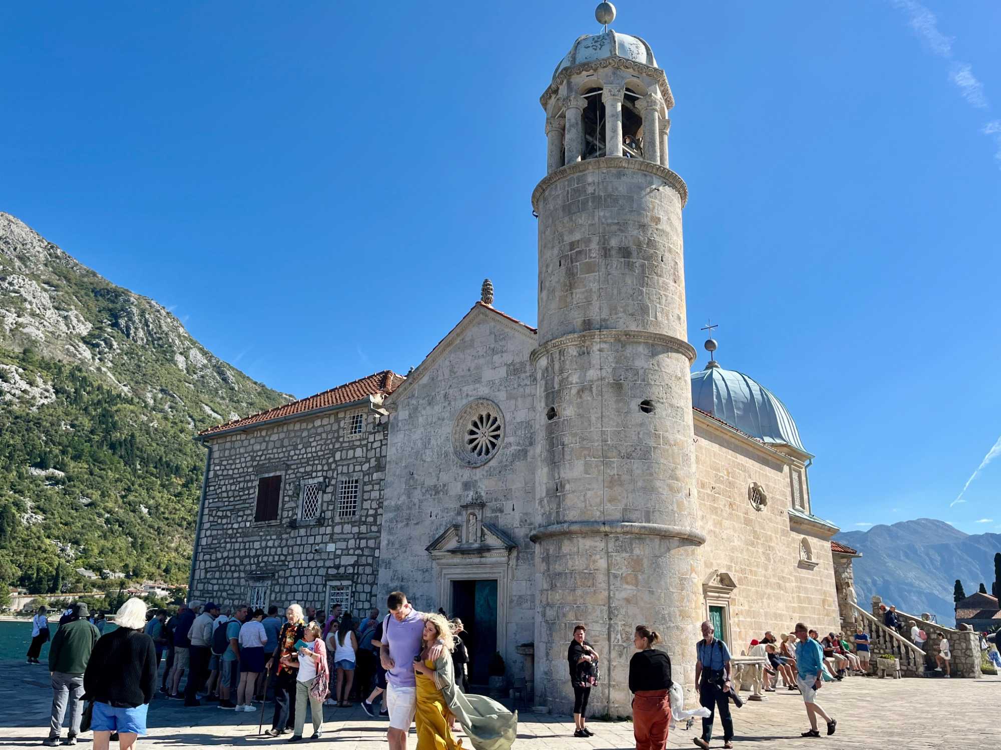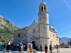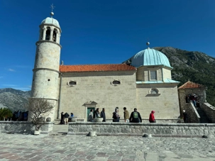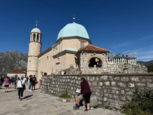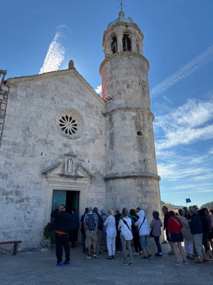 Notre premier arrêt se fait à la ville baroque de Perast. Cette charmante localité, avec ses maisons en pierre et ses ruelles étroites, nous plonge tout de suite dans l’histoire. Nous montons à bord d’un bateau qui nous mène vers l’îlot de Notre-Dame-du-Rocher. La traversée est agréable et offre une vue imprenable sur la côte.