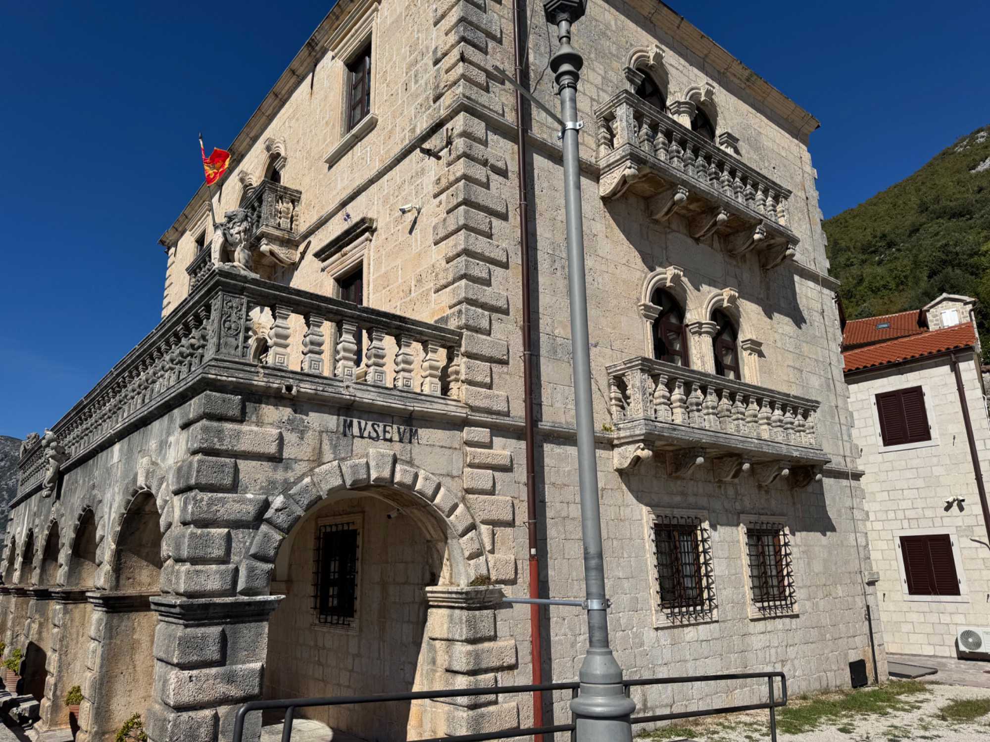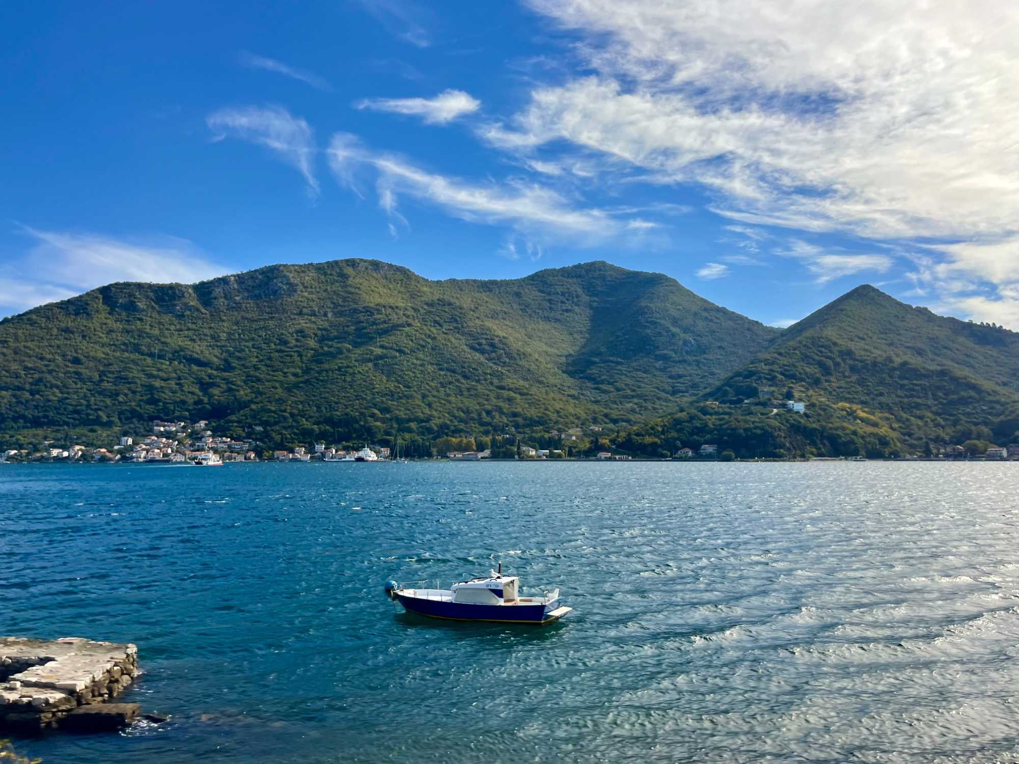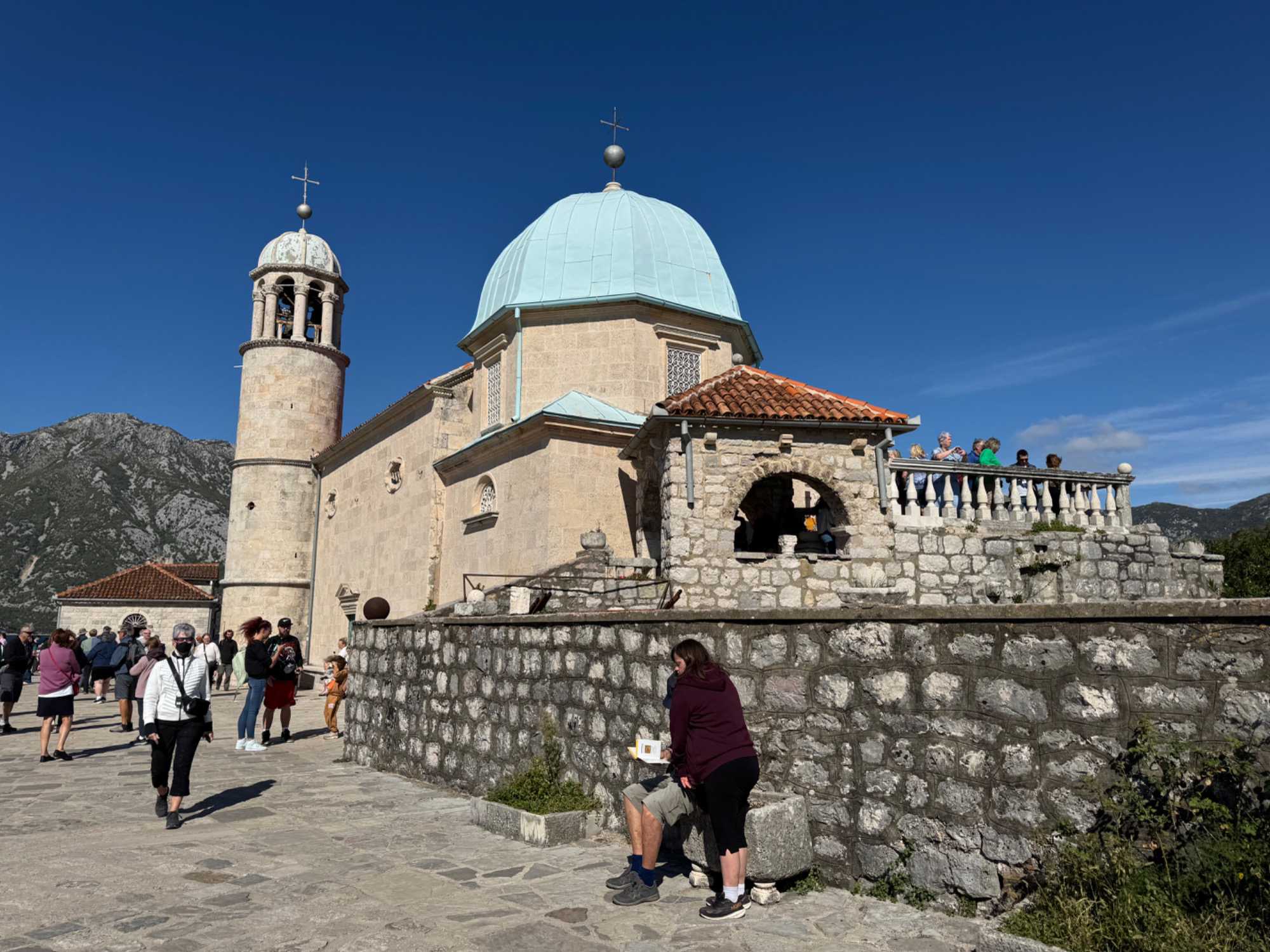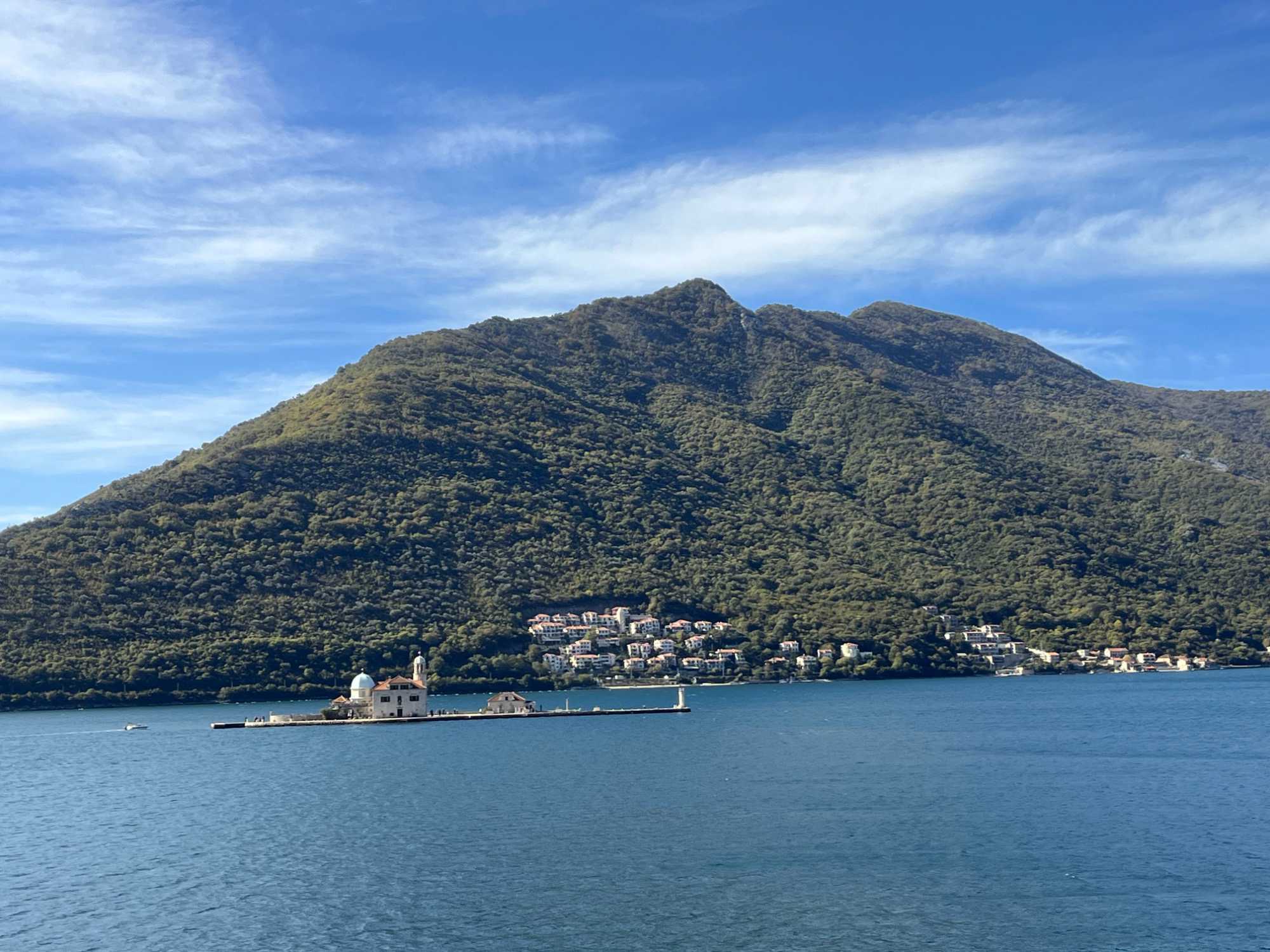 Notre premier arrêt se fait à la ville baroque de Perast. Cette charmante localité, avec ses maisons en pierre et ses ruelles étroites, nous plonge tout de suite dans l’histoire. Nous montons à bord d’un bateau qui nous mène vers l’îlot de Notre-Dame-du-Rocher. La traversée est agréable et offre une vue imprenable sur la côte.