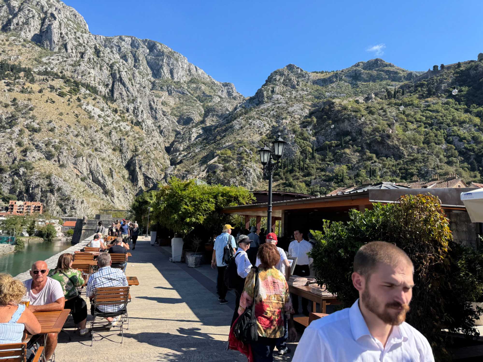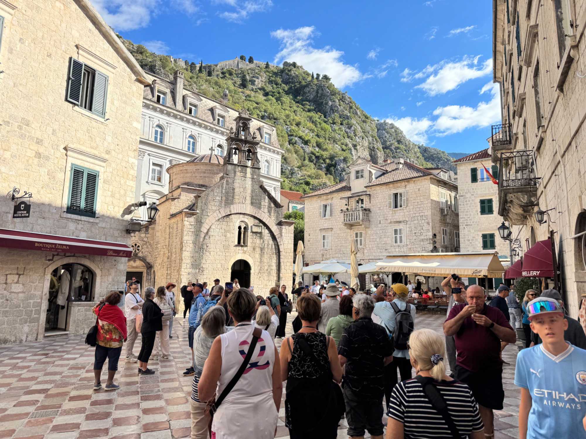 Nous visitons la vieille ville de Kotor, à l’intérieur de l’enceinte des murailles. Elle est ceinturée par plus de 4,5 km de remparts. Extrêmement difficile de ne pas tomber sous le charme de cette superbe ville médiévale. Aujourd’hui, Kotor a littéralement été prise d’assaut par les touristes avec l’arrivée simultanée de trois navires de croisière ! Notre guide nous fait faire le tour des principales attractions à voir et l’on peut dire que nous en avons eu plein la vue !