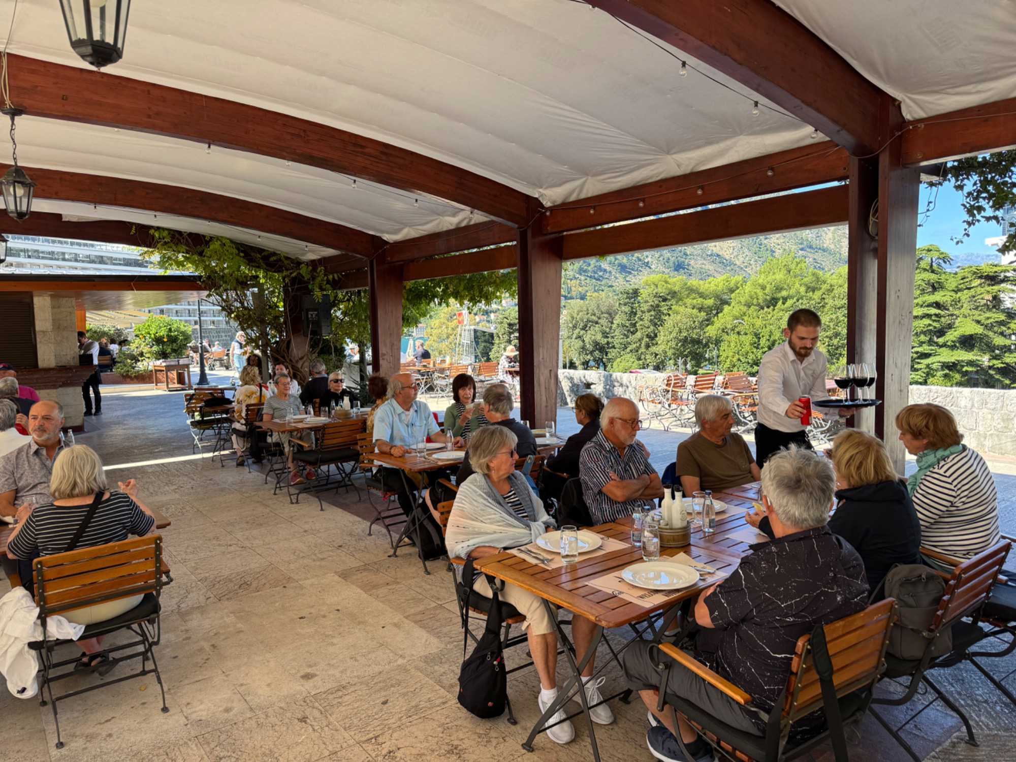 Après un copieux déjeuner à bord et nos dernières salutations à la formidable équipe du M/S Summer, nous nous préparons pour le débarquement du navire, impatients de découvrir le Monténégro. Situé à moins d’une heure de route de Dubrovnik, ce pays promet une expérience mémorable grâce à sa nature spectaculaire et à sa richesse culturelle. Nous montons dans notre confortable autobus pour aller en direction de notre première destination.