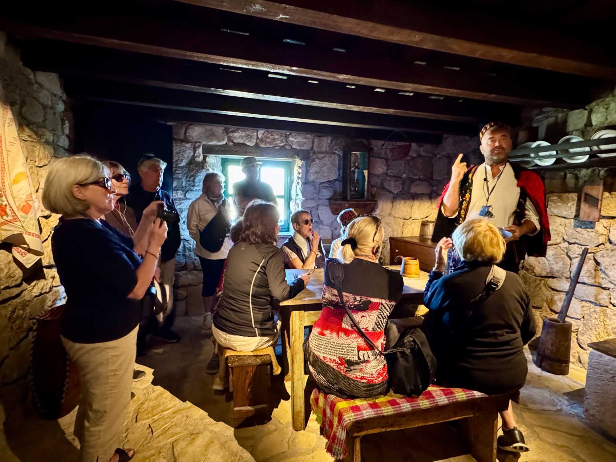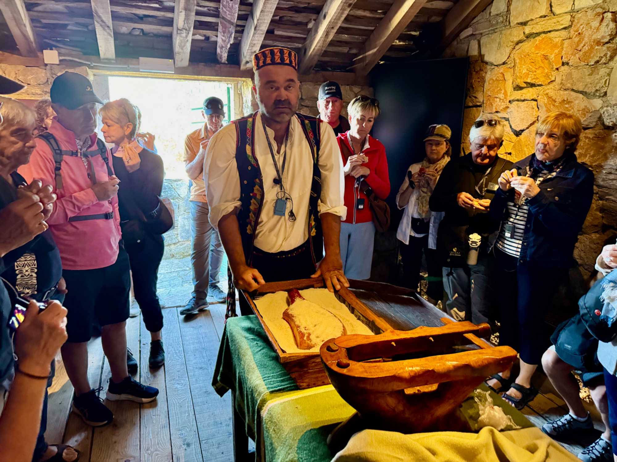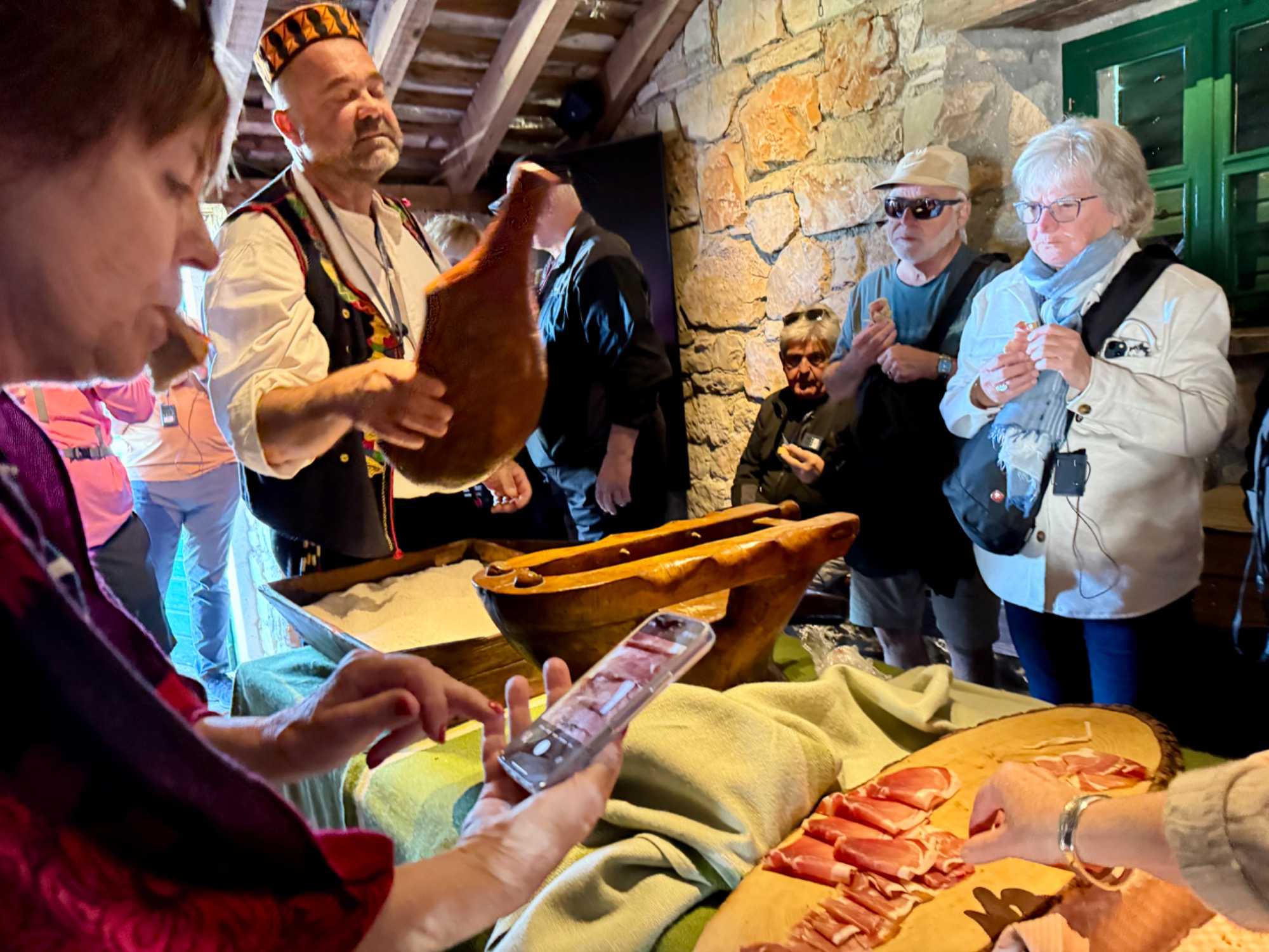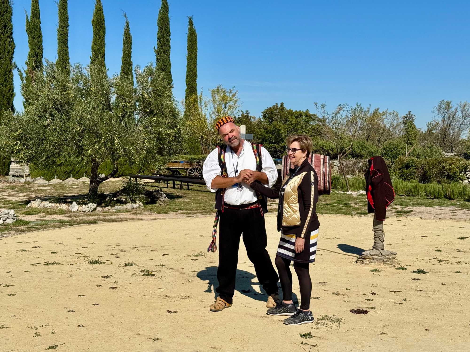 Puis, nous remontons à bord de notre autobus pour aller à Etnoland. Nous y sommes accueillis dans une ambiance chaleureuse. Etnoland Dalmati est un parc thématique familial situé non loin de la ville de Šibenik. Il offre un mélange unique de culture, de tradition et d’histoire. Ce site est un vrai monument du patrimoine culturel de l’arrière-pays dalmate, il nous offre une rencontre inédite avec l’ancien artisanat et les coutumes authentiques. Nous y voyons une maison typique de la Dalmatie et un jardin débordant d’épices et de légumes de la région. Nous faisons une dégustation du fameux prosciutto de Drniš. Nous sommes tous captivés par la présentation de notre hôte et certains d’entre nous n’hésitent pas à poser des questions, entraînés par un enthousiasme contagieux. Guy et Gilles nous font une belle chanson de Jacques Brel, « La Quête », pour expérimenter l’acoustique de l’amphithéâtre du village.