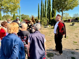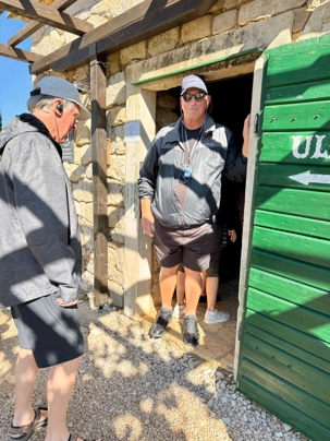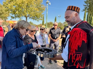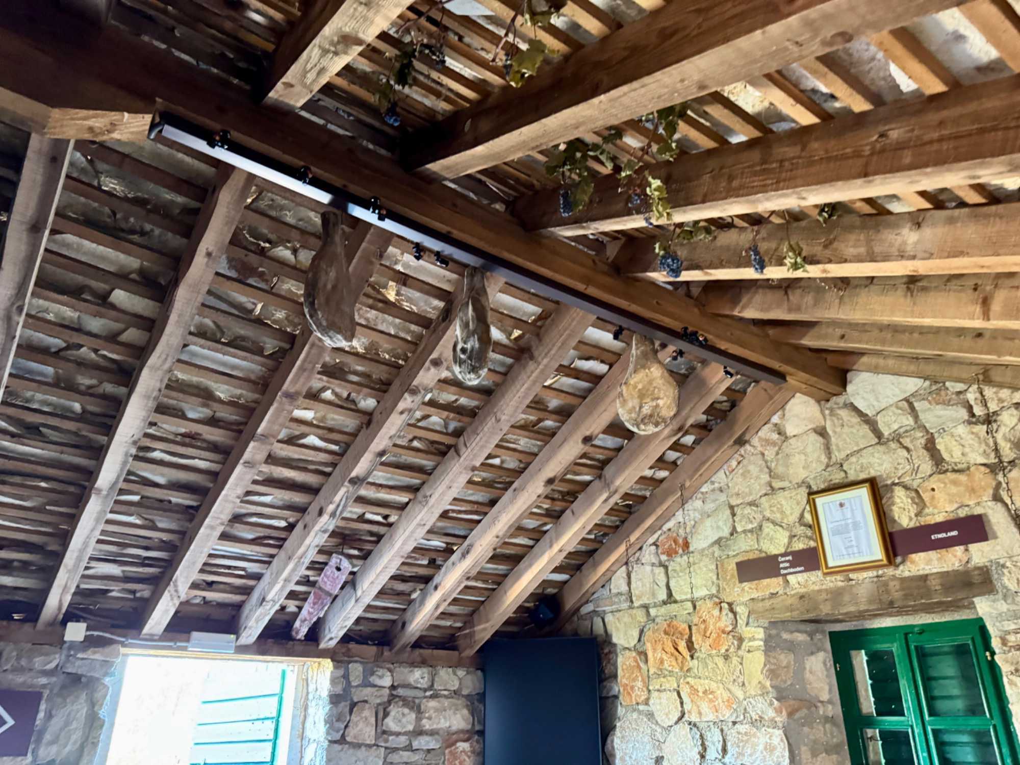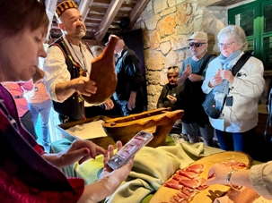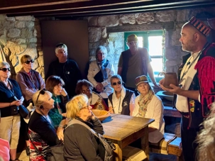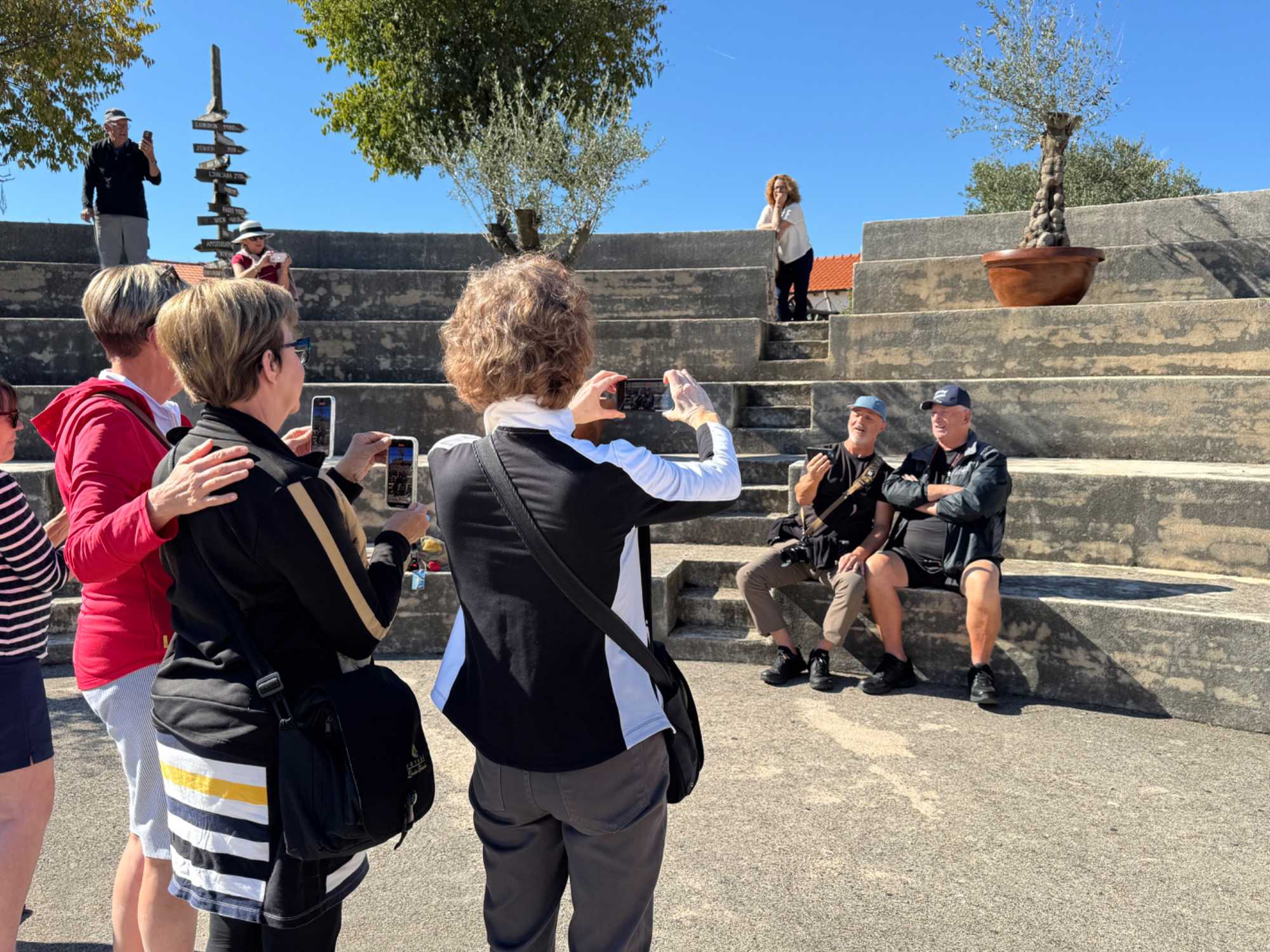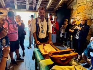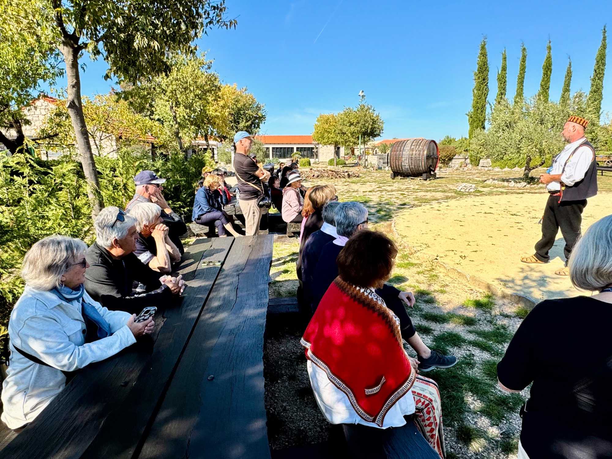 Puis, nous remontons à bord de notre autobus pour aller à Etnoland. Nous y sommes accueillis dans une ambiance chaleureuse. Etnoland Dalmati est un parc thématique familial situé non loin de la ville de Šibenik. Il offre un mélange unique de culture, de tradition et d’histoire. Ce site est un vrai monument du patrimoine culturel de l’arrière-pays dalmate, il nous offre une rencontre inédite avec l’ancien artisanat et les coutumes authentiques. Nous y voyons une maison typique de la Dalmatie et un jardin débordant d’épices et de légumes de la région. Nous faisons une dégustation du fameux prosciutto de Drniš. Nous sommes tous captivés par la présentation de notre hôte et certains d’entre nous n’hésitent pas à poser des questions, entraînés par un enthousiasme contagieux. Guy et Gilles nous font une belle chanson de Jacques Brel, « La Quête », pour expérimenter l’acoustique de l’amphithéâtre du village.