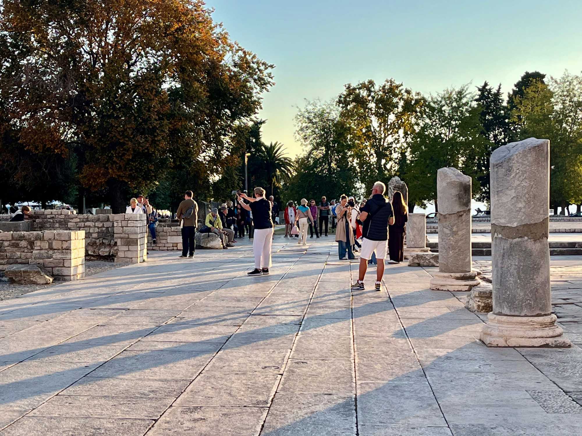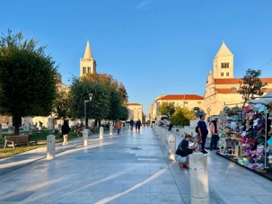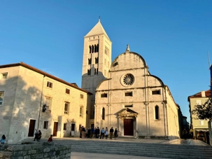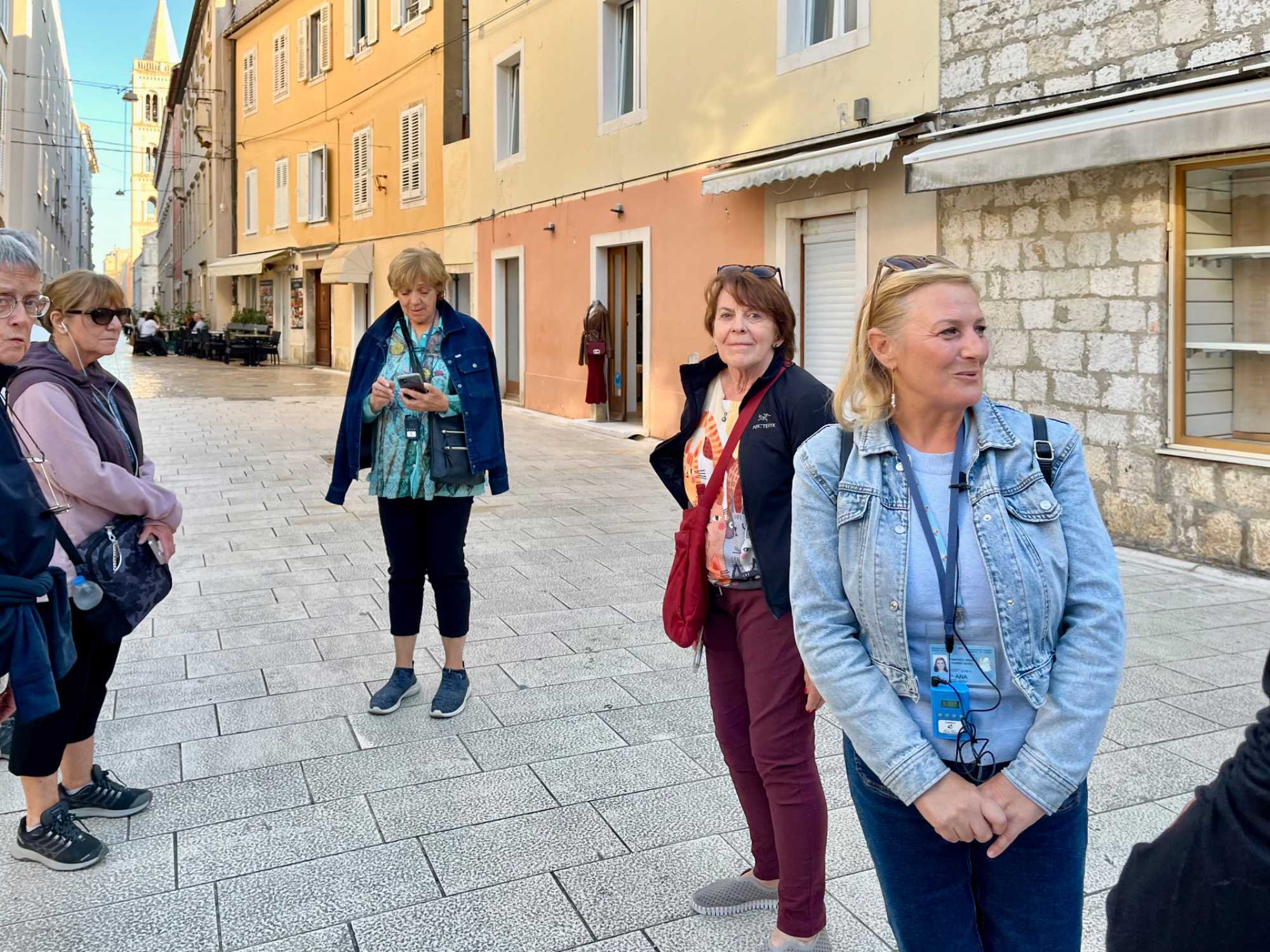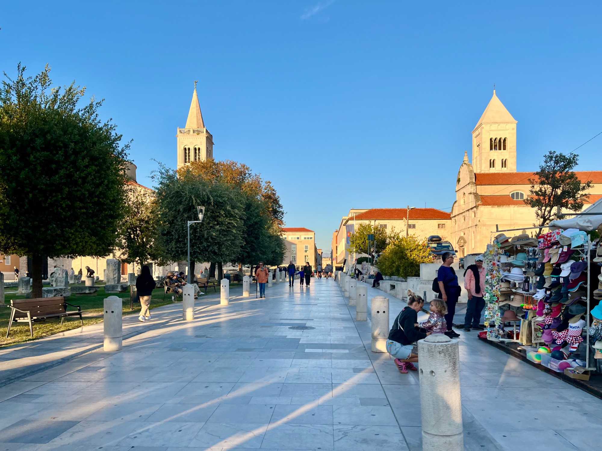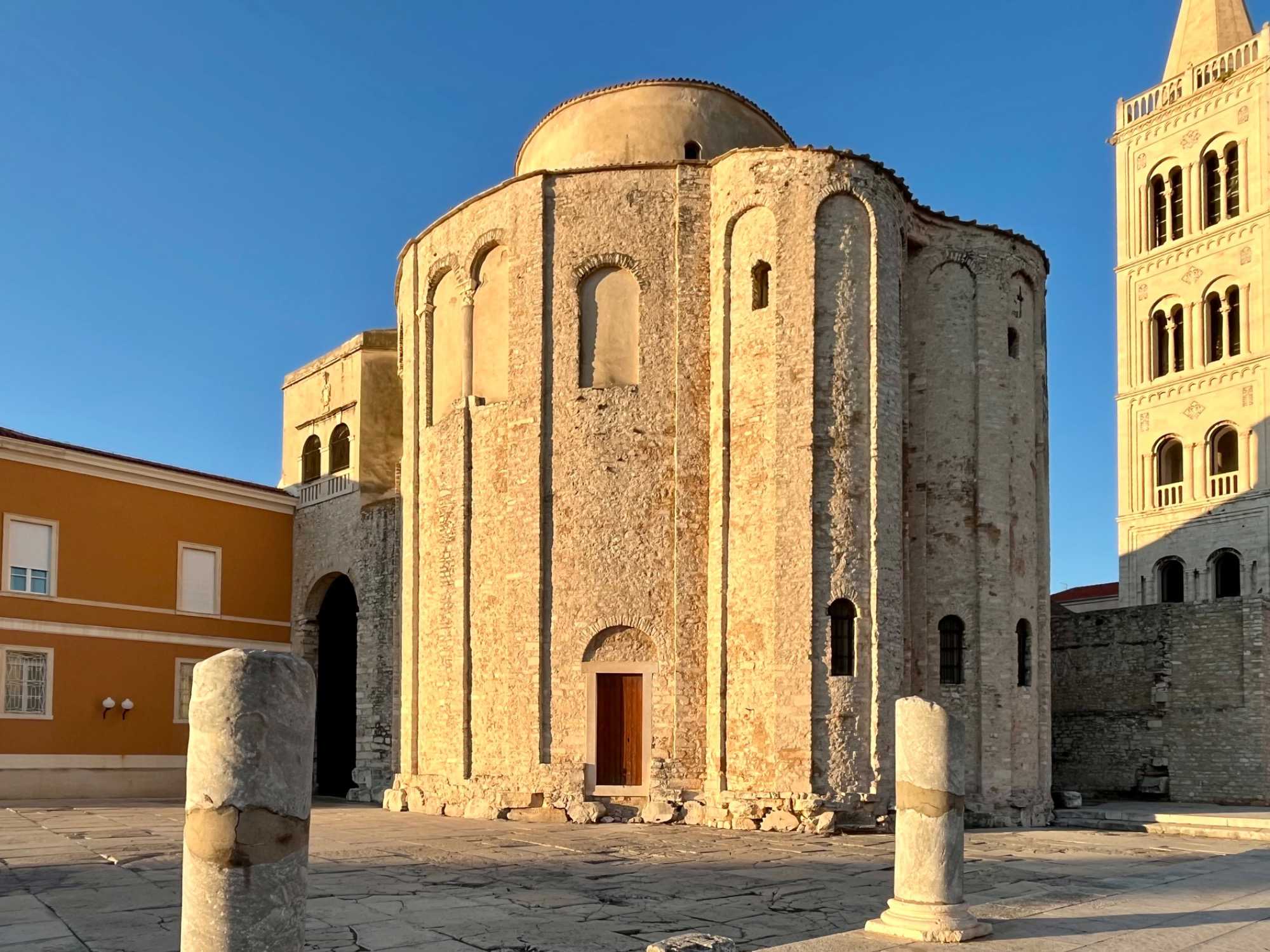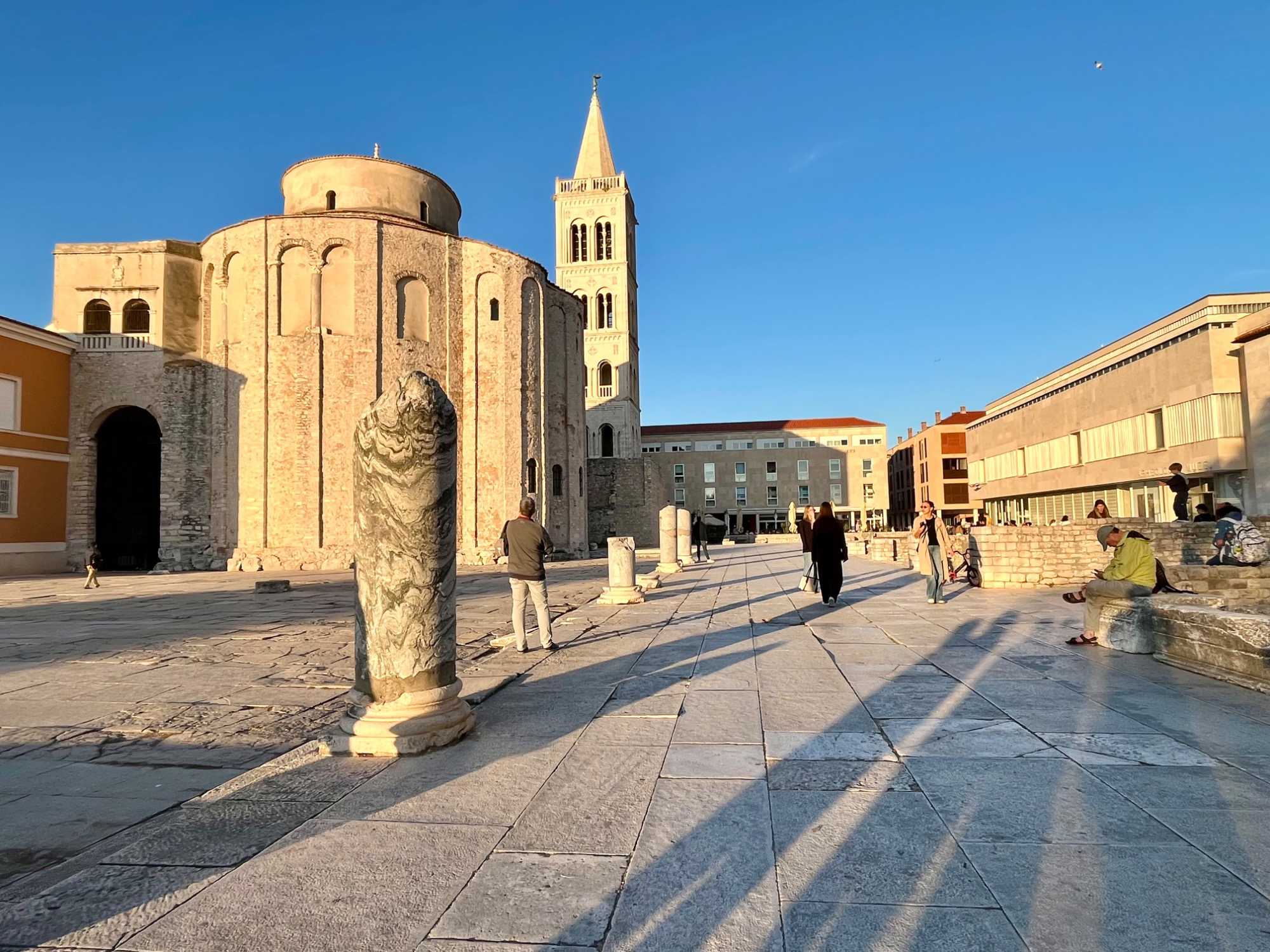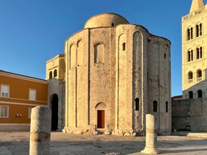 Nous faisons un grand tour de cette splendide vieille ville aux pavés de marbre, parcourons la ville intra-muros pour sentir l’ambiance. En nous promenant dans les ruelles pavées du centre historique, nous apercevons également des vestiges de la conquête romaine, témoignant de l’importance de Zadar tout au long de l’histoire. Anna nous parle également de l’époque byzantine, lorsque Zadar était un centre administratif. Ses récits historiques ajoutent une dimension fascinante à notre exploration, et nous ressentons vraiment le poids des siècles en déambulant parmi ces monuments.