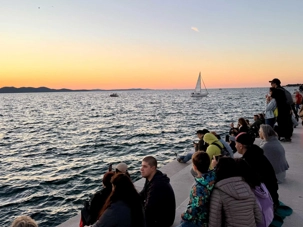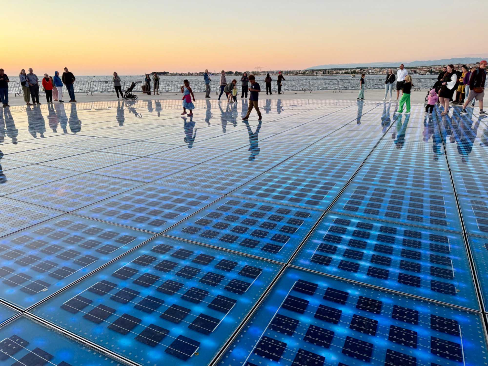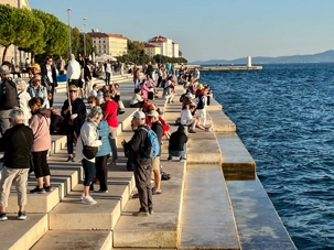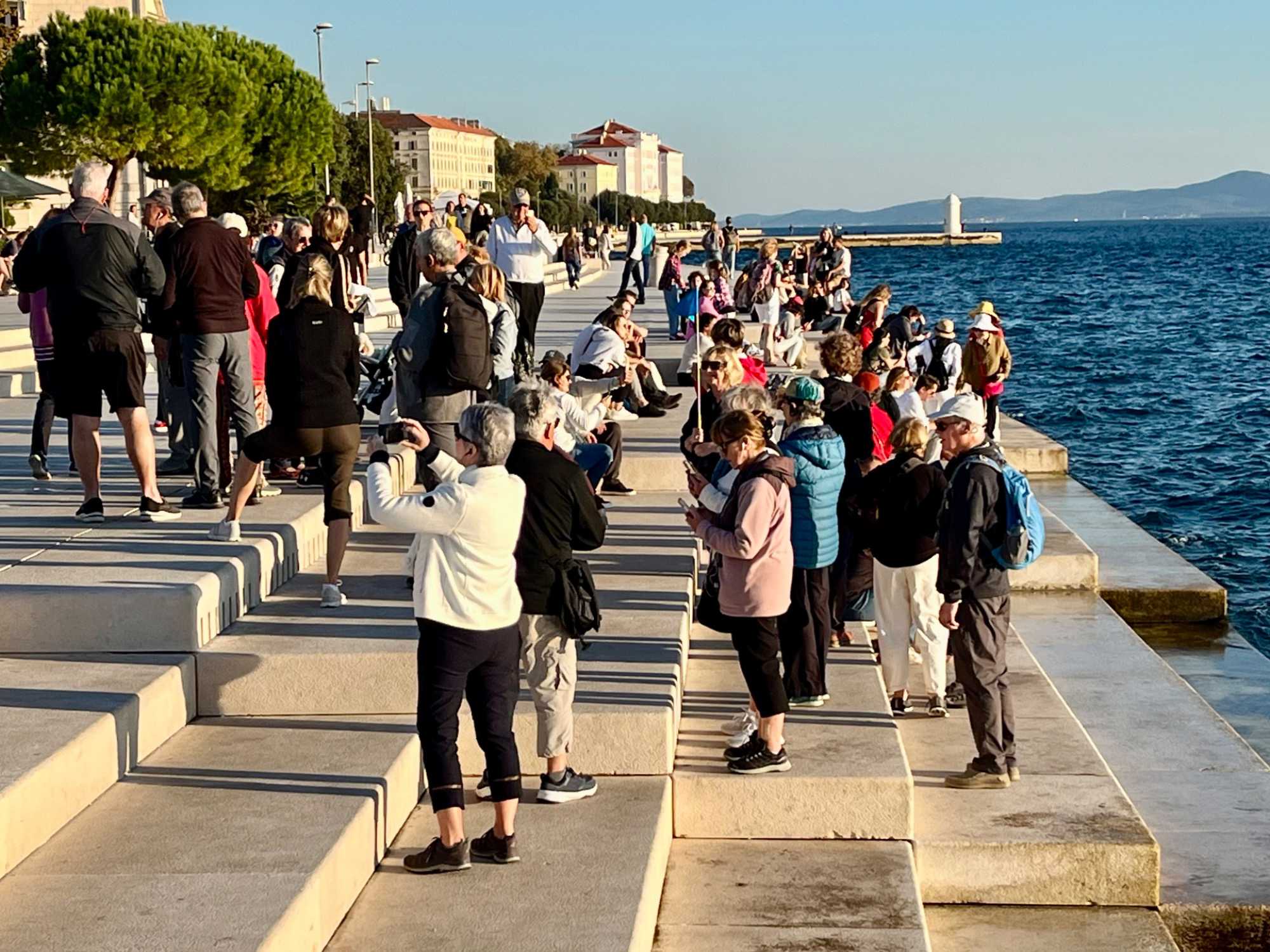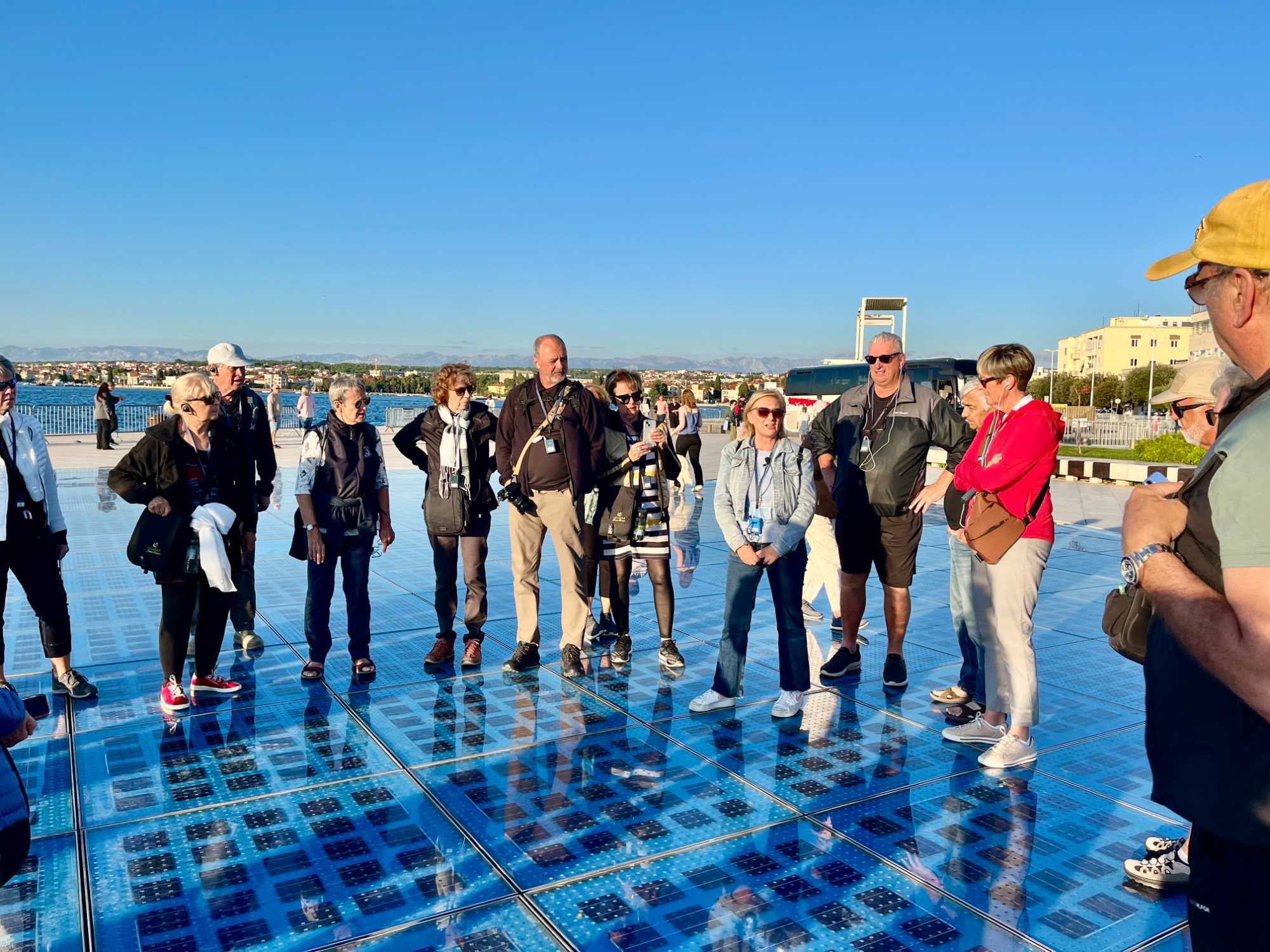 Après, nous reprenons la route vers Zadar. À notre arrivée, nous commençons notre visite guidée de cette ville historique. Notre guide Anna, nous révèle l’histoire fascinante de Zadar, dont le port et la vieille ville débordent de caractère. Elle nous amène voir un endroit magique : Le Site du Soleil Levant. C’est un ensemble d’installations artistiques, notamment l’orgue marin et le salut au soleil. C’est le vent et l’eau de mer qui s’engouffrent dans un ingénieux système de 35 tuyaux situés dans les escaliers percés de trous. L’énergie des éléments produit ensuite des sons qui s’échappent des perforations. Tandis que le salut au soleil, avec ses panneaux photovoltaïques, capte l’énergie solaire pour produire des jeux de lumière la nuit venue. Il y est aussi inscrit au pourtour, les anniversaires importants des gens qui ont marqué l’histoire de la Croatie en plus de constituer un cadran solaire. Ces deux œuvres offrent une expérience unique au lever du soleil. Nous avons pris le temps de nous imprégner de ce moment unique au son de l’orgue. Poursuivant doucement notre balade en bord de mer, Anna nous introduit à ce qui se dévoilera derrière ces remparts médiévaux, soit un musée à ciel ouvert, tout de pierre blanche habillé, où l’on peut contempler plus de 3000 ans d’histoires, marqués par le passage des romains, des vénitiens et autrichiens qui ont laissé autant d’églises de confessions différentes. Dans une vieille ville largement piétonne, il fait bon prendre le temps de flâner. Encore une fois nous sommes conquis.