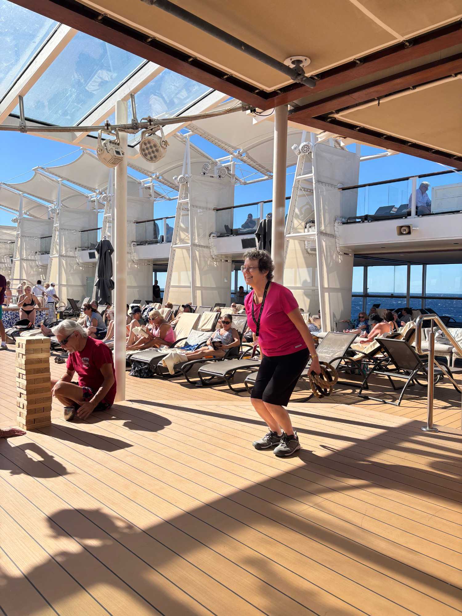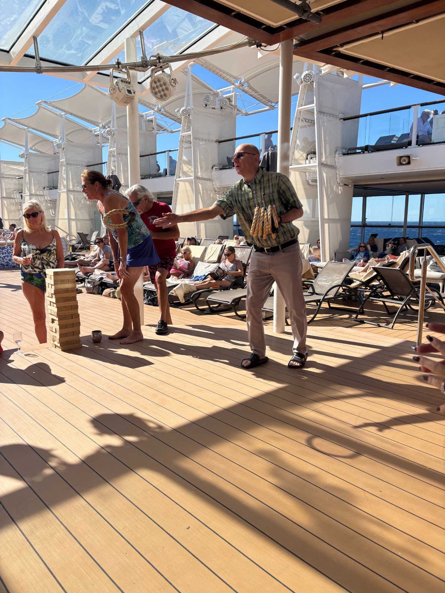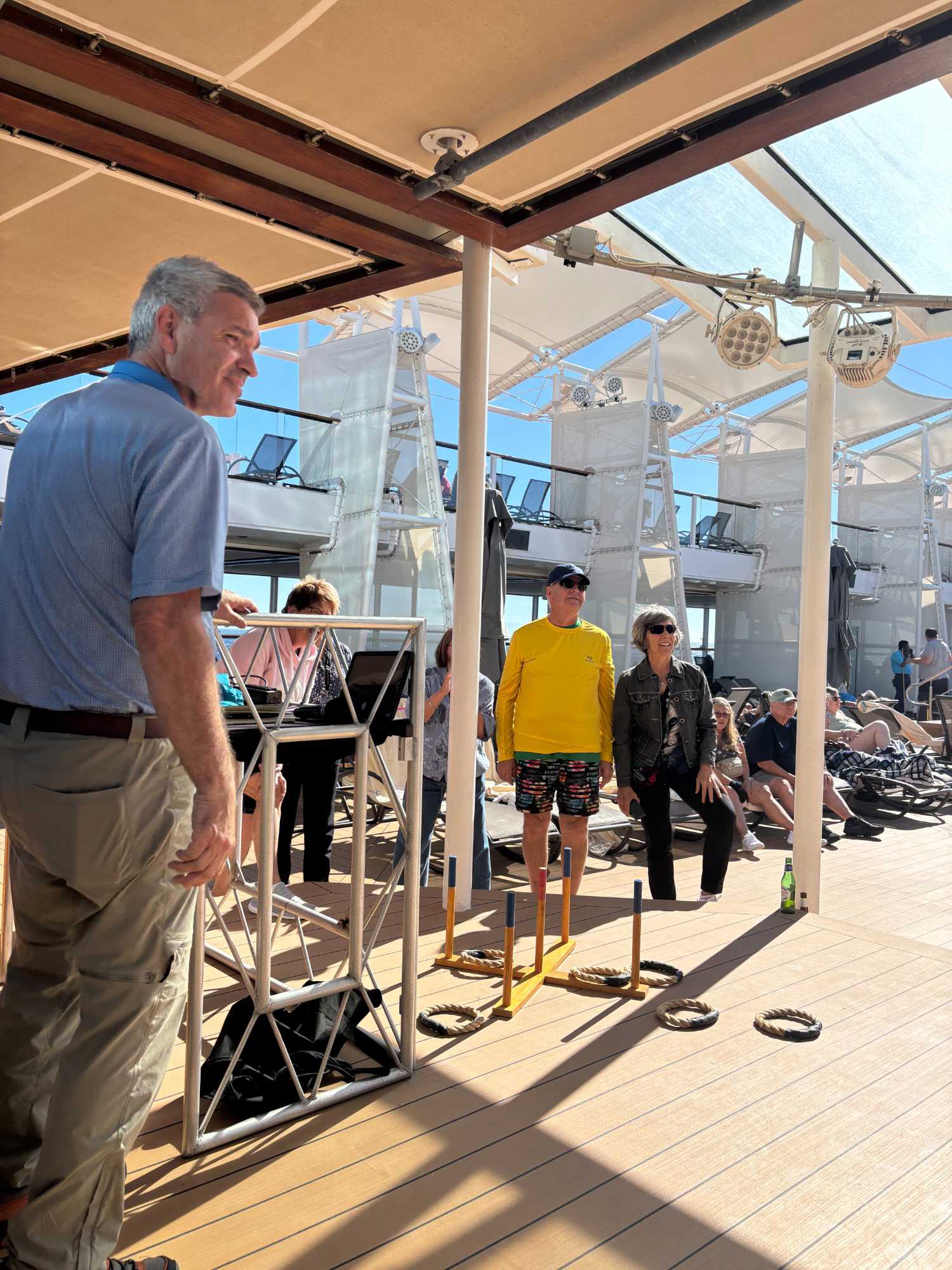 En après-midi, Eric convie ceux qui le veulent à un tournoi amical de jeu d'anneaux près de la piscine! Fou-rires et exclamations foisonnent sous les regards amusés des passagers qui se prélassent à la piscine. Anne-Marie fut notre grande gagnante et se mérite un bouteille réutilisable du marché local de Florence ! Bravo Anne-Marie, nous saurons auprès de qui prendre des conseils pour améliorer notre lancer!