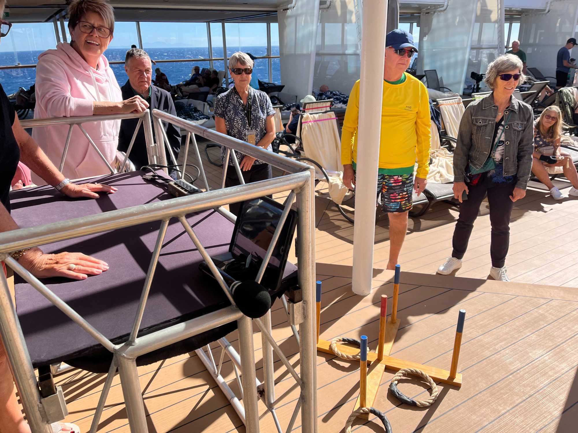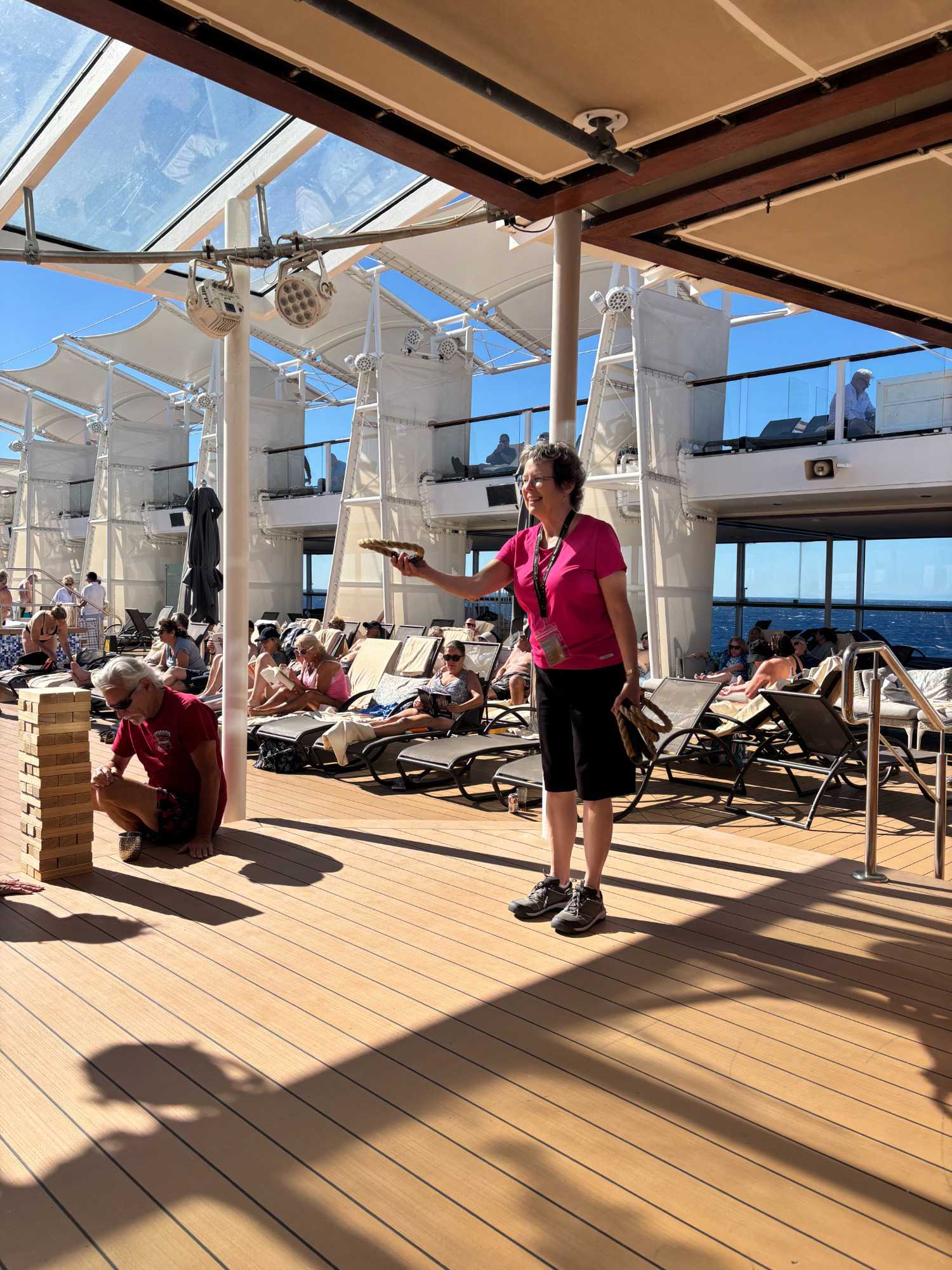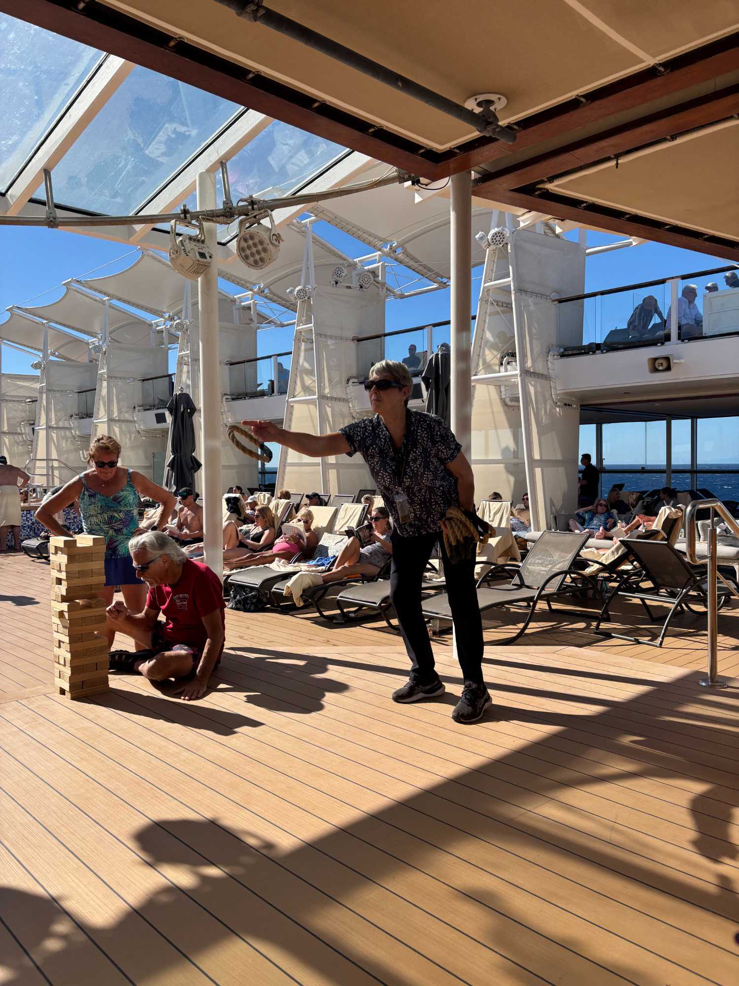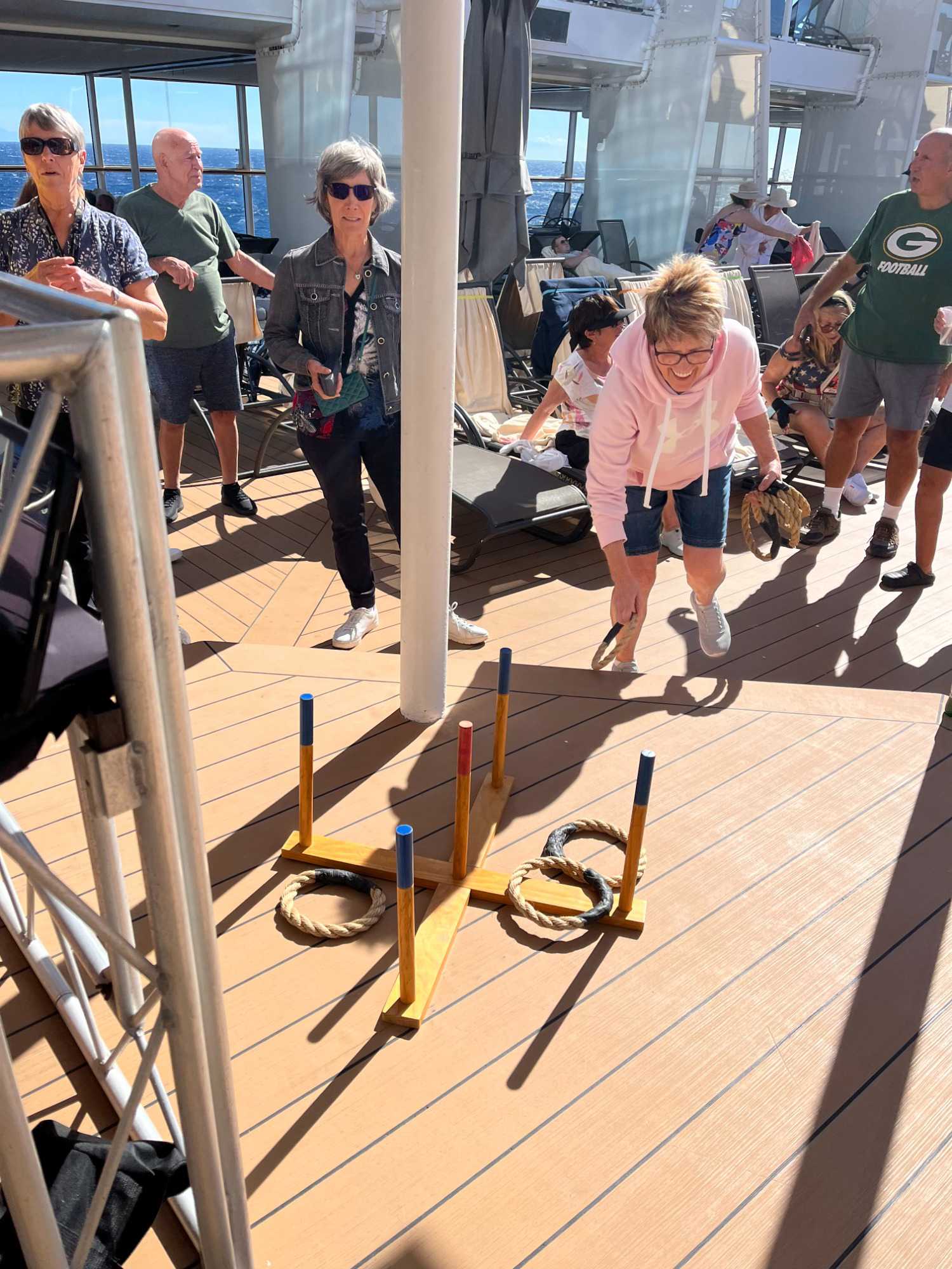 En après-midi, Eric convie ceux qui le veulent à un tournoi amical de jeu d'anneaux près de la piscine! Fou-rires et exclamations foisonnent sous les regards amusés des passagers qui se prélassent à la piscine. Anne-Marie fut notre grande gagnante et se mérite un bouteille réutilisable du marché local de Florence ! Bravo Anne-Marie, nous saurons auprès de qui prendre des conseils pour améliorer notre lancer!
