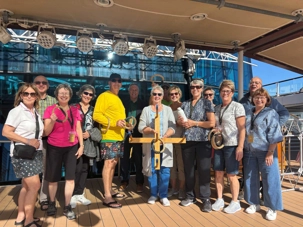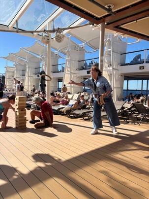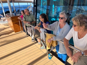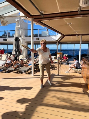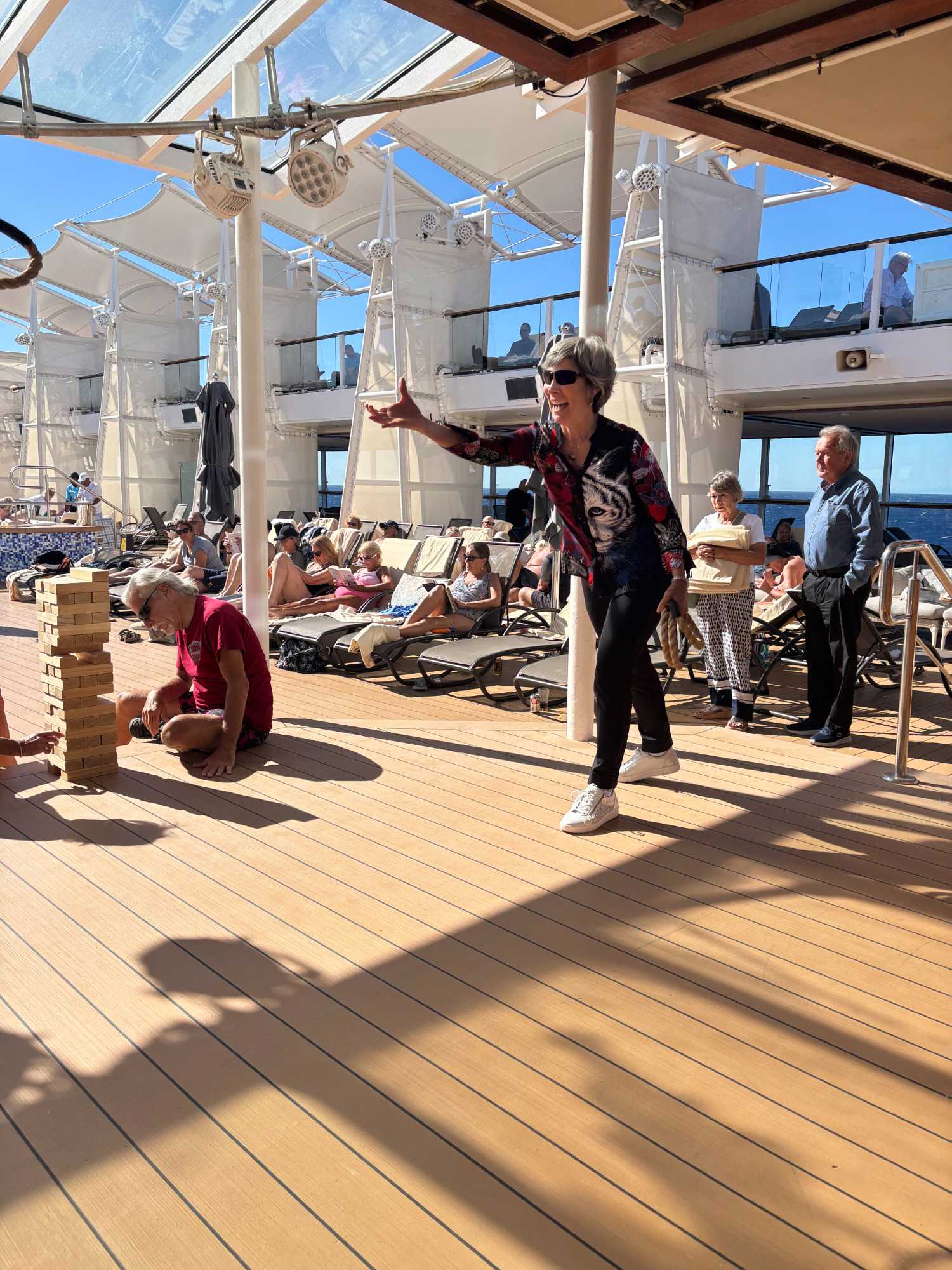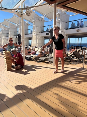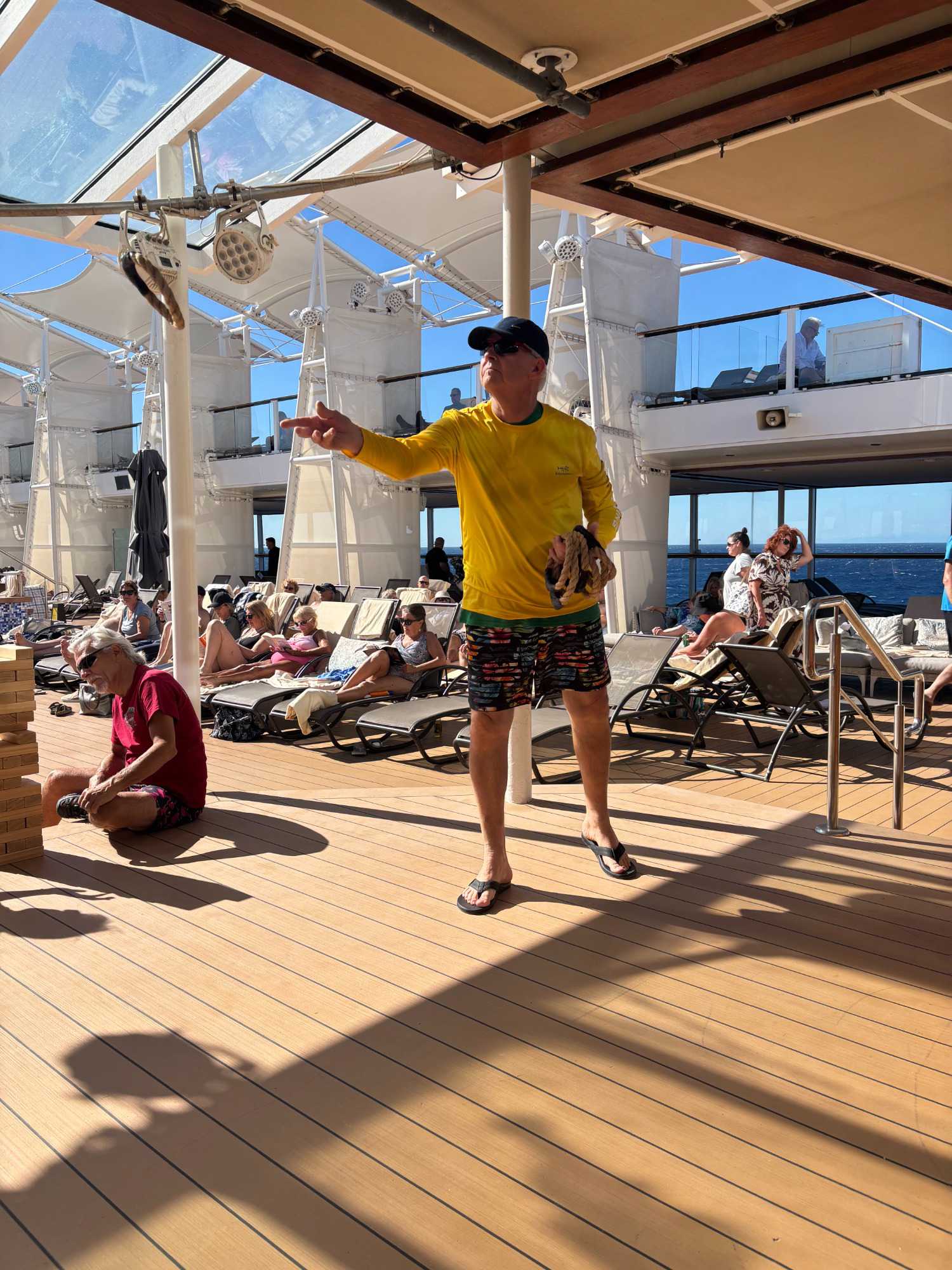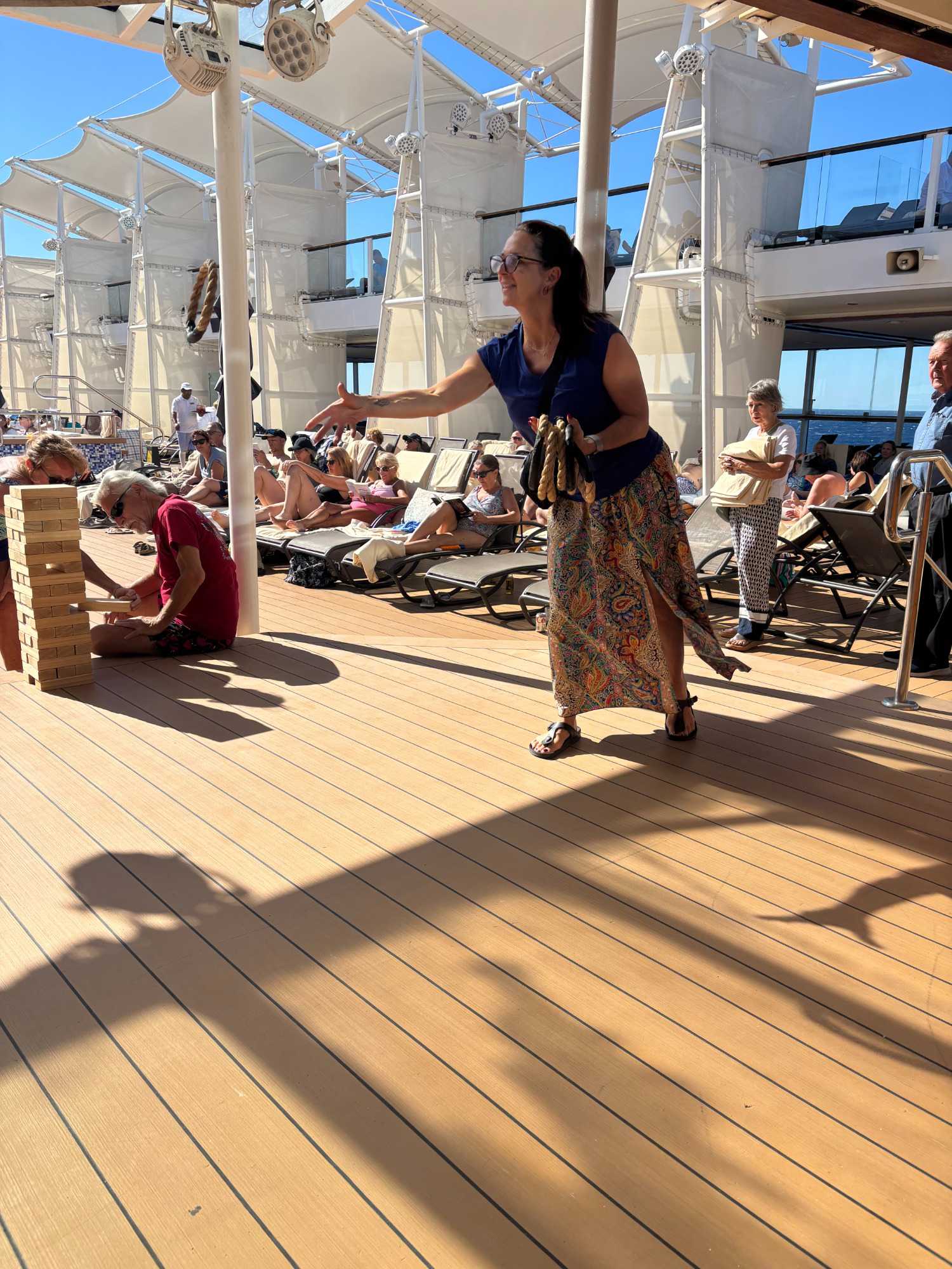 En après-midi, Eric convie ceux qui le veulent à un tournoi amical de jeu d'anneaux près de la piscine! Fou-rires et exclamations foisonnent sous les regards amusés des passagers qui se prélassent à la piscine. Anne-Marie fut notre grande gagnante et se mérite un bouteille réutilisable du marché local de Florence ! Bravo Anne-Marie, nous saurons auprès de qui prendre des conseils pour améliorer notre lancer!