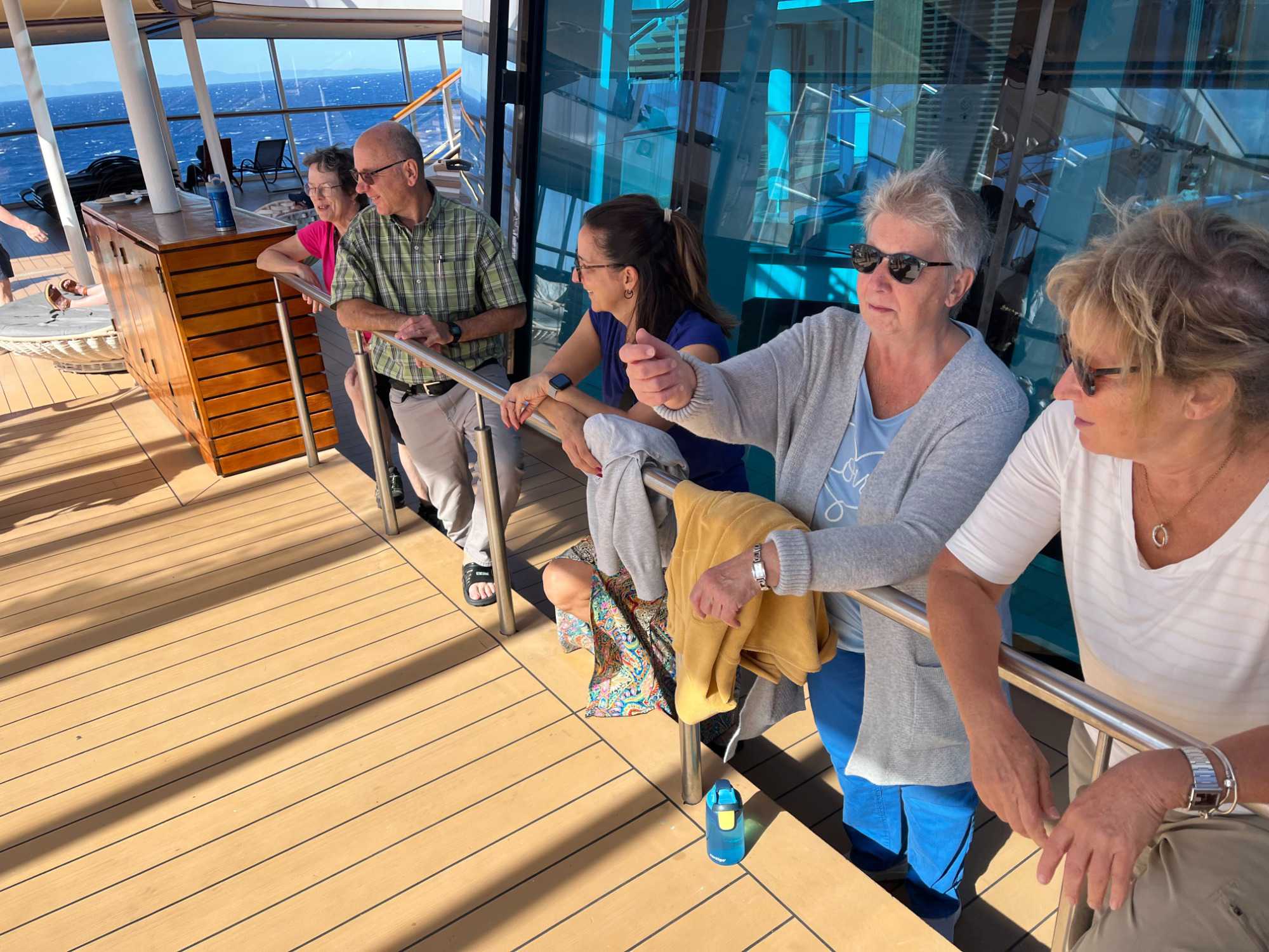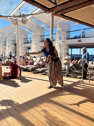 Bon, il faut faire contre mauvaise fortune bon coeur. Comme j’aime souvent dire lorsqu’une situation difficile survient : “Qu’est-ce que ceci a de merveilleux?” Nous aurons une belle journée en mer à profiter d’un navire qui offre une panoplie d’activités, le confort et la belle vie. Le personnel à bord ne ménage aucun effort pour multiplier les activités et divertissements sur notre super hôtel flottant. Une représentation du spectacle fut ajoutée en après-midi. Des démonstrations de toutes sortes (atelier de verre soufflé, de macramé, de cuisine, de jeux animés) ont eu lieu à toute heure sur le navire. Je suis allée chercher des cartes à jouer pour notre groupe et rapidement, une session de Wizard s’est improvisée pour plusieurs au 9e étage. On raconte que le plaisir s’est aussi invité à se joindre à eux. Ce nouveau club de jeu de carte improvisé a fait un marathon de jeu de carte, prolongeant le plaisir jusqu’à 17h30! Wow ! Avec quelques autres, on fait une séance d’échange de photos toute aussi amusante!