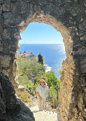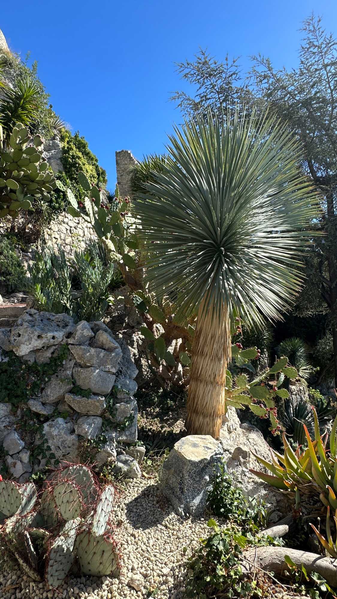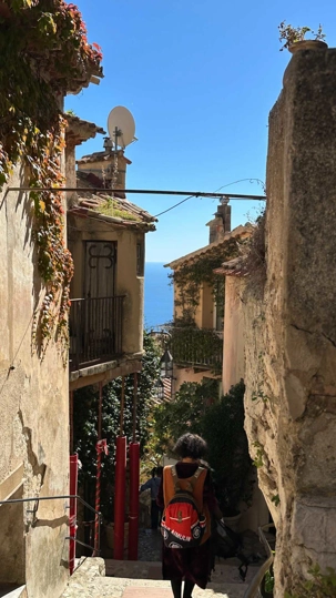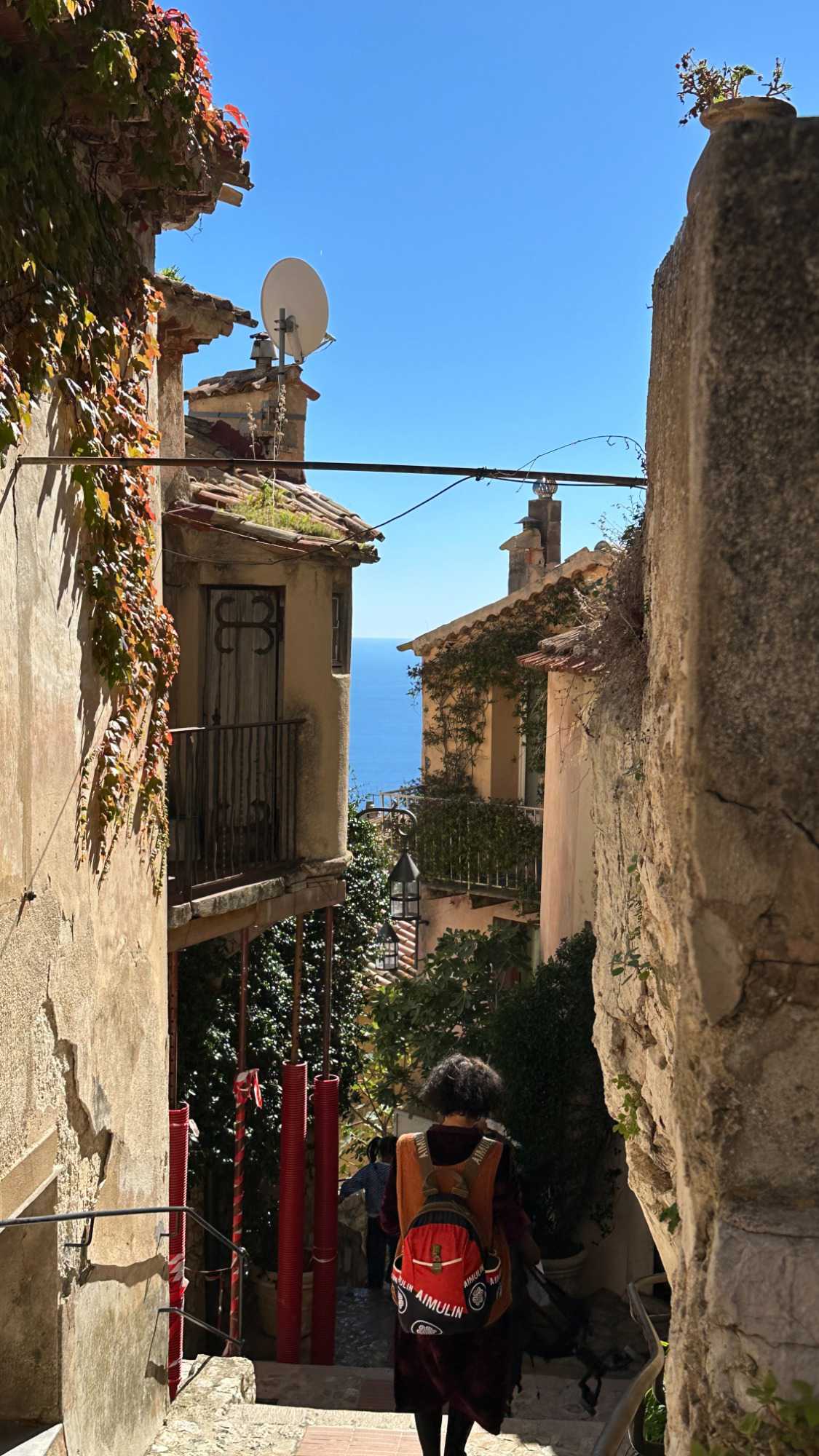 Nous commençons à gravir les marches de la seule voie pour accéder au village d’Èze. Il s’impose du haut de son pic rocheux, ce n’est pas pour rien qu’il est surnommé le « Nid d’Aigle »! À l’entrée de celui-ci, nous voyons sur notre gauche le «Chemin de Nietzche»; c’est au cours de sa montée que le philosophe écrit la dernière partie de « Ainsi parlait Zarathoustra ». Après être passés devant le célèbre Hôtel-Restaurant le « Château de la Chèvre d’Or », l’entrée du village s’ouvre à nous. Les pierres nous parlent de cette période moyenâgeuse où les Ezasques repoussèrent les nombreuses invasions, qui au fil des temps, ont laissé des traces de leurs passages dans les murailles. Ici et là, agrippés aux murs anciens, bougainvilliers, jasmins et rosiers apportent des touches de couleurs et des senteurs enivrantes. Les maisons s’enroulent autour de ce rocher.